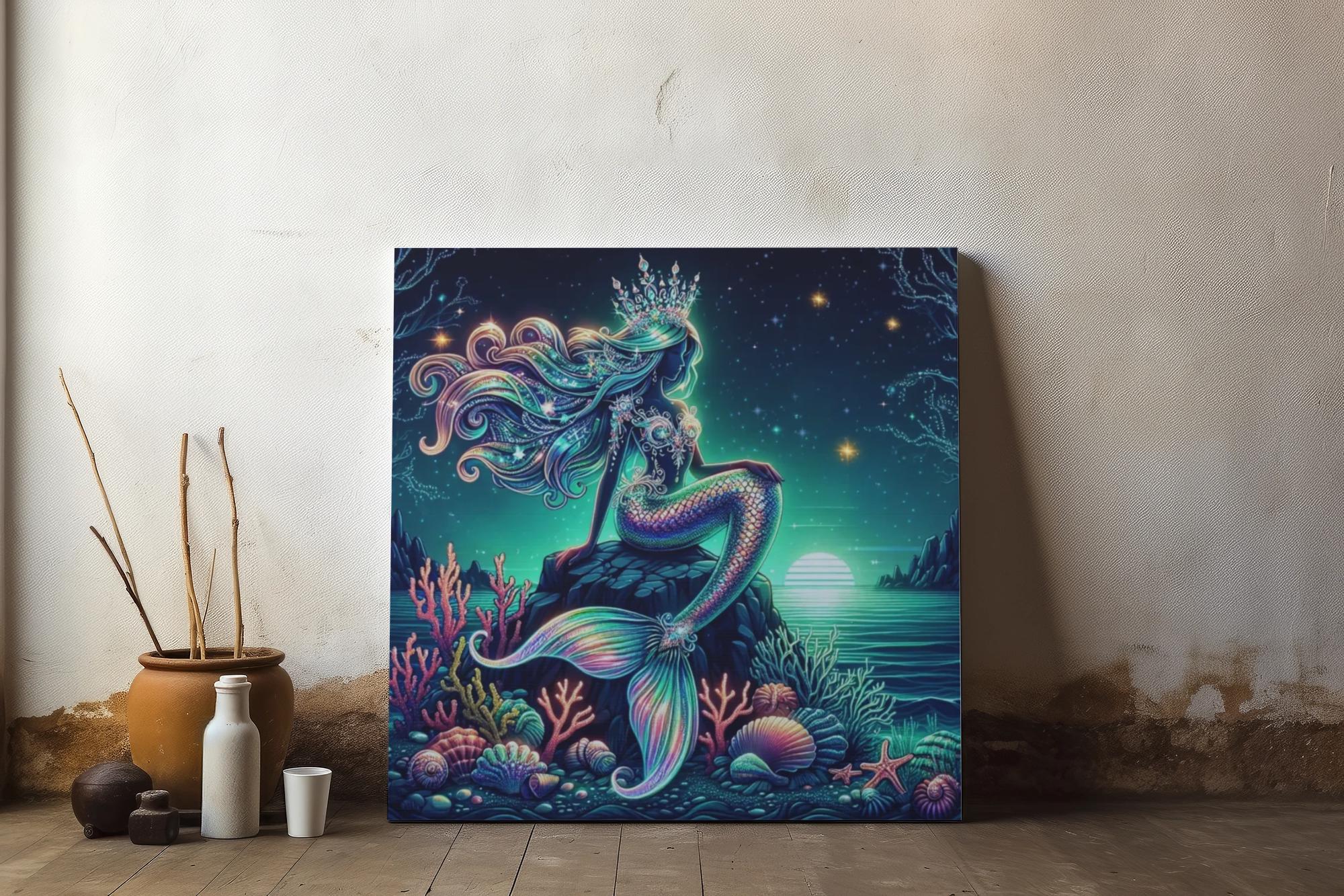 Transform your space with this stunning stretched canvas art piece. Featuring a mesmerizing mermaid amidst vibrant coral and serene ocean waves, this canvas radiates a magical underwater vibe. It's perfect for adding a touch of whimsy to your home or office, evoking feelings of tranquility and creativity. Ideal for art lovers, marine enthusiasts, or anyone looking to enhance their home décor. Celebrate special occasions like birthdays, housewarmings, or any holiday by gifting this captivating piece. Whether hung alone or as part of a gallery wall, it’s sure to become a conversation starter and a source of inspiration.