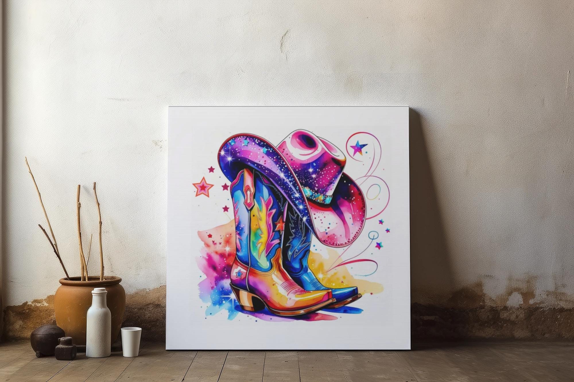 Brighten up your living space with this stunning Matte Canvas, Stretched art piece. Featuring a vibrant, artistic design of colorful cowgirl boots and a cowgirl hat, this canvas brings a lively and cheerful atmosphere into your home. Perfect for a touch of personality in any room, it fits ideally in a cozy den, a playful child's bedroom, or even a modern office. This product resonates with art lovers, country music enthusiasts, and anyone looking to add a pop of color to their decor. Celebrate special occasions such as housewarmings, birthdays, or country-themed parties with this delightful wall art that sparks joy and conversation.