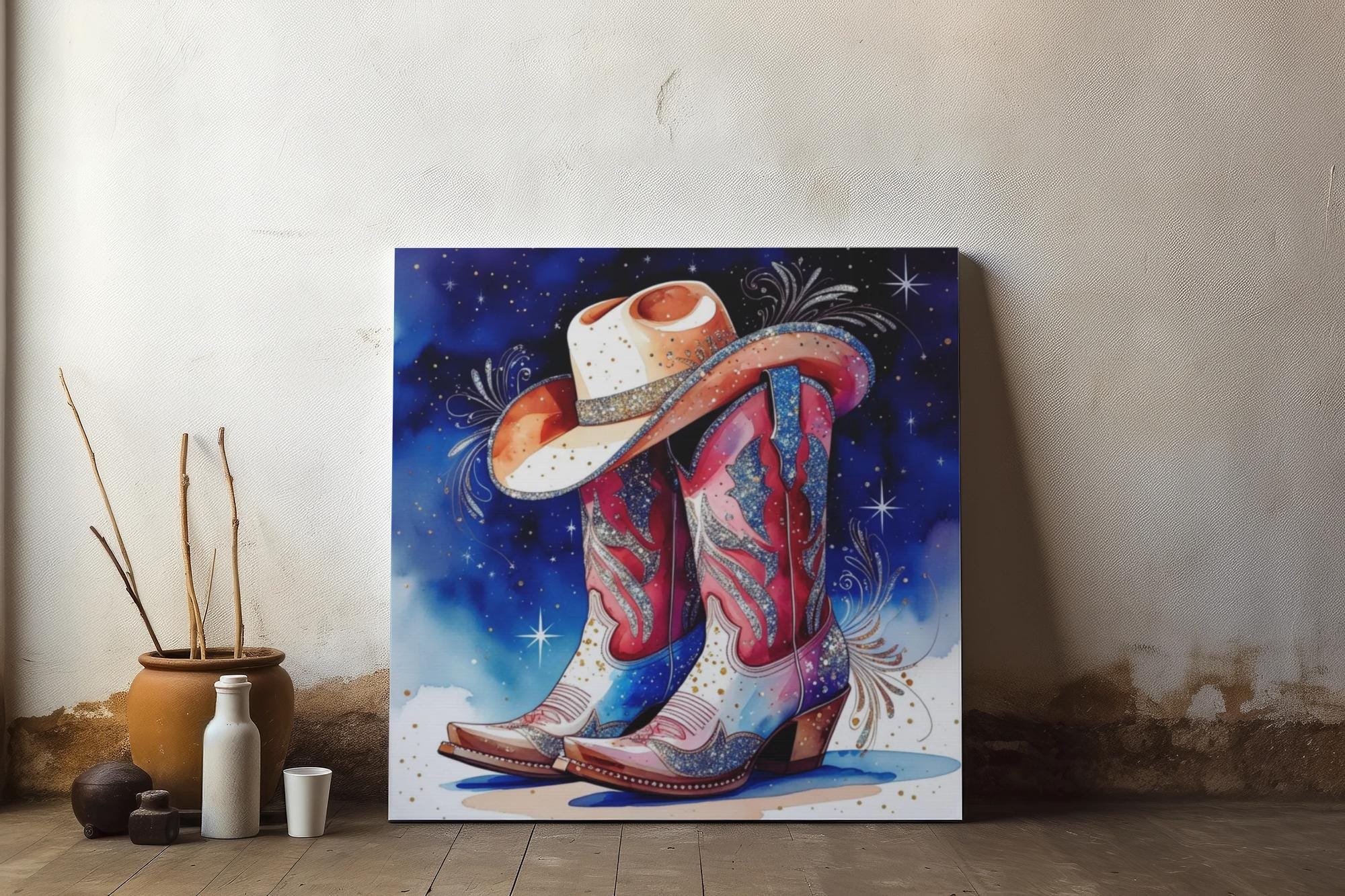 Add a splash of artistic charm to your space with this stunning matte canvas print! Featuring a vibrant illustration of cowgirl boots adorned with a stylish hat set against a starry backdrop, this piece radiates a western vibe that’s both playful and sophisticated. Perfect for a cozy farmhouse-style home or a chic urban apartment, it brings warmth and personality to any room. Ideal for those who appreciate country aesthetics or want to celebrate their love for rodeo culture, this canvas is a fantastic gift for birthdays, housewarmings, or holidays. Transform your living area or office with this striking artwork that speaks to adventure and style!
