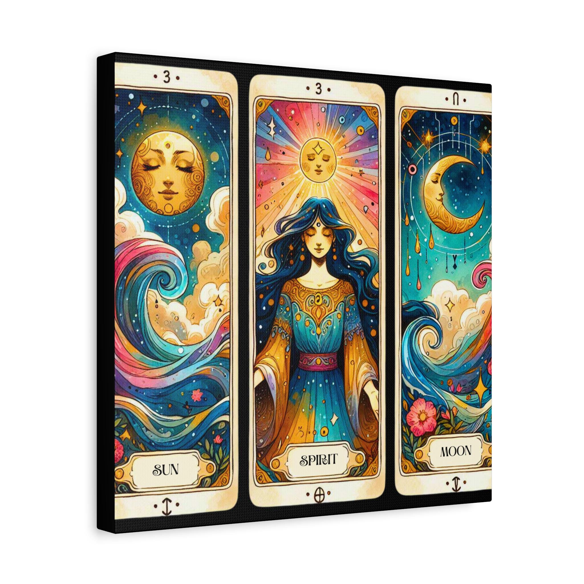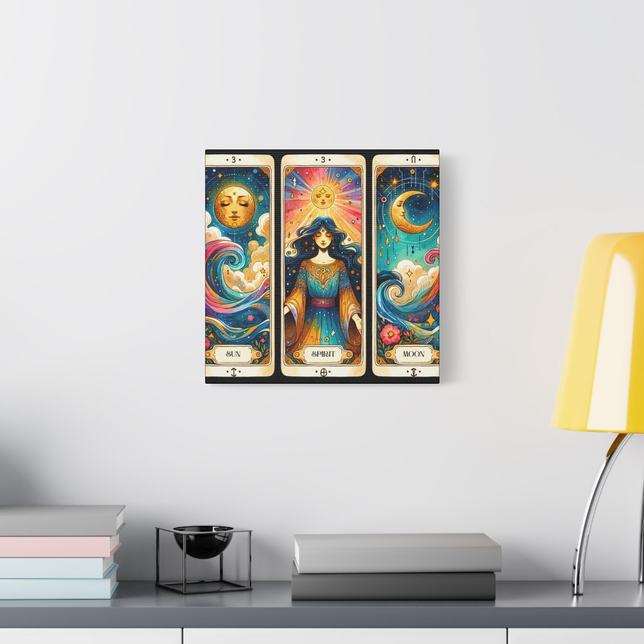 The three panels showcase a diverse range of themes and archetypes, from the celestial and cosmic to the earthly and natural. The overall composition is a captivating blend of color, texture, and symbolic meaning, inviting the viewer to explore the deeper layers of meaning and interpretation within this enchanting work of art.