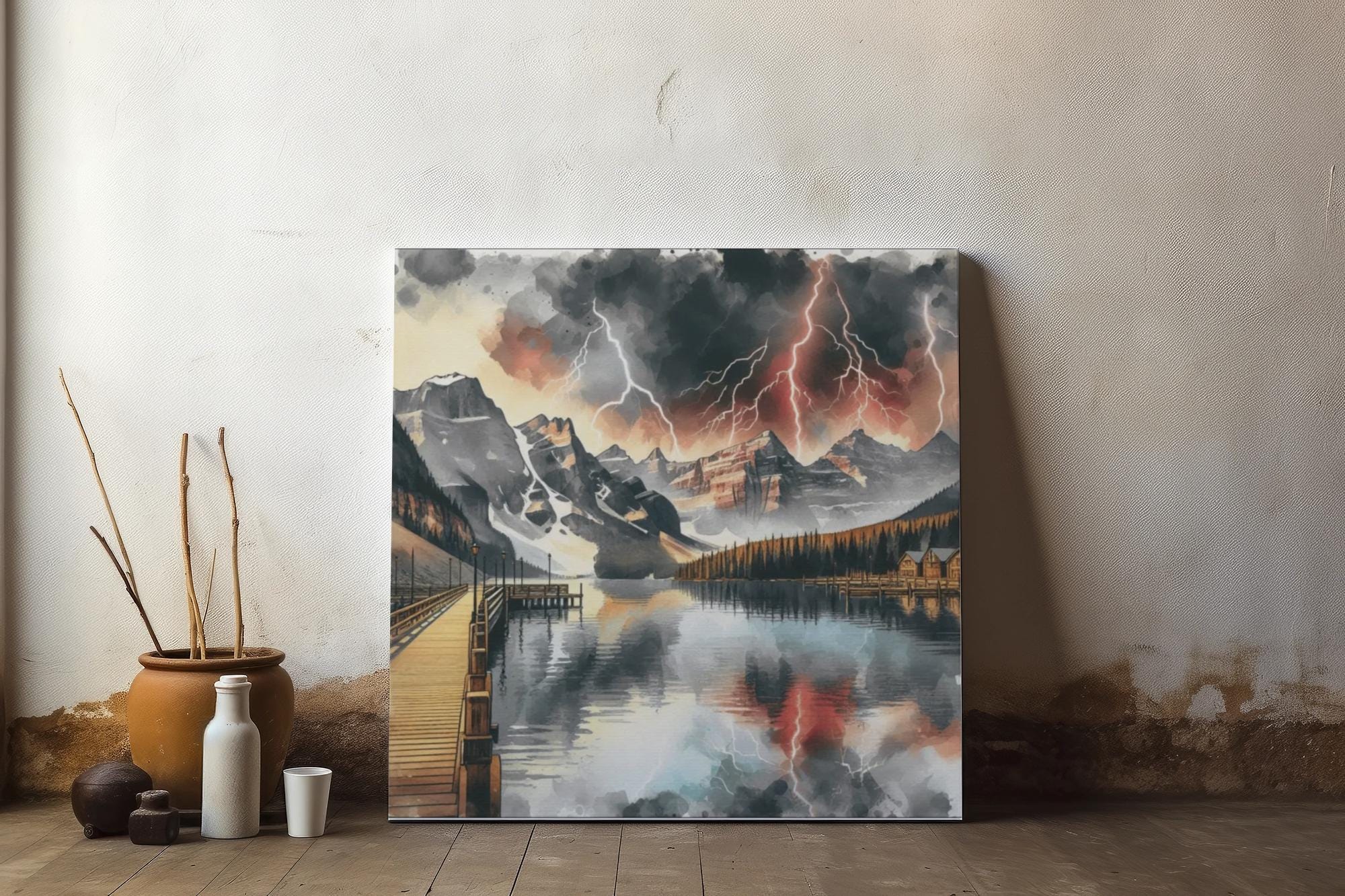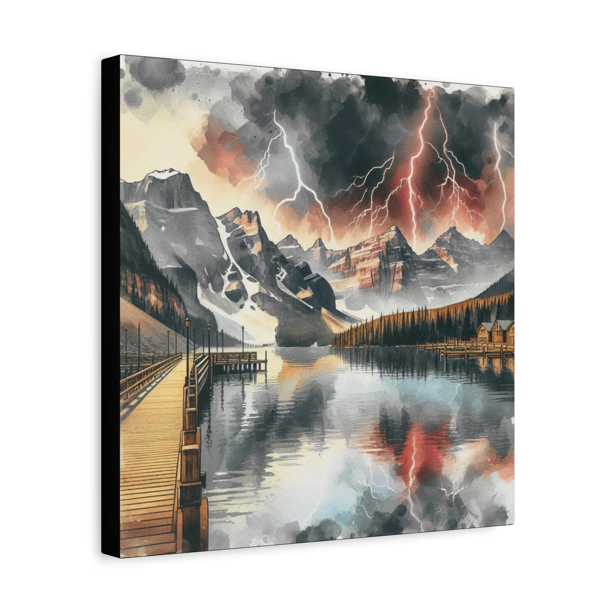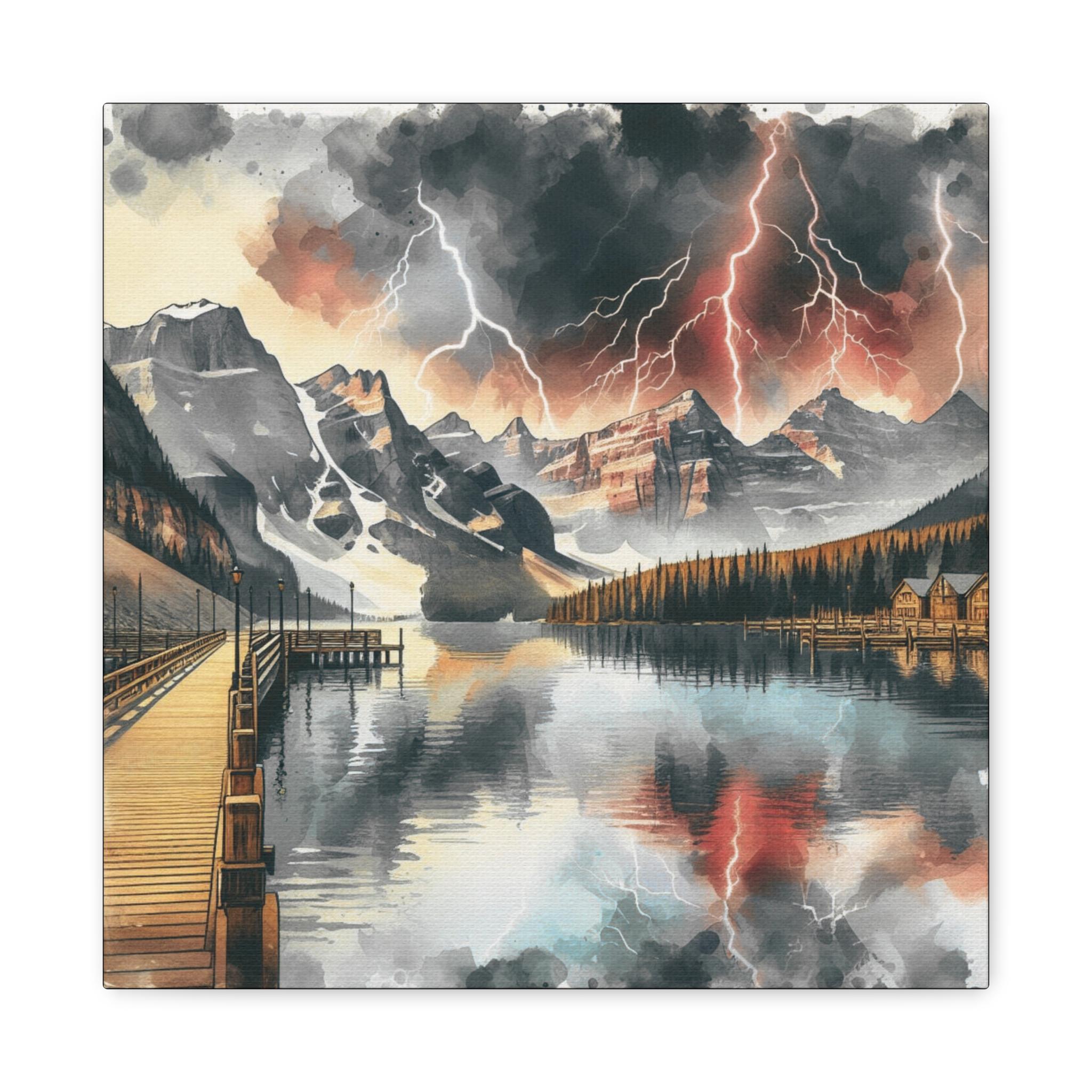 Mountain Lakeshore Canvas Wall Art: Harmonious Weather Elements, Lake House Decor (14x14 Canvas Artwork)