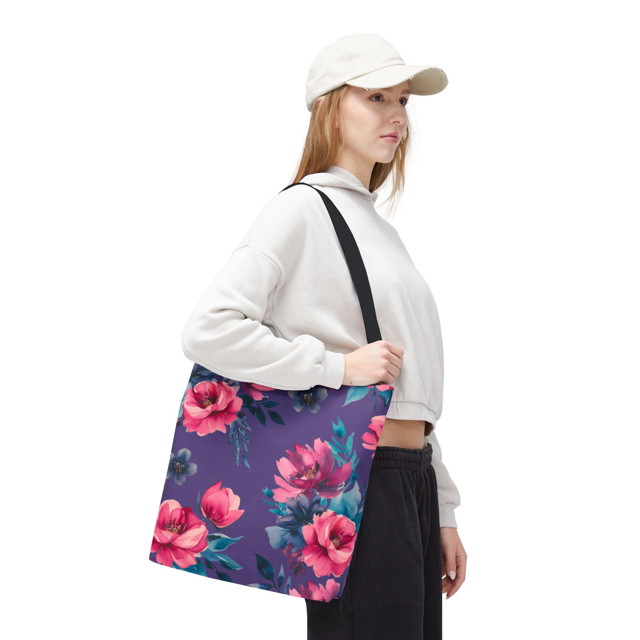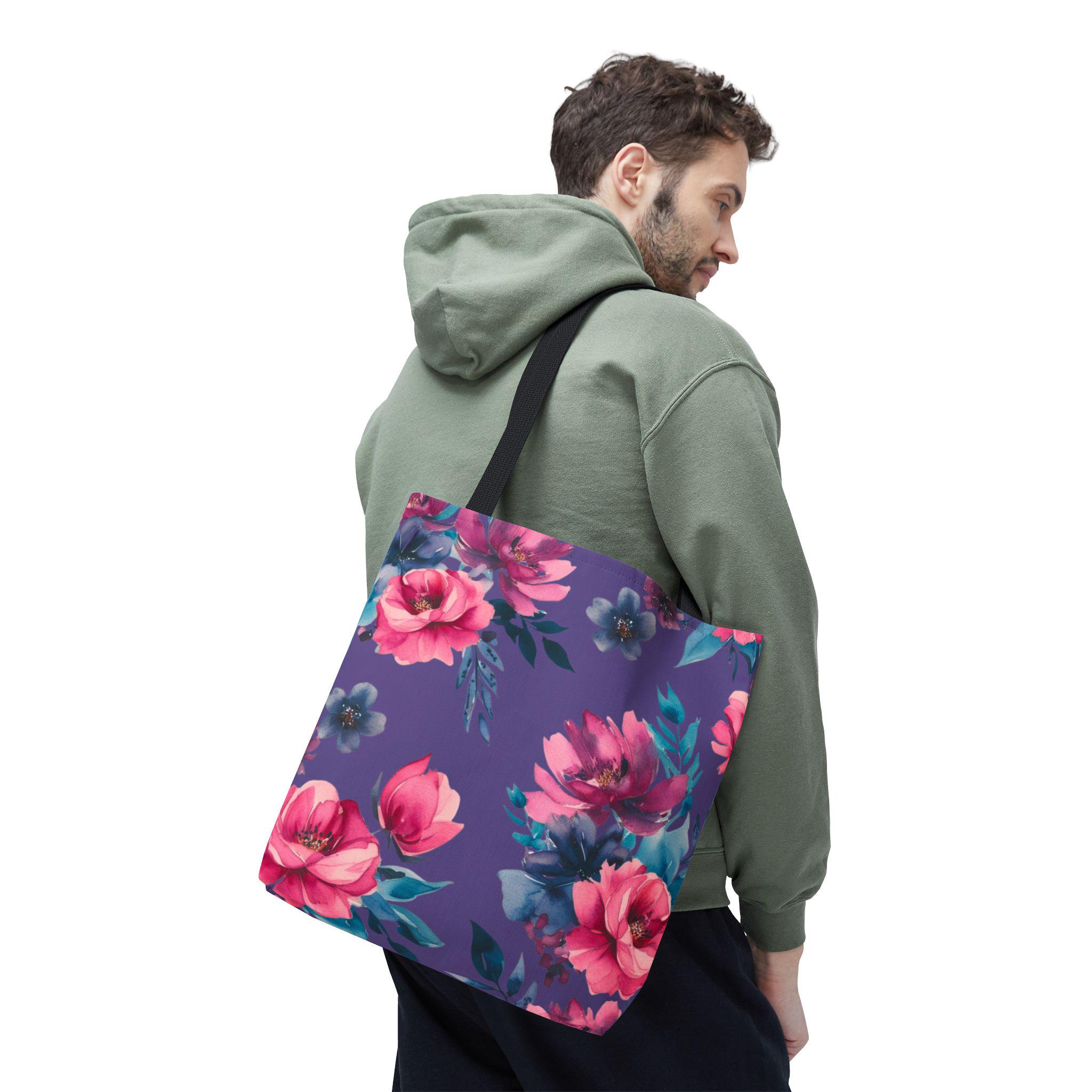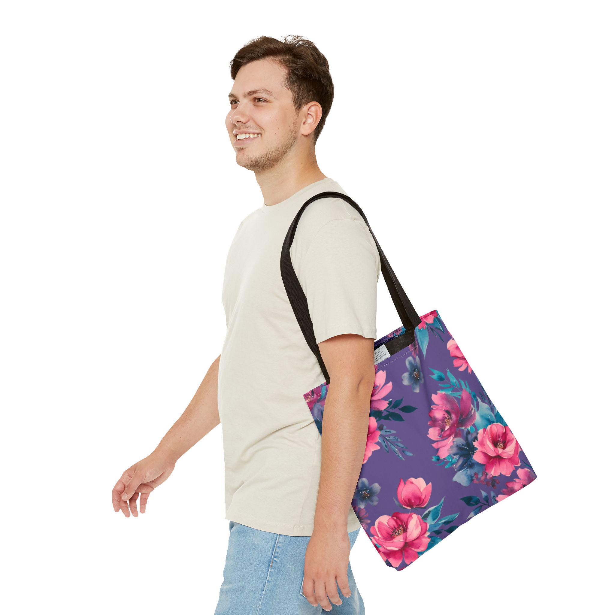 Introducing a vibrant tote bag that brings a touch of nature's beauty to your everyday life. This eye-catching bag features stunning floral patterns set against a deep purple background, adding a playful yet elegant vibe to your outings. Perfect for farmers' markets, beach days, or casual outings, it combines style and functionality effortlessly. Ideal for fashion enthusiasts, environmentally conscious shoppers, or anyone needing a reliable bag to carry their essentials. Celebrate occasions like Mother's Day, birthdays, or just treat yourself to a functional accessory that suits any season and enhances your look with flair.