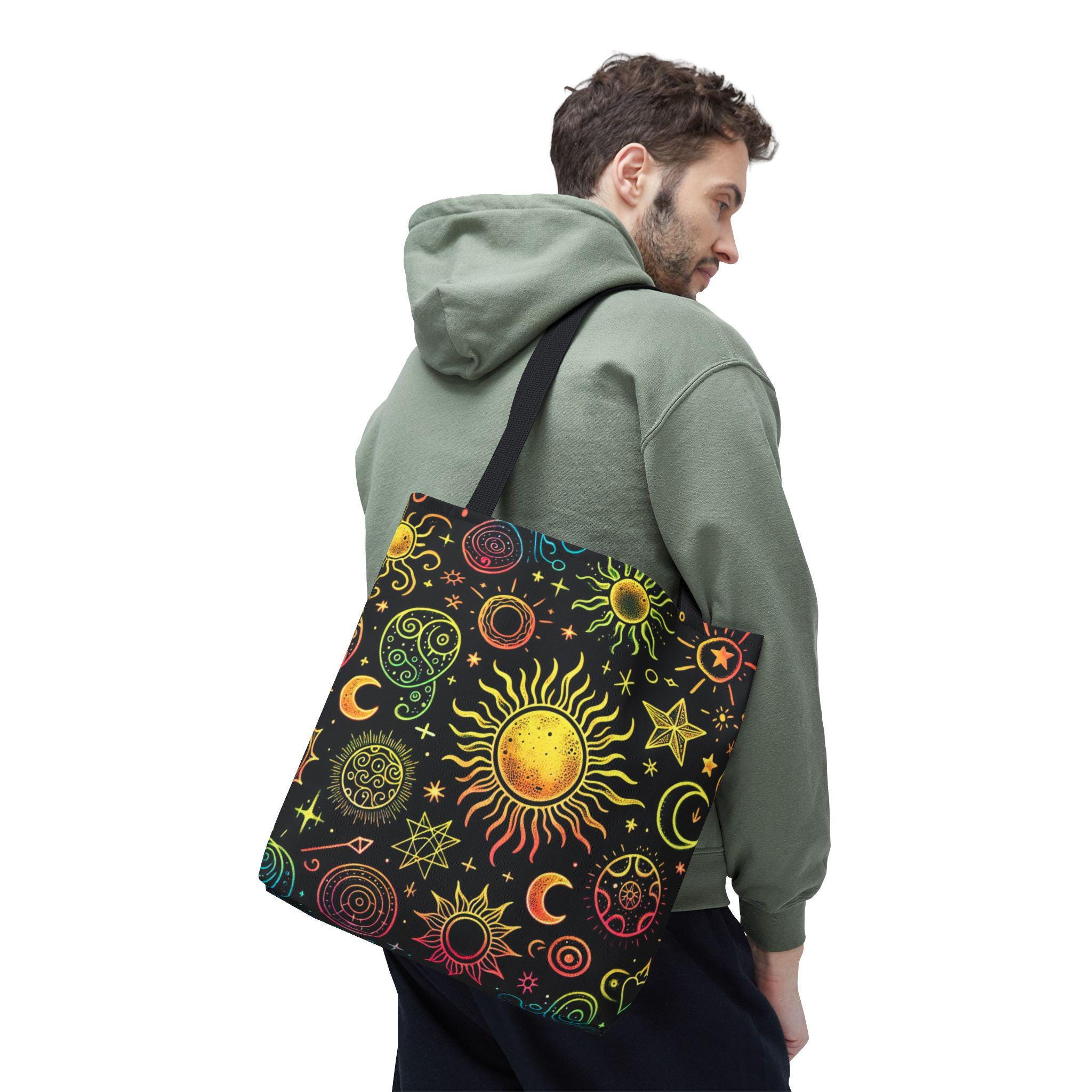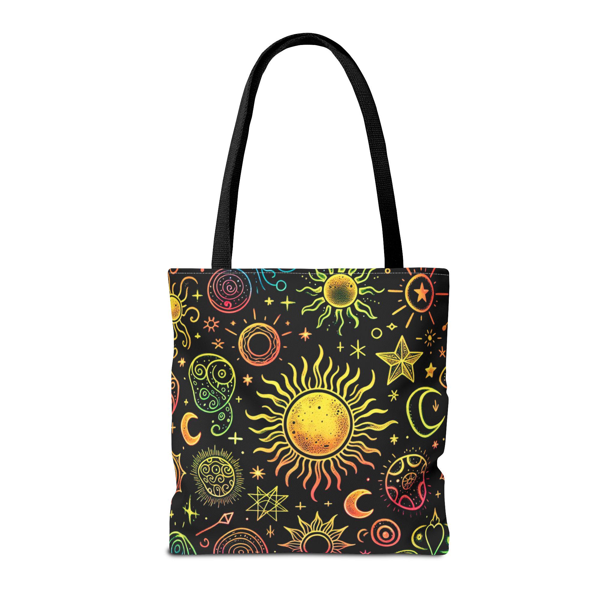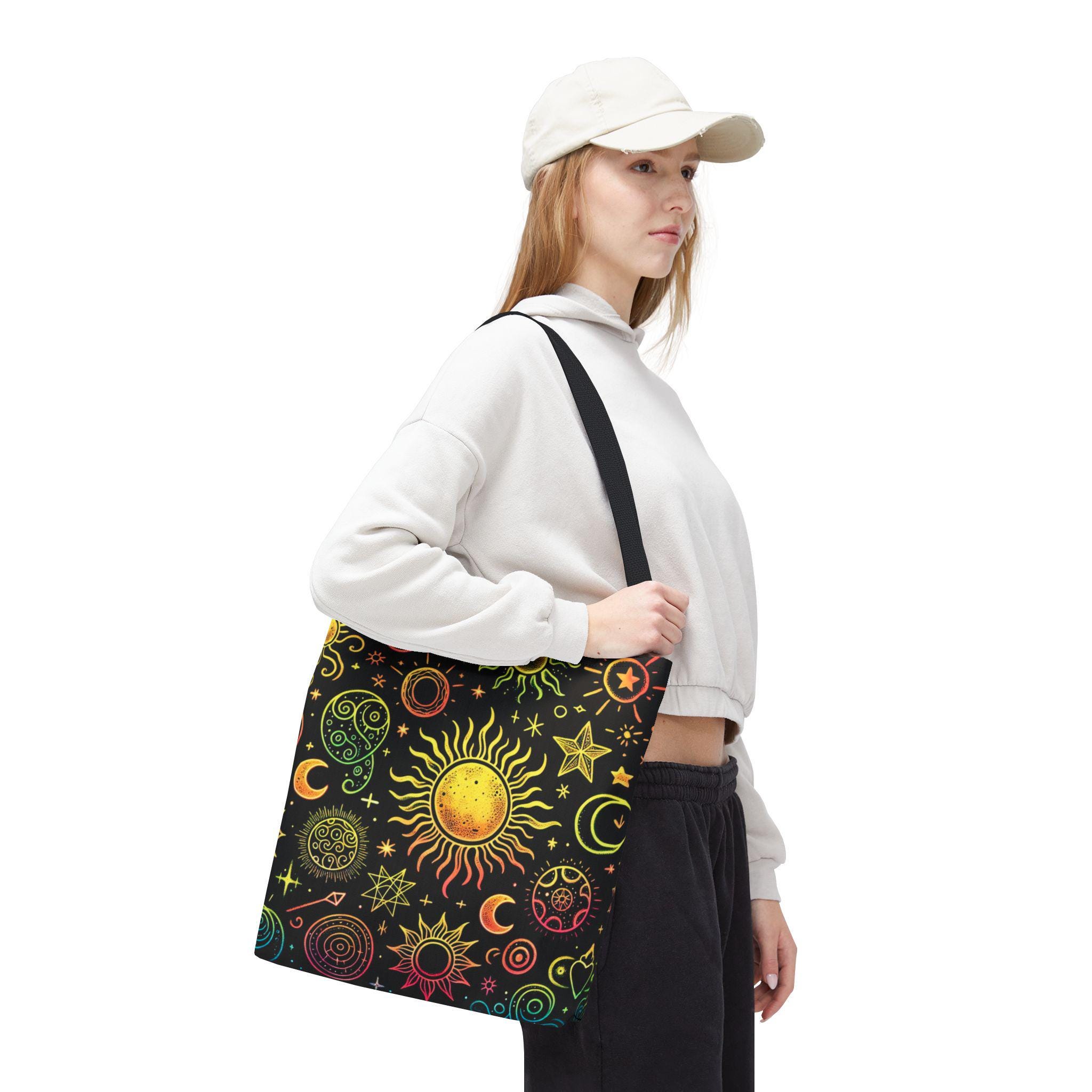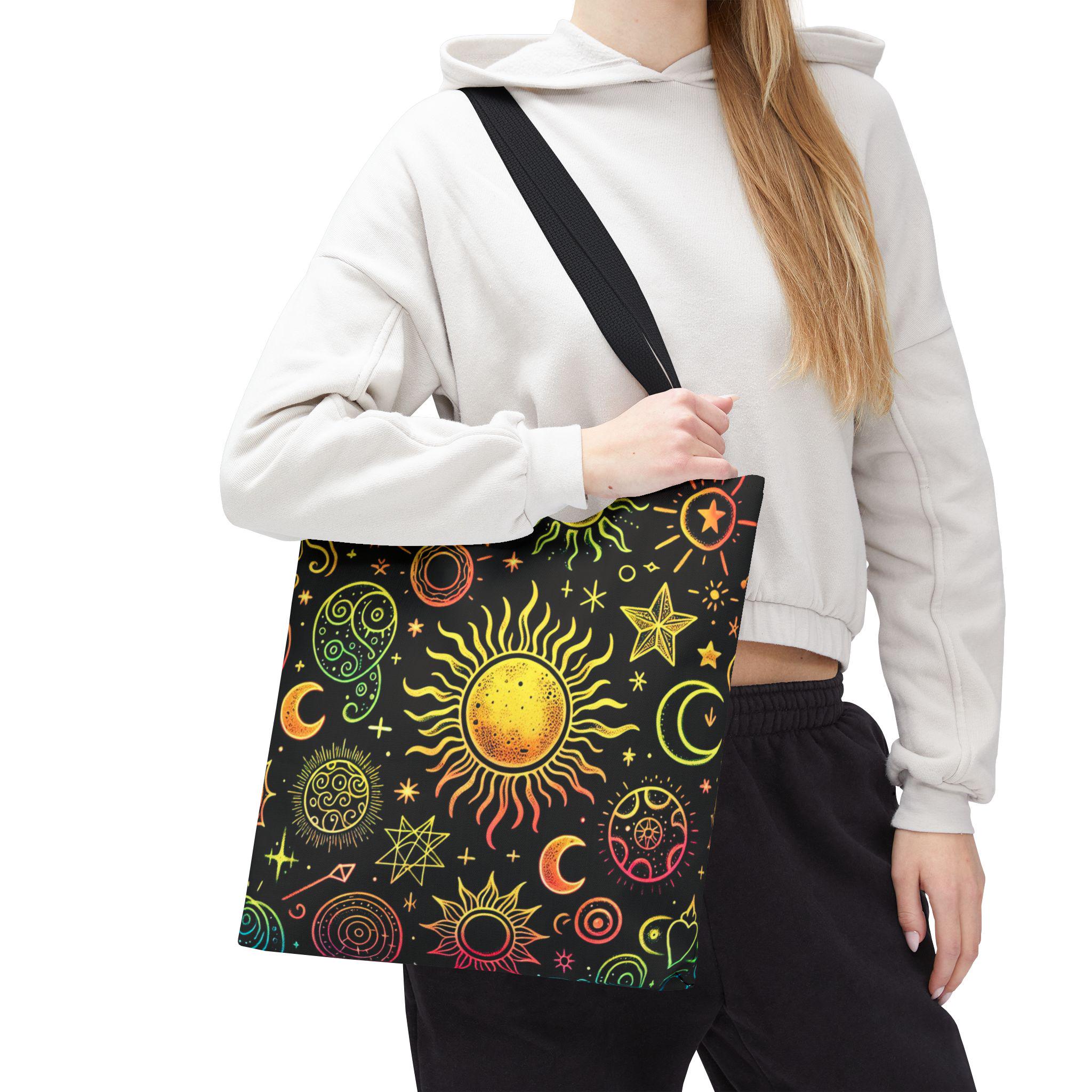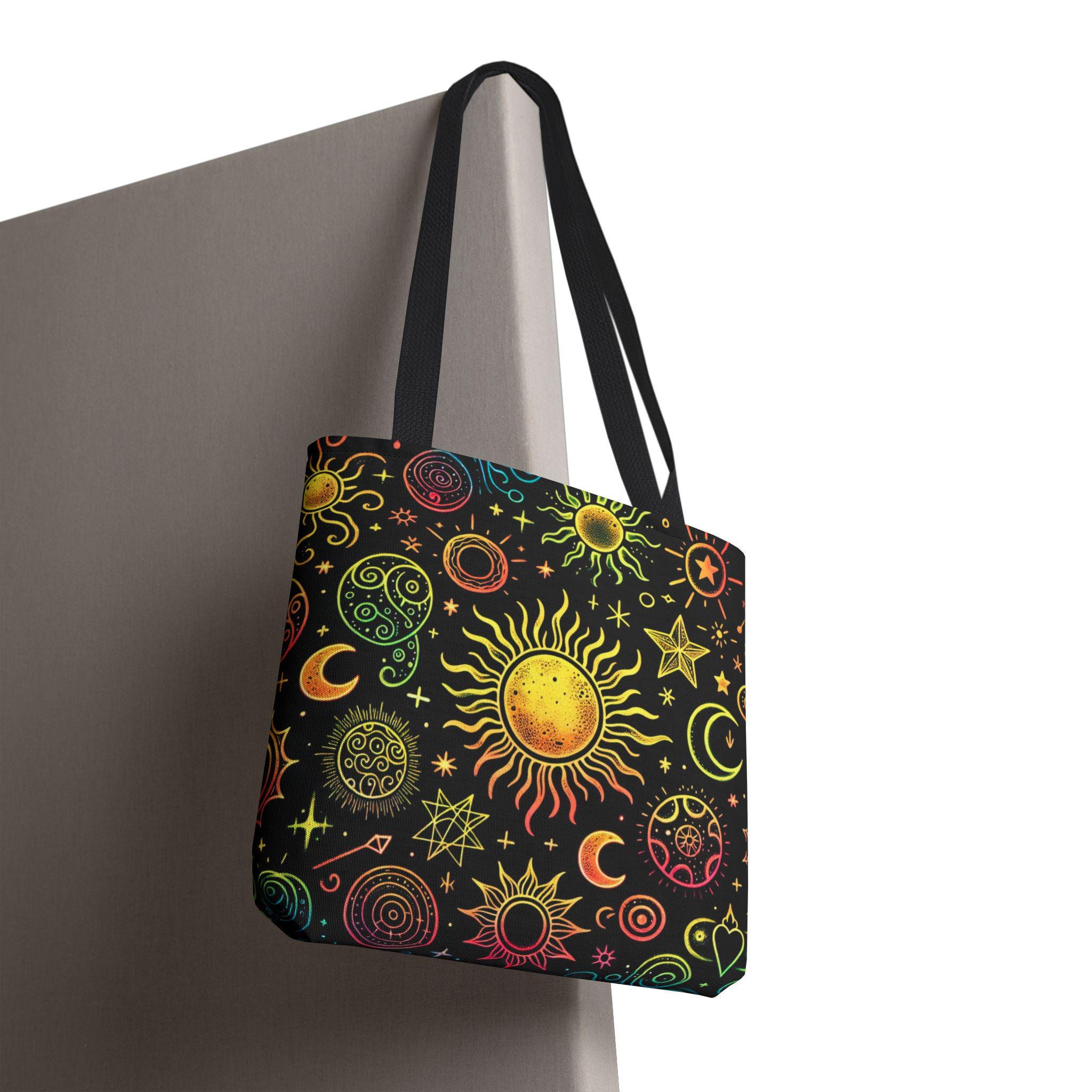 This vibrant Tote Bag is perfect for those who love to express their unique style. Featuring a captivating design of celestial motifs, this bag radiates positive energy and creativity. Whether you’re heading to the market, beach, or out with friends, this tote adds a splash of color to your everyday adventures. It's an ideal accessory for art lovers, astrology enthusiasts, or anyone who enjoys standing out. Great for birthdays, festivals, or just as a cheerful everyday bag, it makes a thoughtful gift for those who appreciate artistry and individuality.