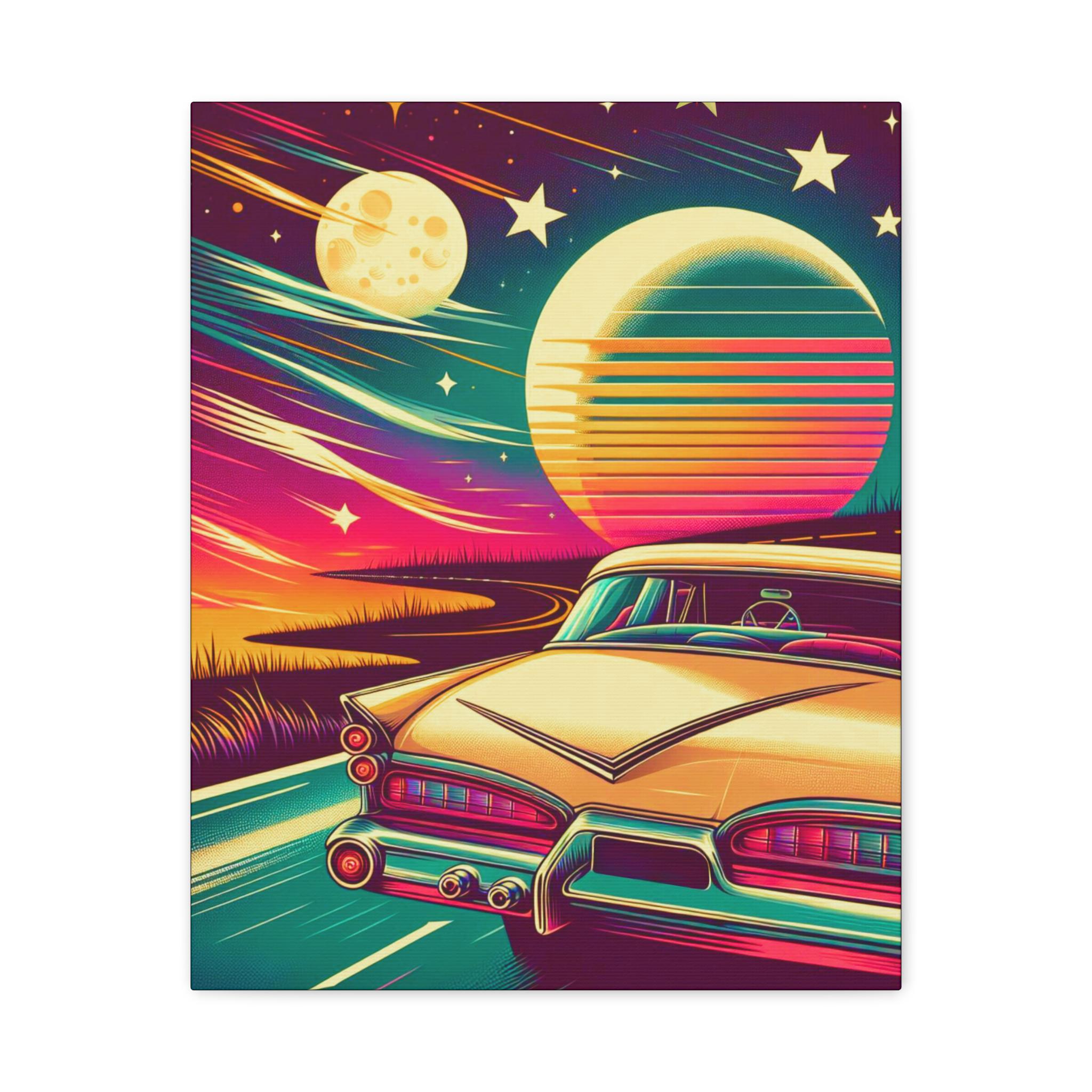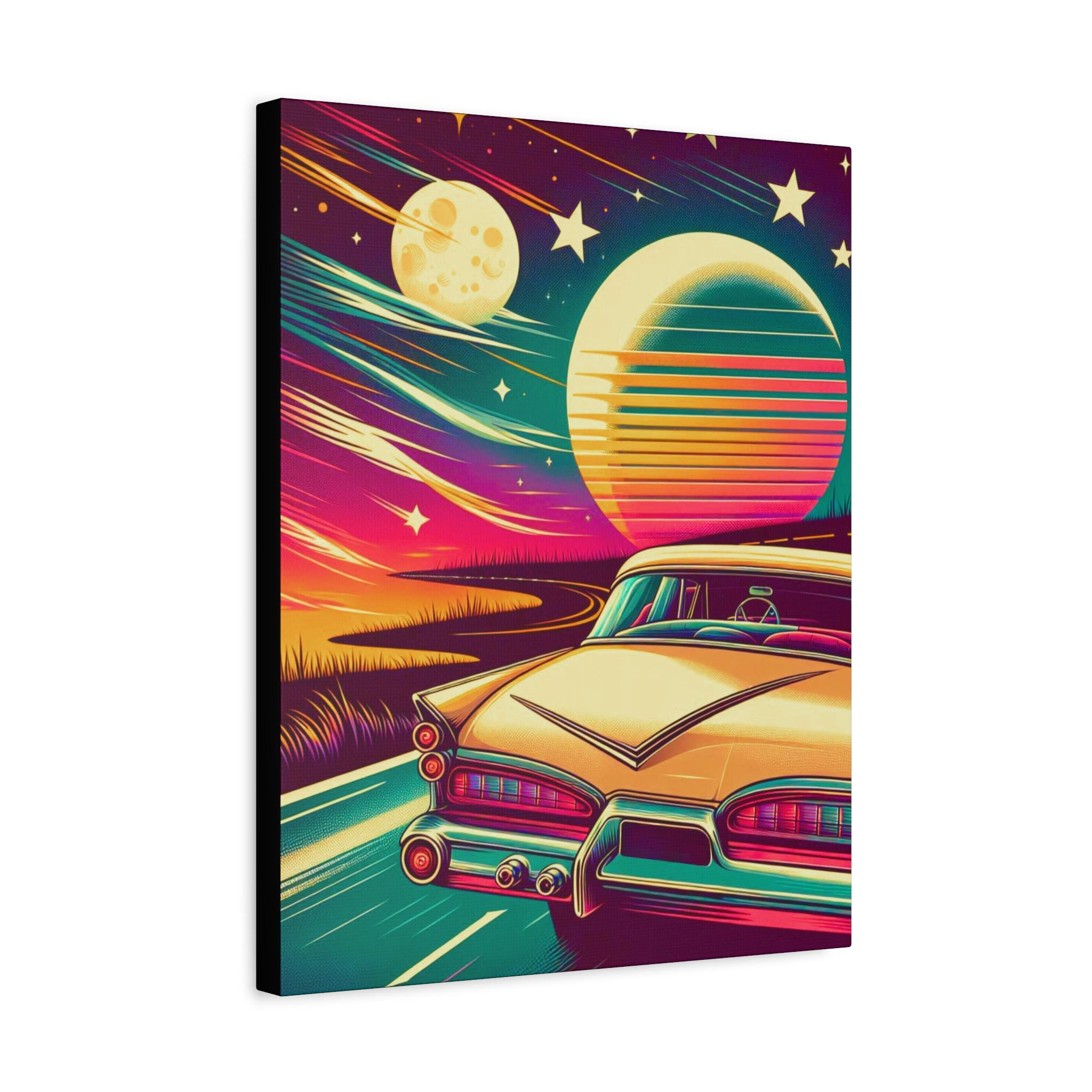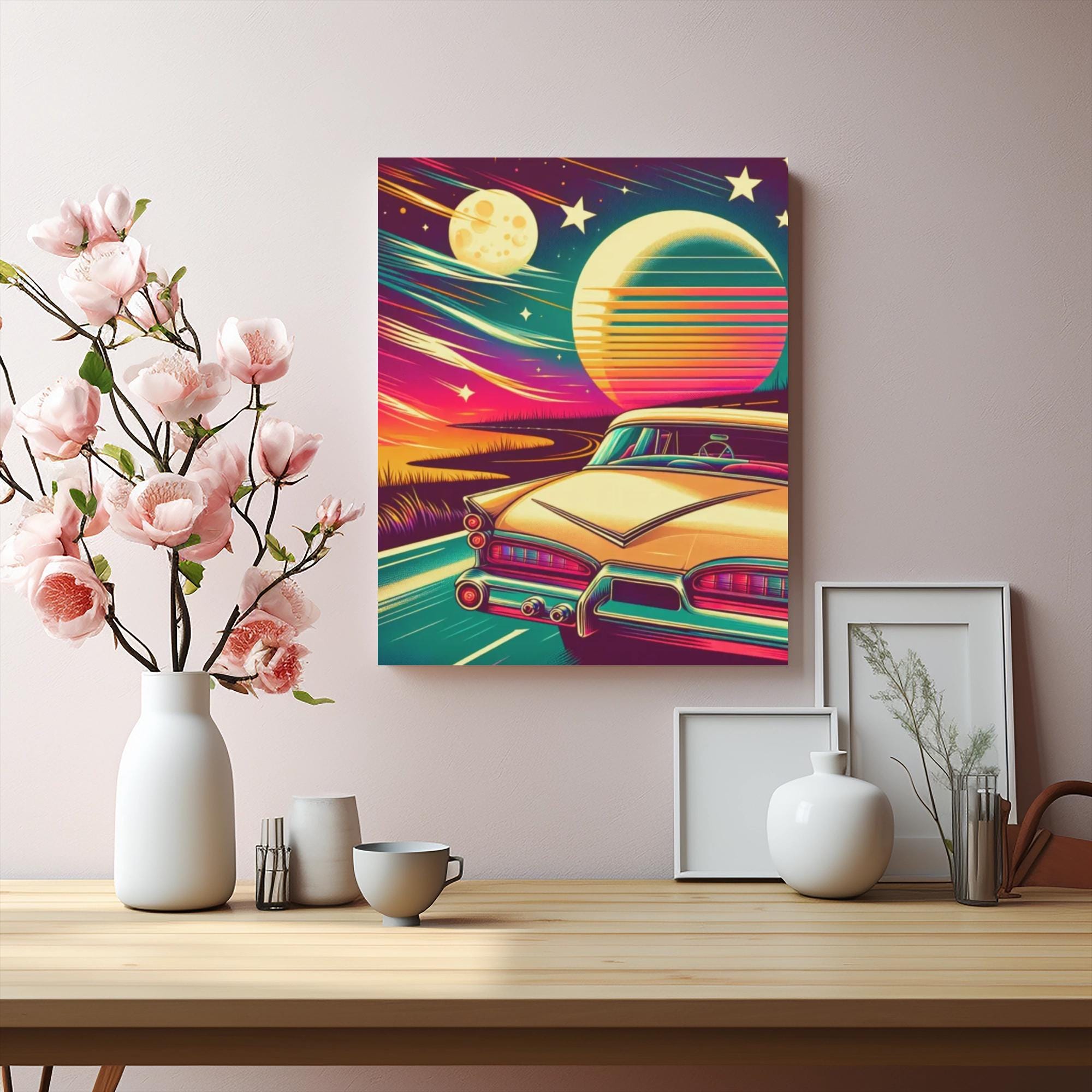 Transform your living space with this stunning Stretched Canvas that captures a vibrant, nostalgic vibe. Featuring a beautifully illustrated retro car against a cosmic backdrop, this artwork brings a touch of whimsy and warmth to any room. Perfect for enthusiasts of vintage aesthetics, it serves as a fantastic conversation starter or a thoughtful gift for loved ones. Ideal for home décor, it fits seamlessly into any setting, whether it's your living room, bedroom, or office. This canvas makes a delightful gift for holidays, celebrations, or special occasions like anniversaries or housewarmings, adding a splash of creativity to your interiors.