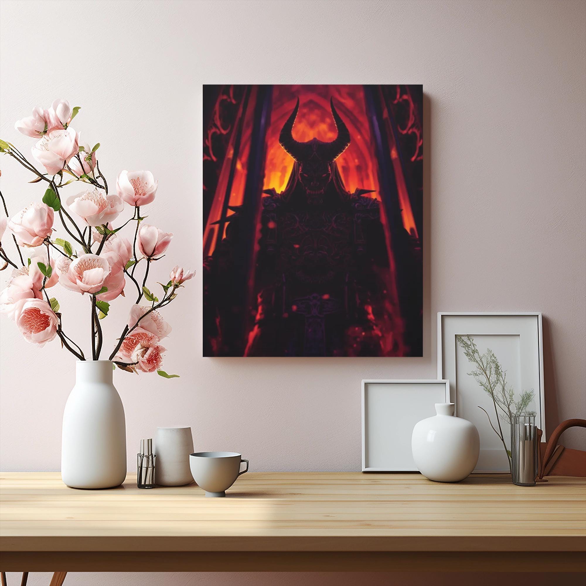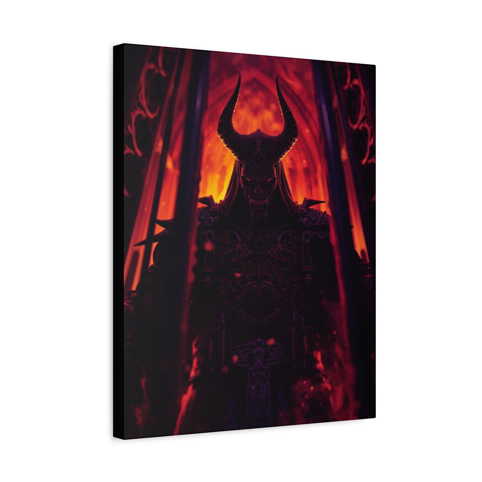 Step into the realm of the mysterious with this striking matte canvas featuring a dark, horned figure standing amidst a fiery gothic landscape. With glowing eyes and intricately detailed armor, this artwork evokes themes of fantasy, mythology, and the supernatural. Perfect for lovers of horror, mysticism, or bold statement pieces, it adds a dramatic edge to any space. Ideal for Halloween décor, spiritual sanctuaries, or as a unique gift for those drawn to the darker side of beauty.