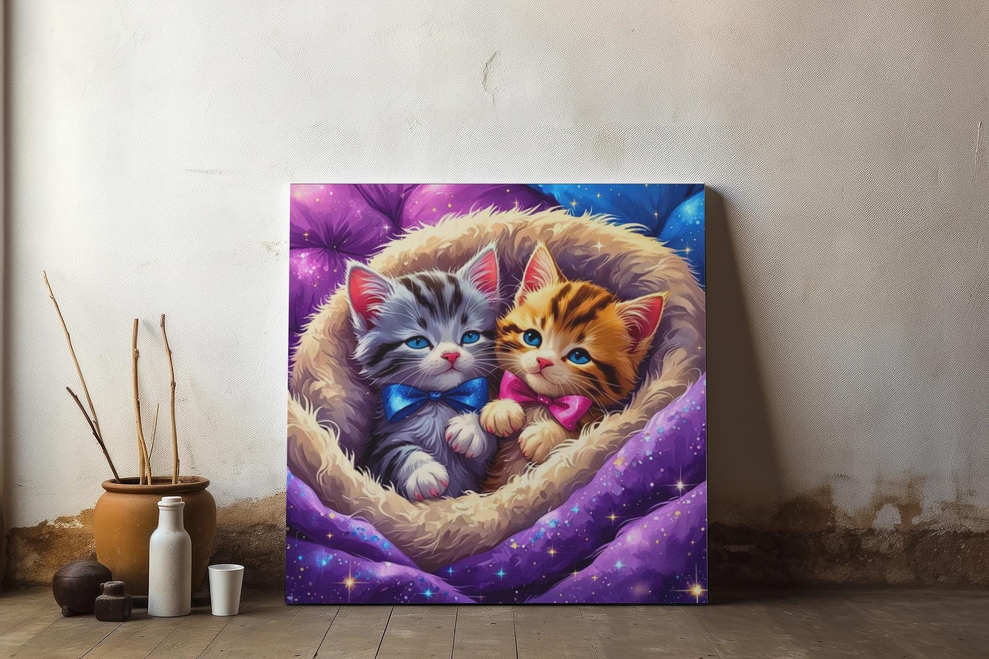 This stunning Matte Canvas brings a burst of joy into any space with its vibrant depiction of adorable kittens, whose charming expressions are sure to warm hearts. Perfect for cat lovers or anyone who appreciates whimsical art, this piece adds a playful touch to your home decor. Its soft colors and dreamy background create a soothing atmosphere, making it suitable for living rooms, nurseries, or cozy reading corners. Ideal as a unique gift for birthdays, housewarmings, or any occasion where you want to spread happiness, this canvas is a delightful addition to any environment, celebrating the magic of companionship and comfort.