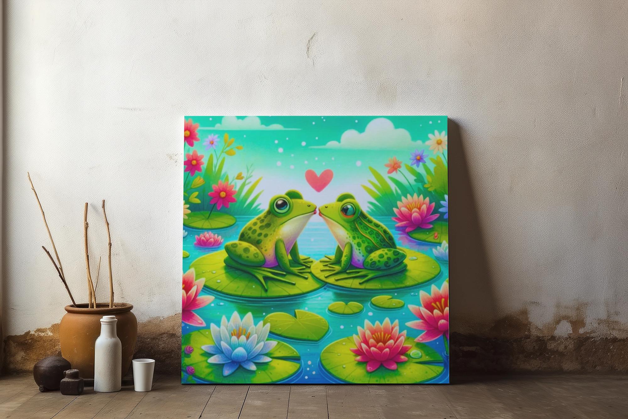 Introducing our stunning Matte Canvas that adds a vibrant and playful touch to any space. This artwork features a delightful scene of two frogs sharing a tender moment amidst beautiful water lilies. The bright colors and joyful imagery create a warm and inviting atmosphere, perfect for brightening up living rooms, nurseries, or creative workspaces. Ideal for nature lovers, this piece resonates with anyone who appreciates whimsy and charm in their decor. It makes a perfect gift for housewarmings, birthdays, or even as a thoughtful gesture for anniversaries, injecting joy and color into your loved ones' lives. Celebrate love and nature with this enchanting canvas that brings a smile wherever it's displayed!