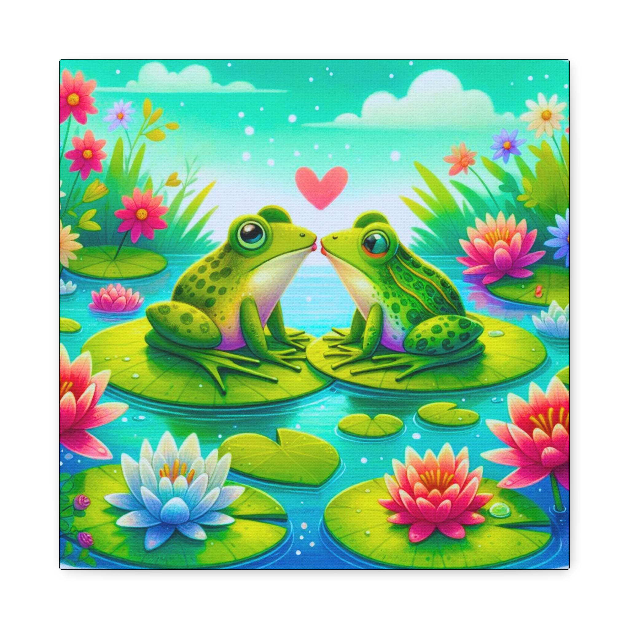 Introducing our stunning Matte Canvas that adds a vibrant and playful touch to any space. This artwork features a delightful scene of two frogs sharing a tender moment amidst beautiful water lilies. The bright colors and joyful imagery create a warm and inviting atmosphere, perfect for brightening up living rooms, nurseries, or creative workspaces. Ideal for nature lovers, this piece resonates with anyone who appreciates whimsy and charm in their decor. It makes a perfect gift for housewarmings, birthdays, or even as a thoughtful gesture for anniversaries, injecting joy and color into your loved ones' lives. Celebrate love and nature with this enchanting canvas that brings a smile wherever it's displayed!