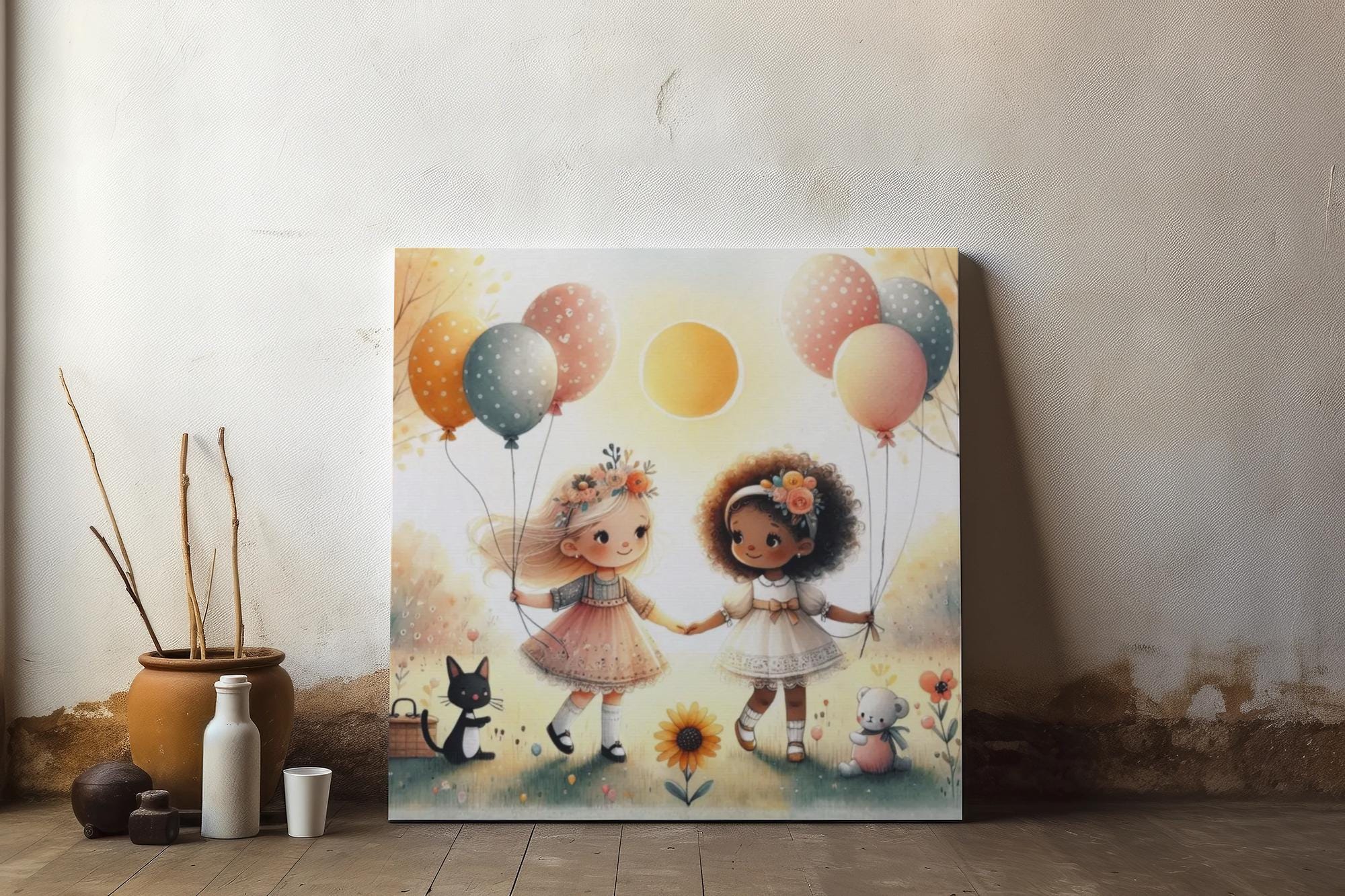 Add a touch of whimsy and warmth to your home with this delightful canvas. Featuring two cheerful girls holding balloons in a sunny, pastel-colored setting, this stretched canvas effortlessly enhances any space with a sense of joy and nostalgia. Perfect for children's rooms, playrooms, or any area that could use a bit of magic, this vibrant artwork brings a sense of connection and celebration. Ideal for baby showers, birthdays, or as a unique gift for parents-to-be, it resonates with anyone wanting to create an uplifting atmosphere. Celebrate love, friendship, and childhood memories with this beautiful piece.