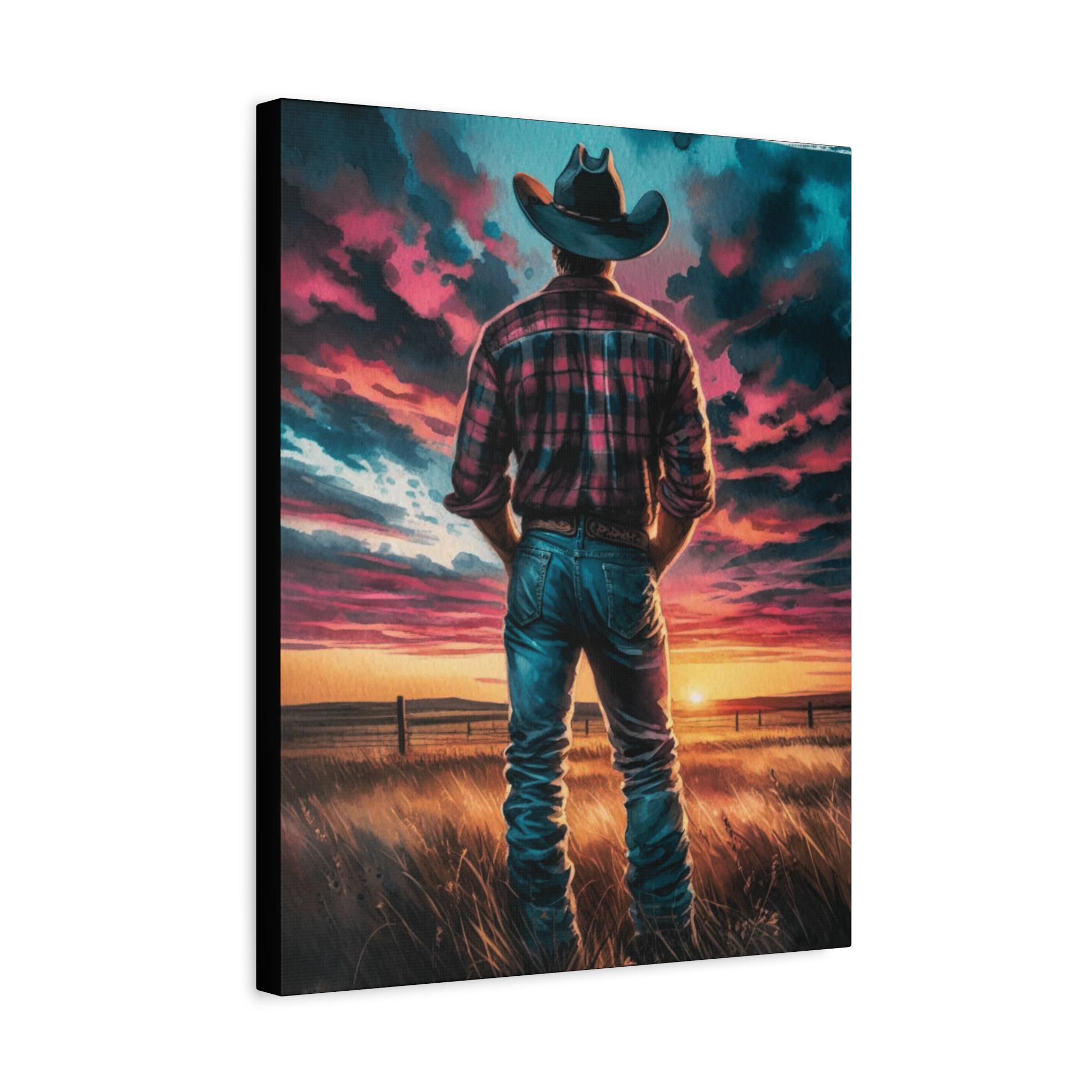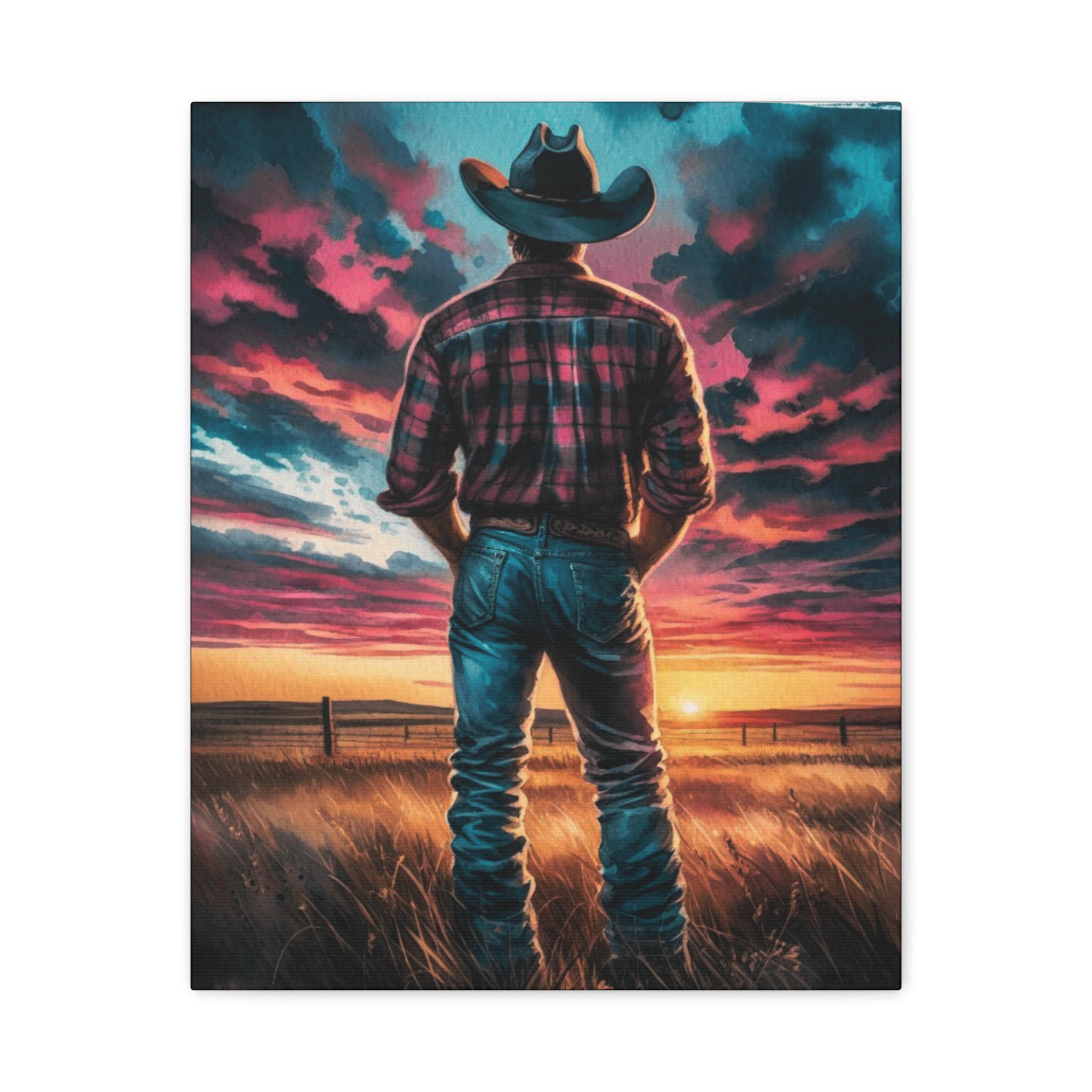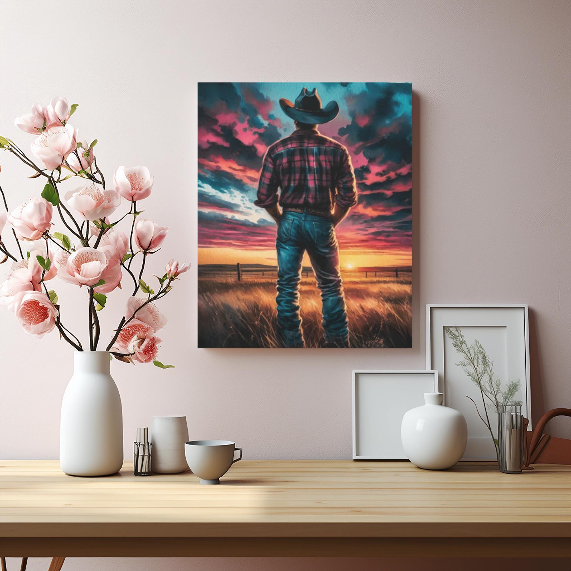 Step into a moment of quiet reflection with Last Light on the Prairie, a striking canvas that captures the soul of the American West. A lone figure in a cowboy hat gazes toward a blazing sunset, framed by tall grass and a weathered fence—evoking solitude, resilience, and the beauty of wide-open spaces. The vivid hues of pink, orange, and indigo swirl across the sky, making this piece a bold statement for any room. Whether you're decorating a rustic lodge, cozy farmhouse, or modern space craving warmth, this artwork brings a touch of wild serenity. Perfect for lovers of western charm or anyone chasing golden-hour dreams.