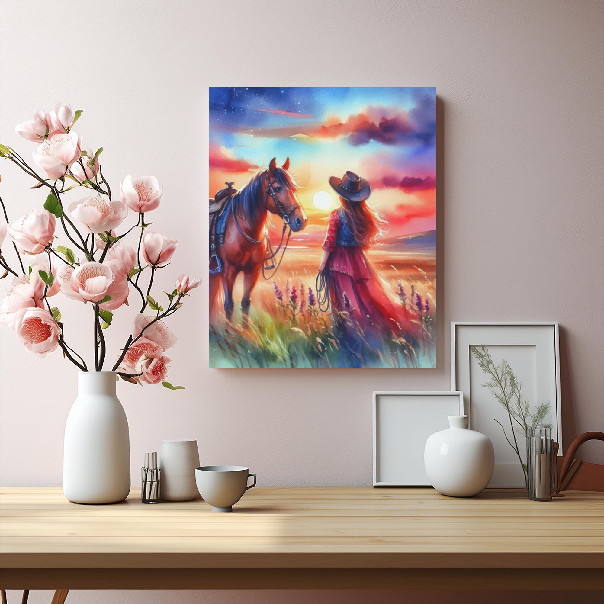 Let your walls whisper stories of freedom and connection with Wildflower Vow, a captivating canvas that celebrates the bond between woman and horse beneath a blazing western sky. Dressed in a flowing red dress and cowboy hat, the cowgirl stands among tall grass and blooming wildflowers, sharing a quiet moment with her loyal companion. The sunset paints the sky in vivid streaks of orange, pink, and indigo, with stars beginning to twinkle—evoking both serenity and adventure. Perfect for rustic homes, boho-chic spaces, or anyone drawn to the romance of the open range, this artwork brings warmth, movement, and emotion to any room. A heartfelt gift for horse lovers, dreamers, and those who find beauty in the wild.