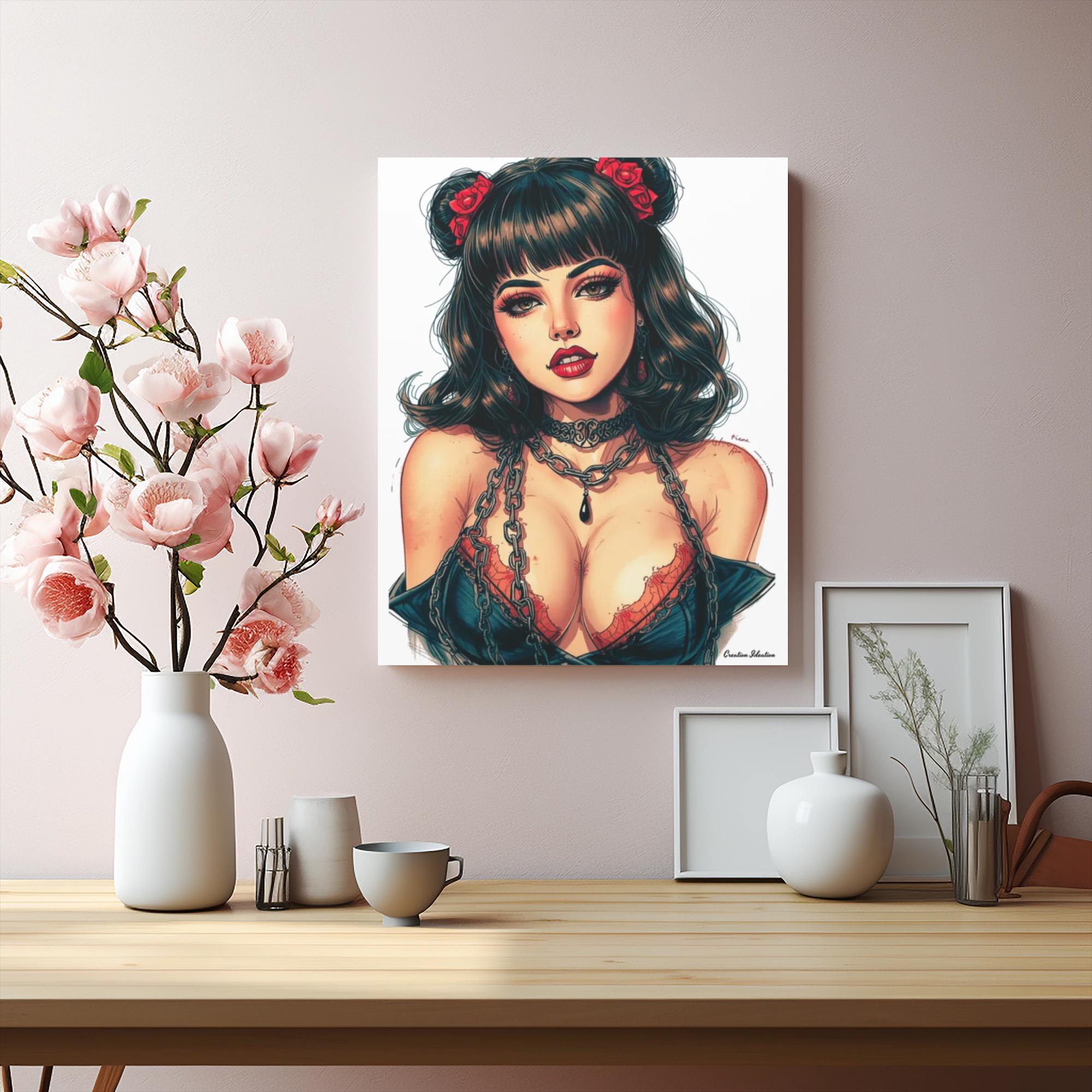 Styled with gothic flair and punk edge, this striking portrait features a woman adorned in roses, chains, and lace. Her confident gaze and bold makeup radiate rebellion and allure, making this canvas a statement piece for alternative souls and lovers of fierce feminine energy.