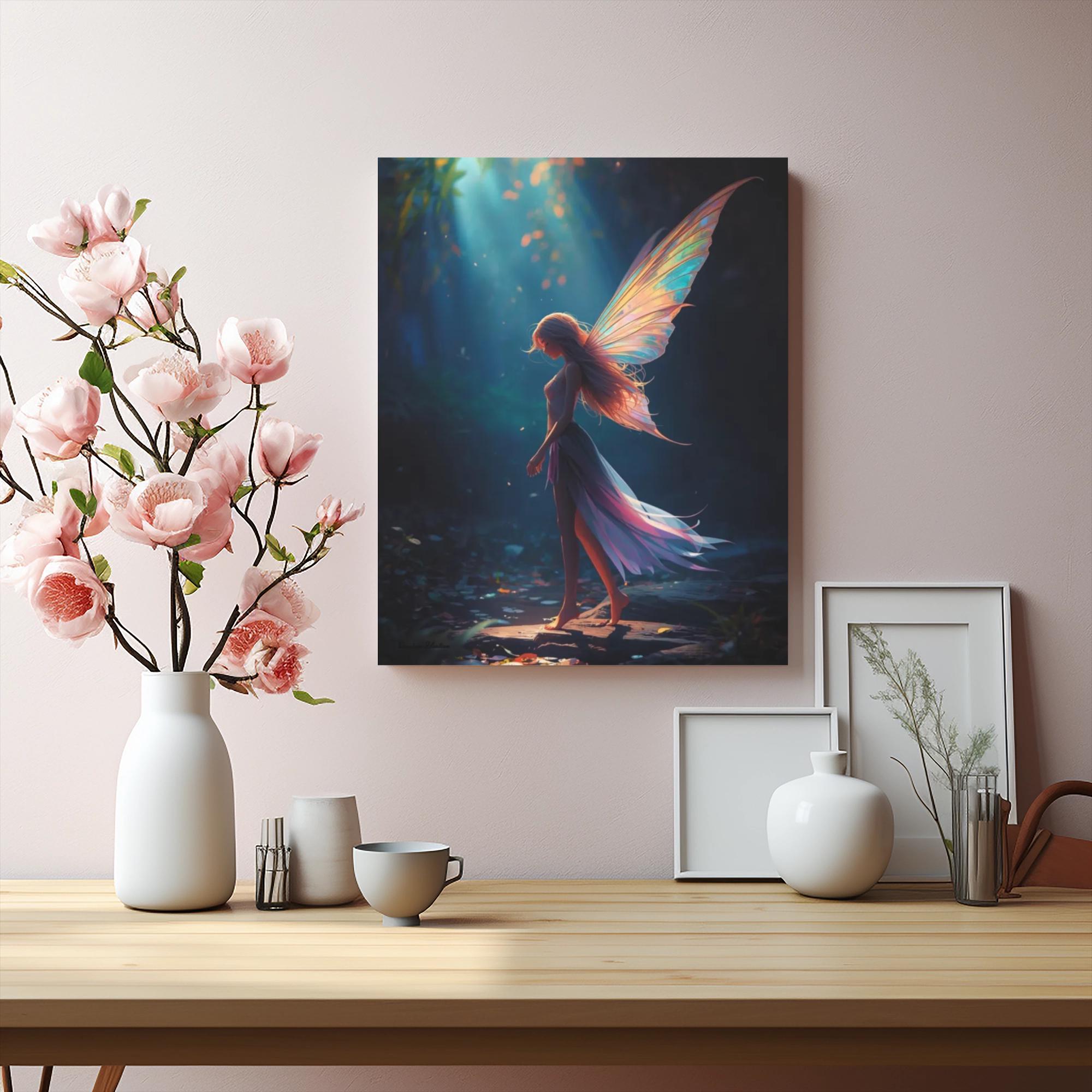 Bathed in ethereal light, a fairy with radiant wings stands barefoot on a forest path, surrounded by falling leaves and soft shadows. Her flowing dress and serene pose invite viewers into a realm of quiet magic and natural wonder. This canvas is perfect for dreamers, nature lovers, and anyone enchanted by the gentle power of the unseen.