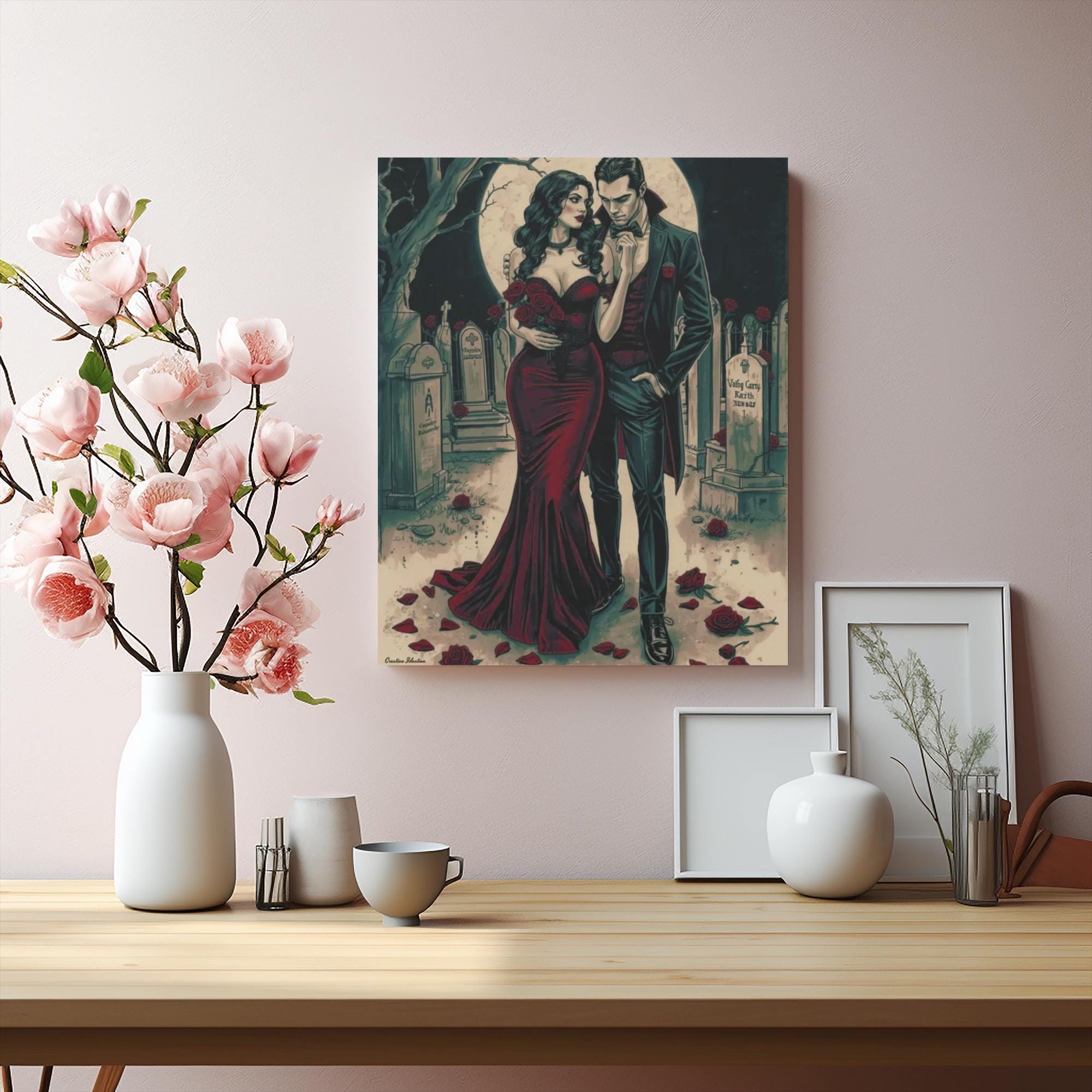 Bound by blood and devotion, this vampire couple stands hand in hand beneath a moonlit sky, surrounded by gravestones and scattered rose petals. Her deep red gown and bouquet echo centuries of love, while his dark suit and solemn gaze speak of loyalty beyond death. Together, they embody a romance that defies time—elegant, eternal, and steeped in gothic beauty. This canvas is a tribute to love that lingers in the shadows, perfect for those who believe passion is strongest after dark.