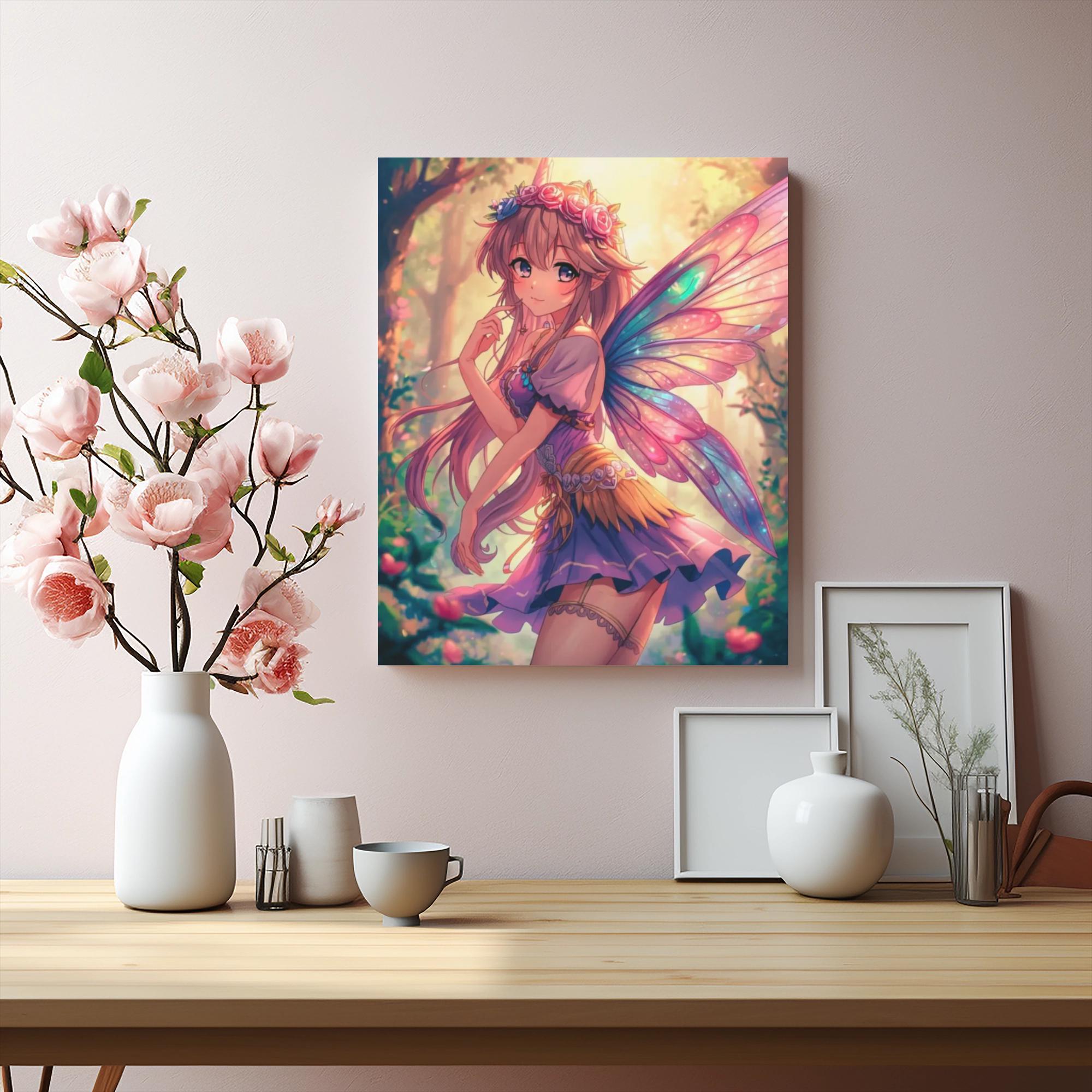 In a forest alive with light and color, a fairy crowned in blossoms stands with grace and quiet joy. Her iridescent wings shimmer with hues of twilight, and her purple-gold attire glows against the lush greenery. This canvas captures the enchantment of nature and the gentle magic of beings who dwell just beyond the veil.