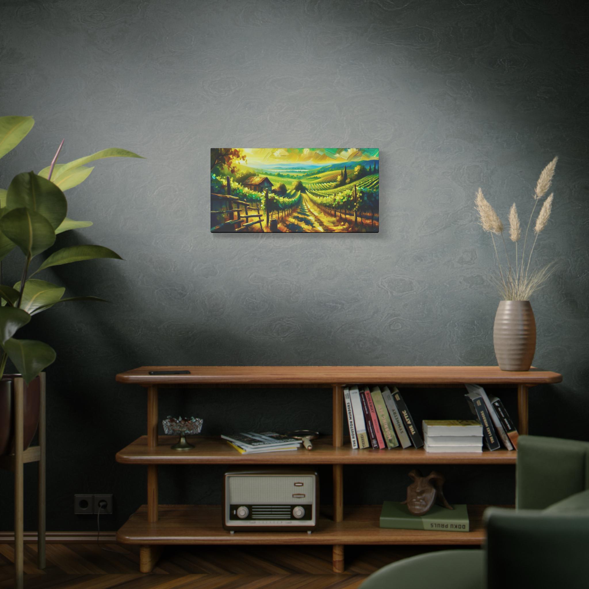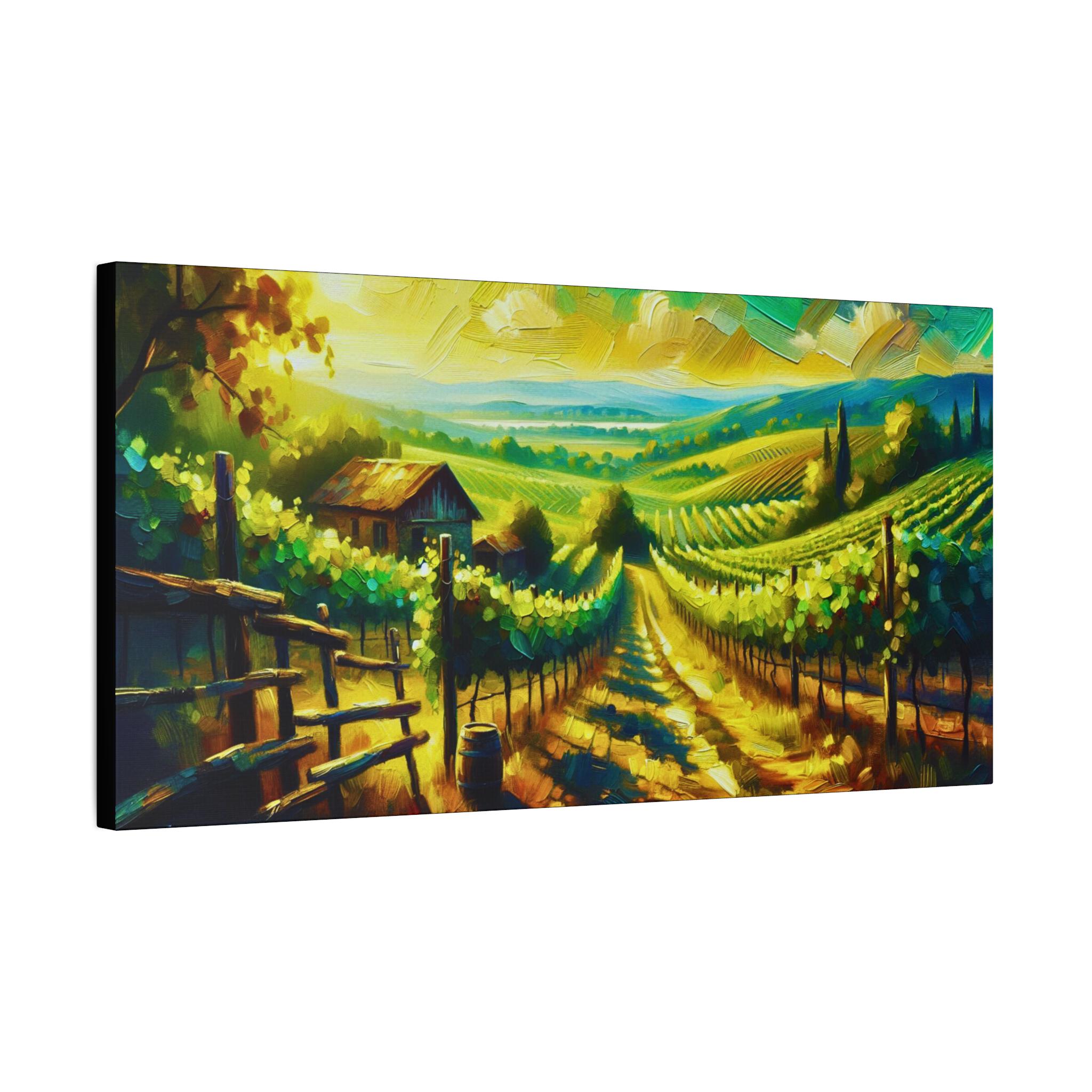 Bathed in golden sunlight, this vineyard canvas captures the warmth and rhythm of rural life. Rows of grapevines stretch toward the horizon, framed by rolling hills and a rustic barn nestled in the distance. The surreal sky—painted in luminous yellows, blues, and greens—adds a dreamy twist to the pastoral calm. A perfect piece for those who find magic in nature’s quiet abundance.