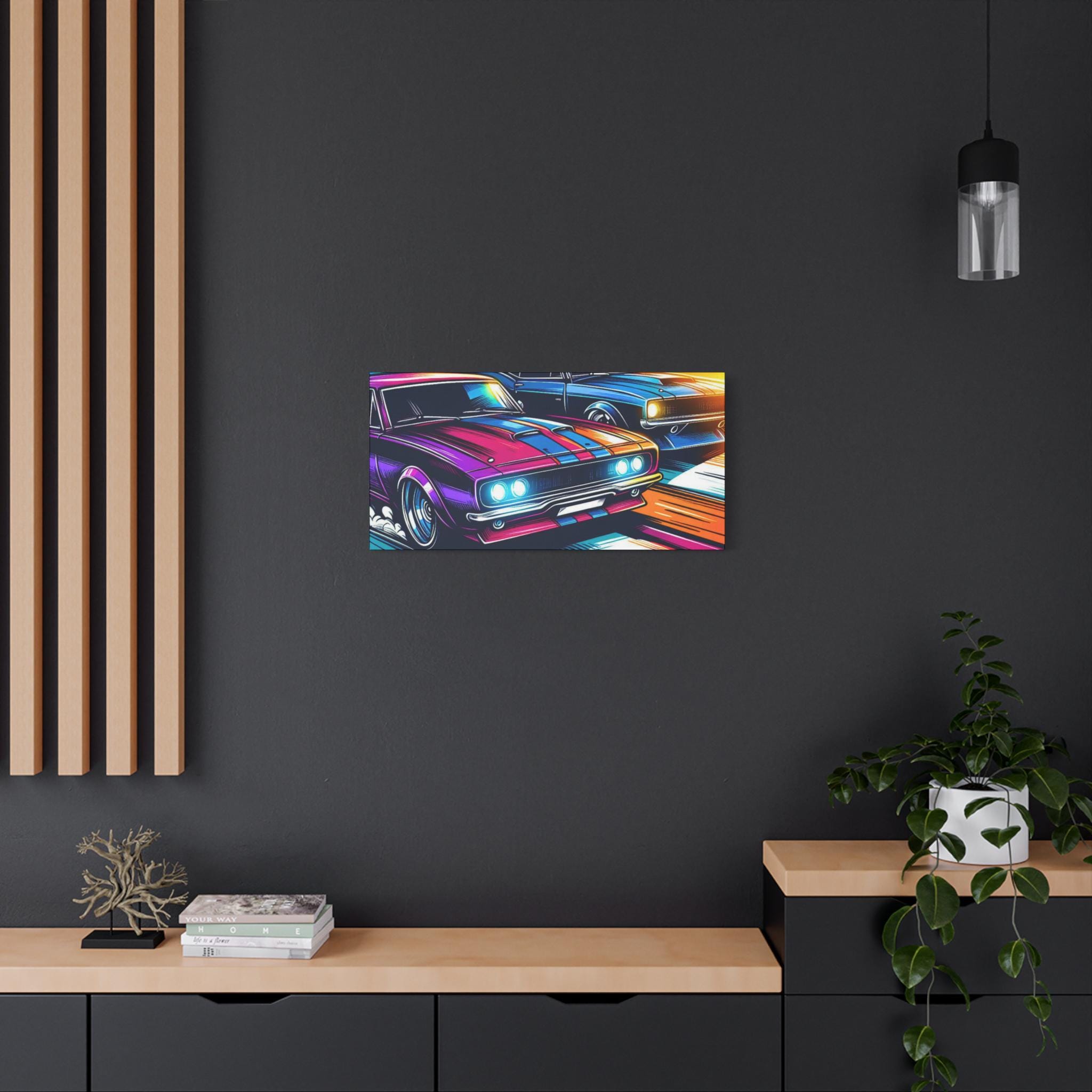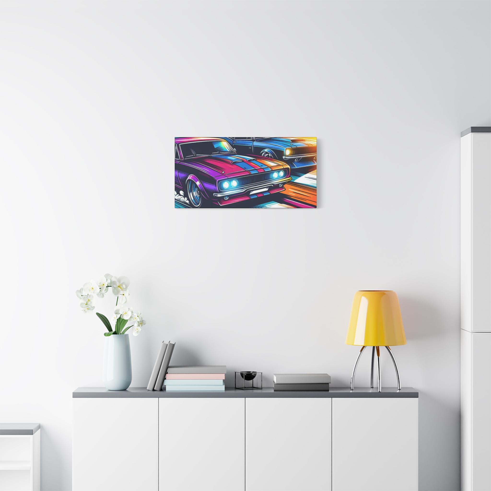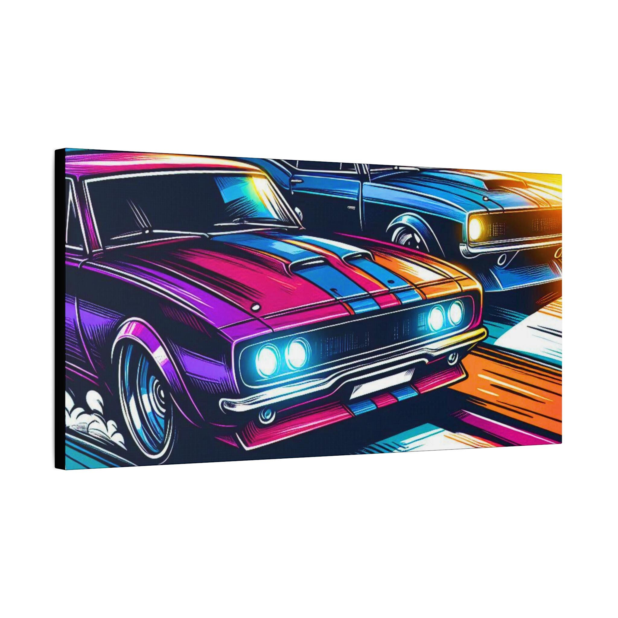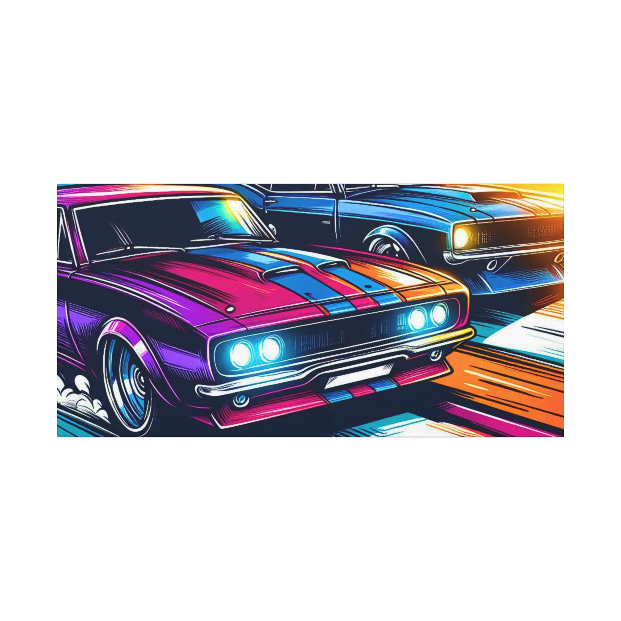 Two muscle cars blaze through a neon blur, their engines roaring in a race of speed and style. With exaggerated lines and glowing accents, this canvas captures the thrill of motion and the pulse of competition. A high-octane tribute to retro rebellion and road-born adrenaline.
