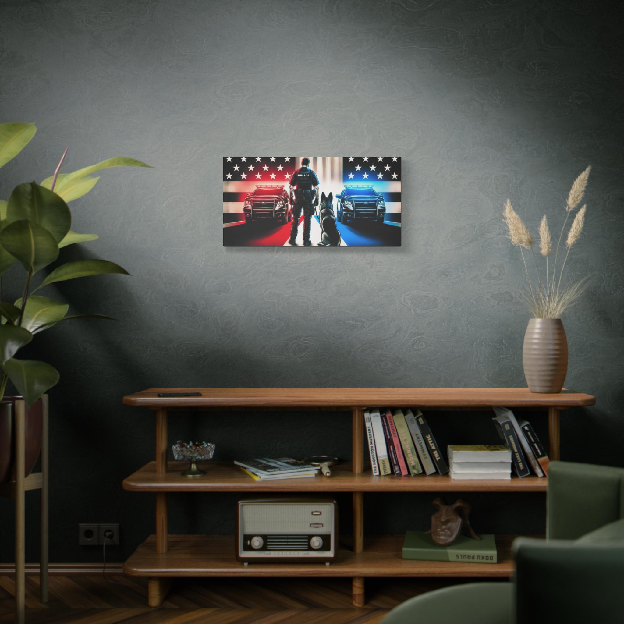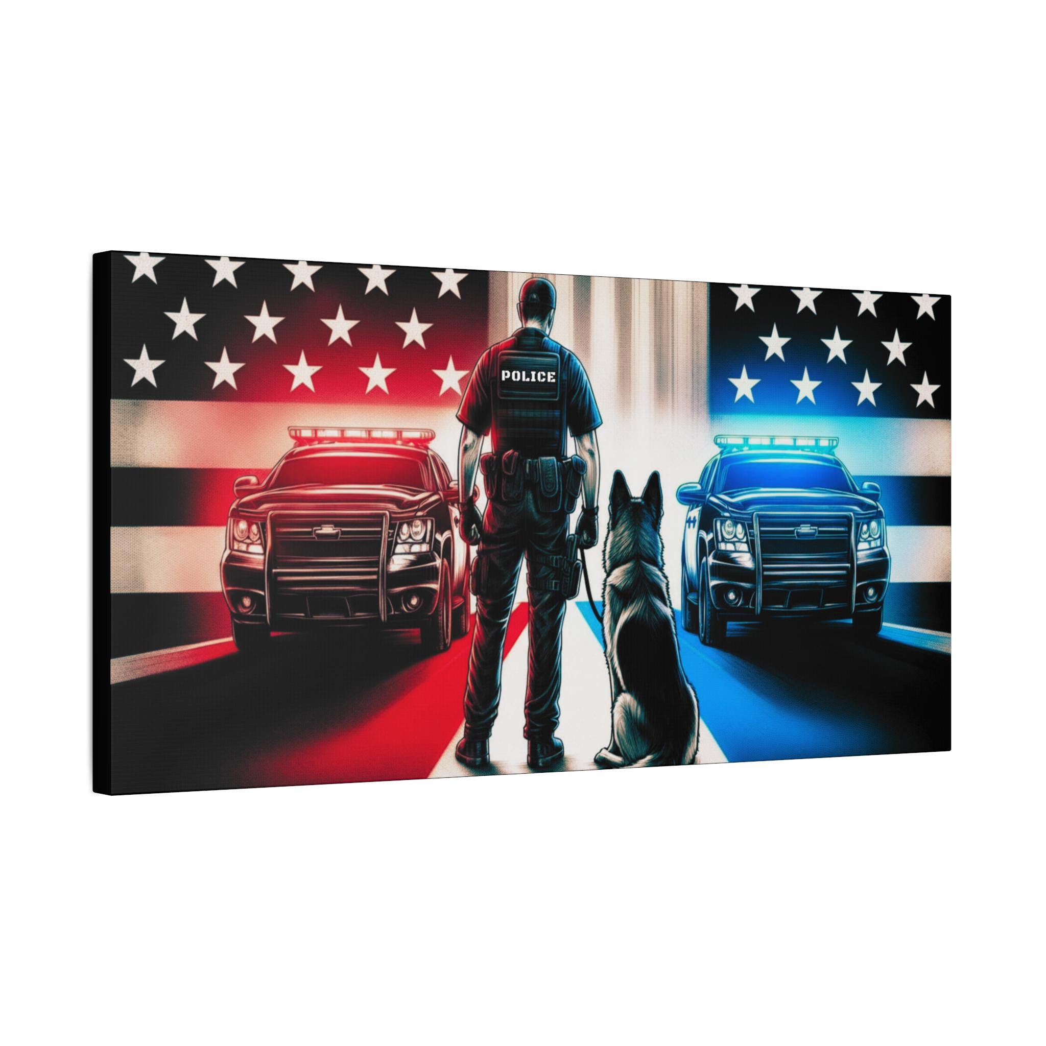 Framed by a split flag of red and blue, an officer and their loyal K9 face the light together. With patrol cars flanking them and the stars and stripes behind, this canvas radiates duty, unity, and the unspoken bond between protector and companion. A bold tribute to service and sacrifice.