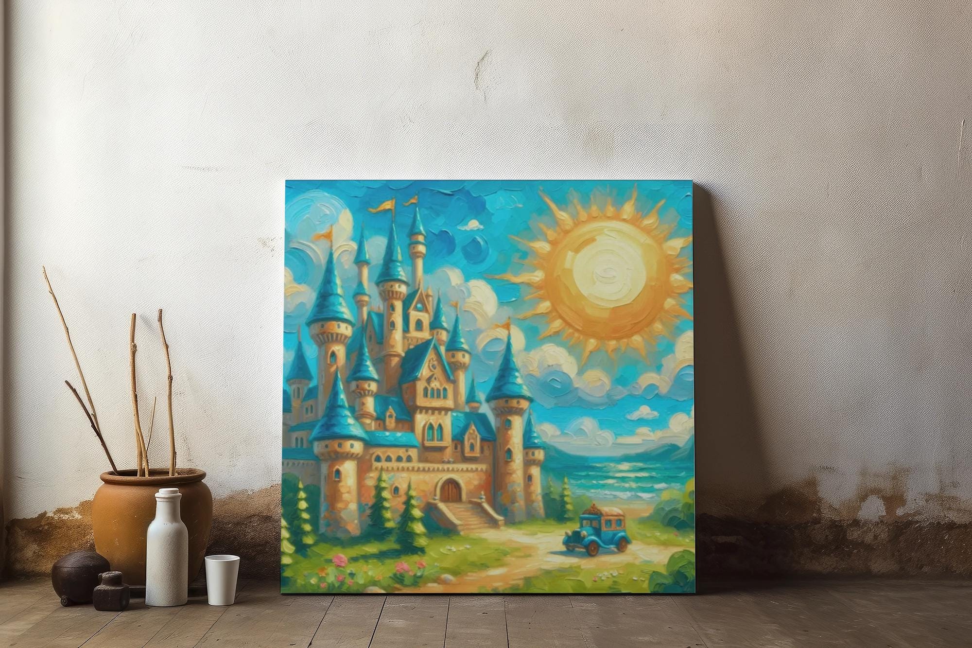 Transform your space with this stunning Stretched Canvas! Each piece embodies a whimsical vibe, bringing joy and creativity into any room. Perfect for kids' rooms, nurseries, or as a charming accent in your living area, this canvas illustrates a magical castle scene under a vibrant sun. It’s an ideal gift for young dreamers, art lovers, or anyone looking to add a pop of color to their décor. Celebrate life's special moments with this artwork, making it a sweet addition for birthdays, holidays, or just a thoughtful surprise for someone special!