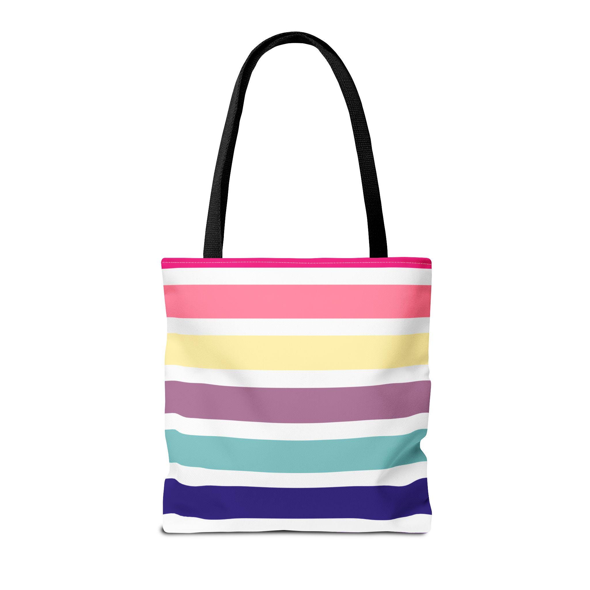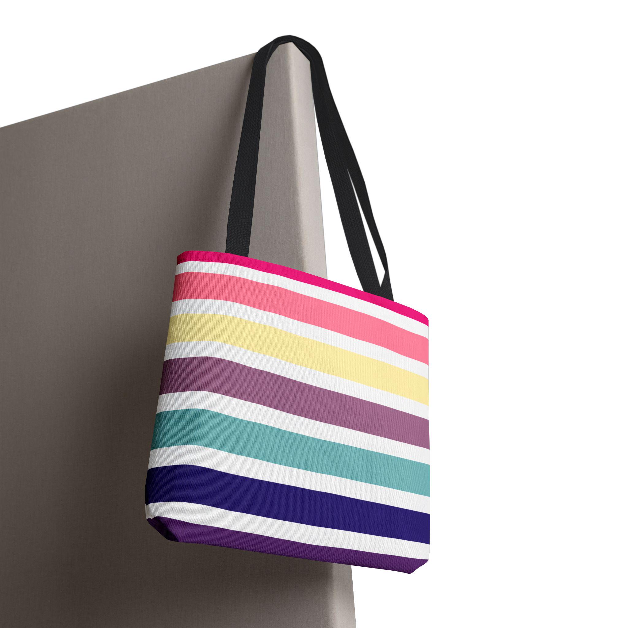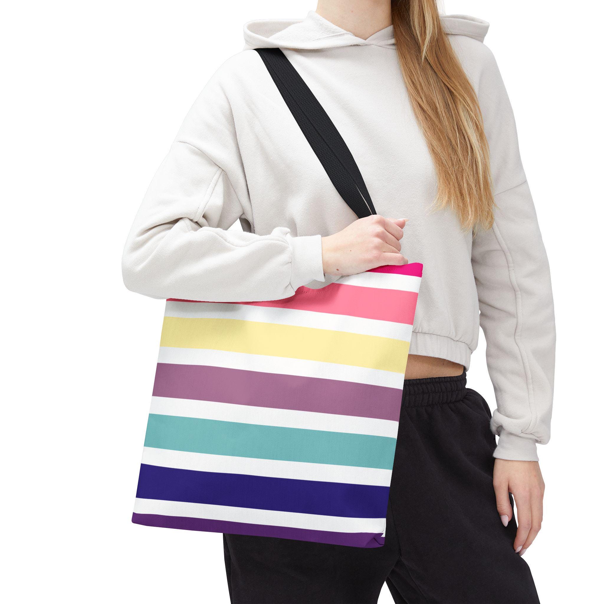This vibrant Tote Bag is your perfect companion for everyday adventures. Crafted from 100% polyester, it showcases a beautiful striped design that adds a pop of color to any outfit. The spacious interior and boxed corners provide ample room for your essentials, from groceries to gym gear. Reinforced stitching on the handles ensures durability, making it reliable for daily use. Whether you're heading to the beach, running errands, or enjoying a picnic in the park, this tote bag effortlessly combines style and functionality. Ideal for fashion lovers, students, or anyone who needs a sturdy bag, it makes a thoughtful gift for birthdays, holidays, or any special occasion.