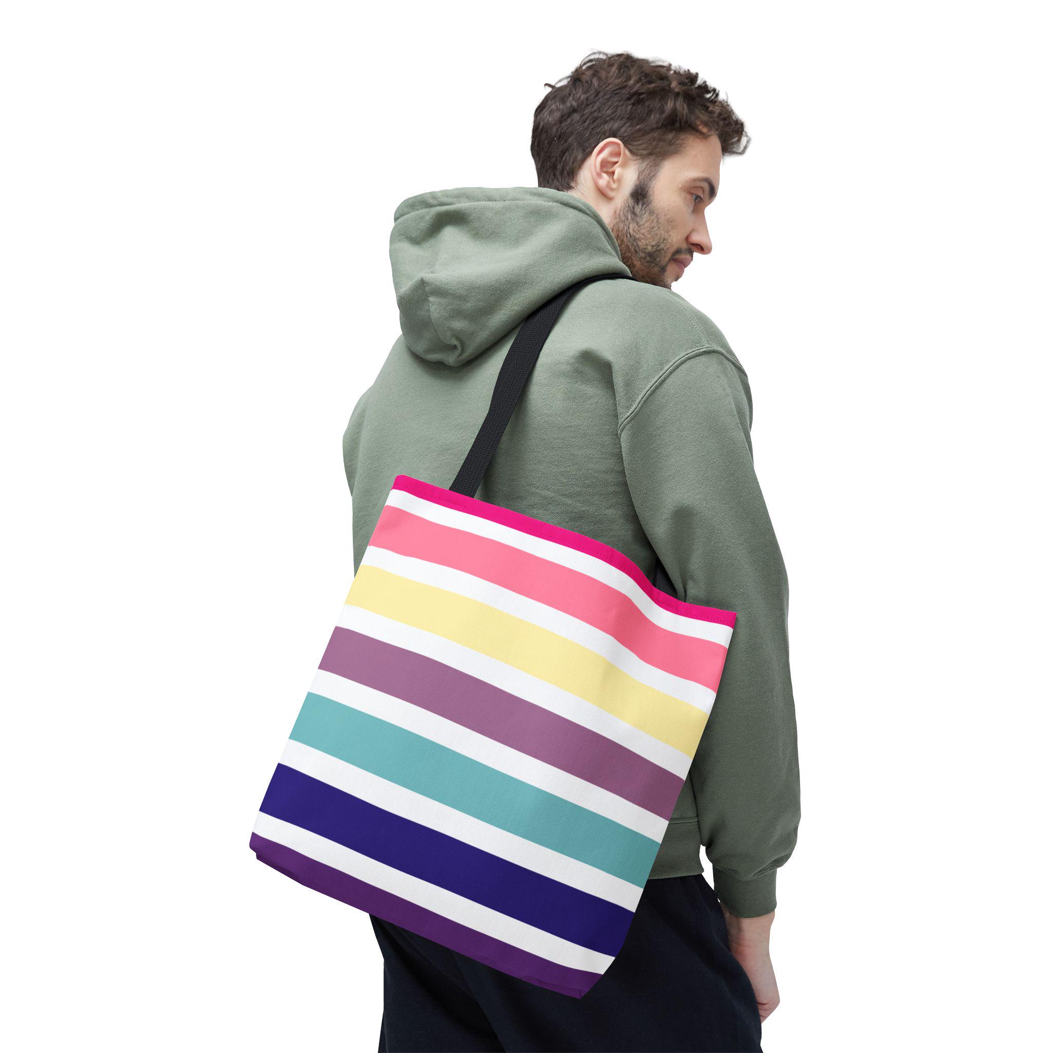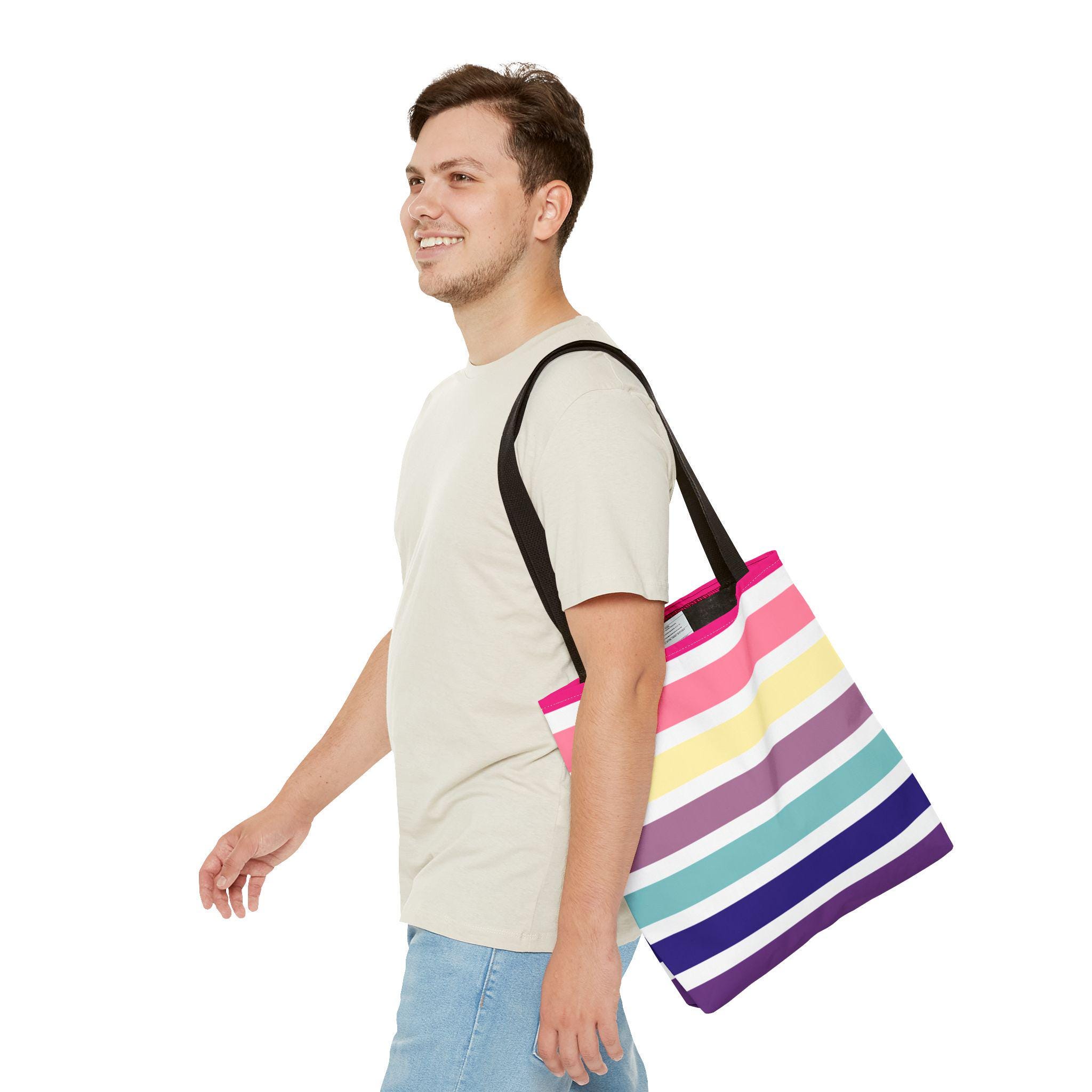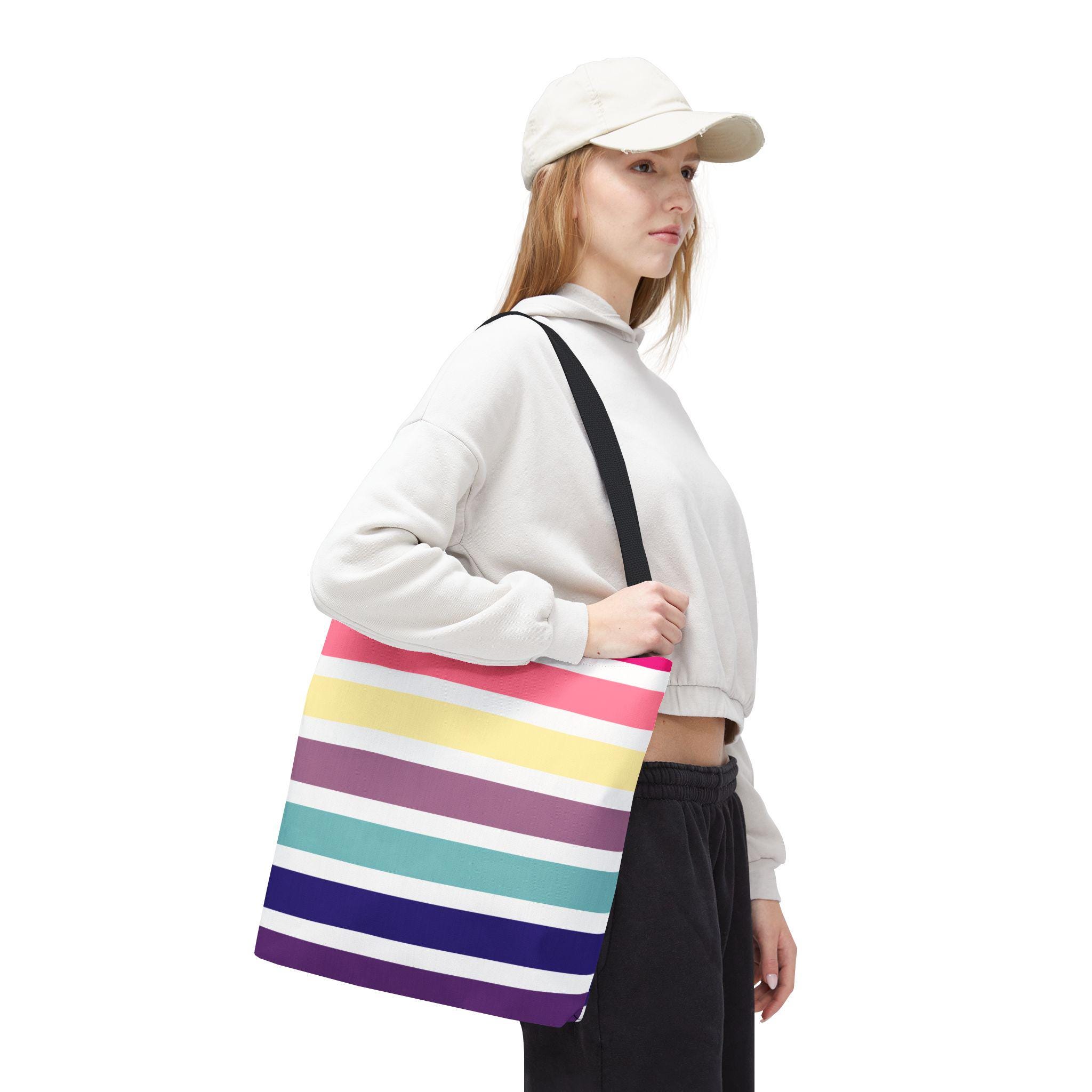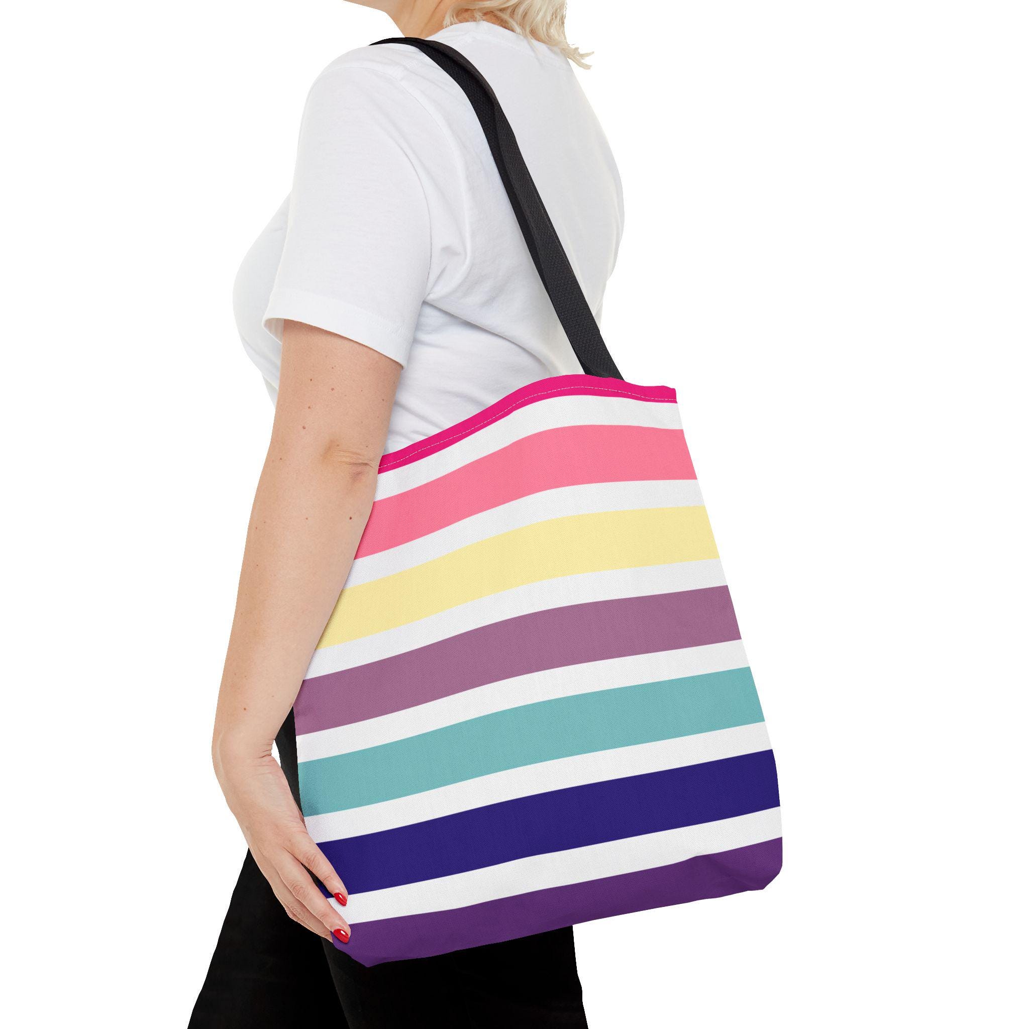 This vibrant Tote Bag is your perfect companion for everyday adventures. Crafted from 100% polyester, it showcases a beautiful striped design that adds a pop of color to any outfit. The spacious interior and boxed corners provide ample room for your essentials, from groceries to gym gear. Reinforced stitching on the handles ensures durability, making it reliable for daily use. Whether you're heading to the beach, running errands, or enjoying a picnic in the park, this tote bag effortlessly combines style and functionality. Ideal for fashion lovers, students, or anyone who needs a sturdy bag, it makes a thoughtful gift for birthdays, holidays, or any special occasion.