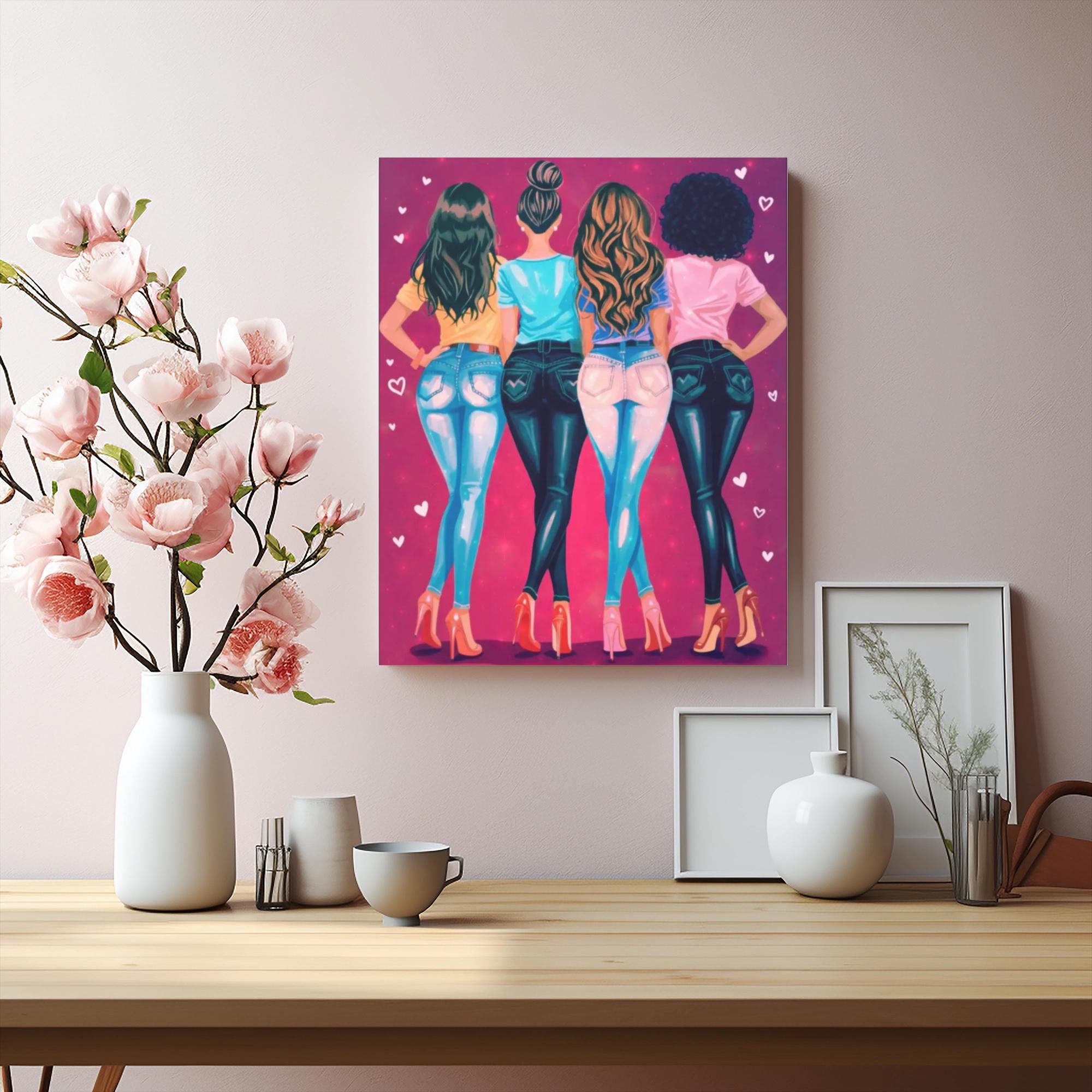 This stretched matte canvas brings warm, playful energy to any room — four friends linked arm-in-arm, turned away in matching heels and jeans against a deep berry background scattered with tiny hearts. The cotton-poly canvas surface captures rich, fade-resistant color with a velvety, low-reflective finish so the illustration reads beautifully from every angle. Hung in a living room, dorm, or hallway, it reads like a small celebration of friendship: bold, affectionate, and a little bit sassy. The slim 1.25" profile keeps the look contemporary and gallery-ready while the soft rubber dots on the back protect surfaces and help the piece hang straight.