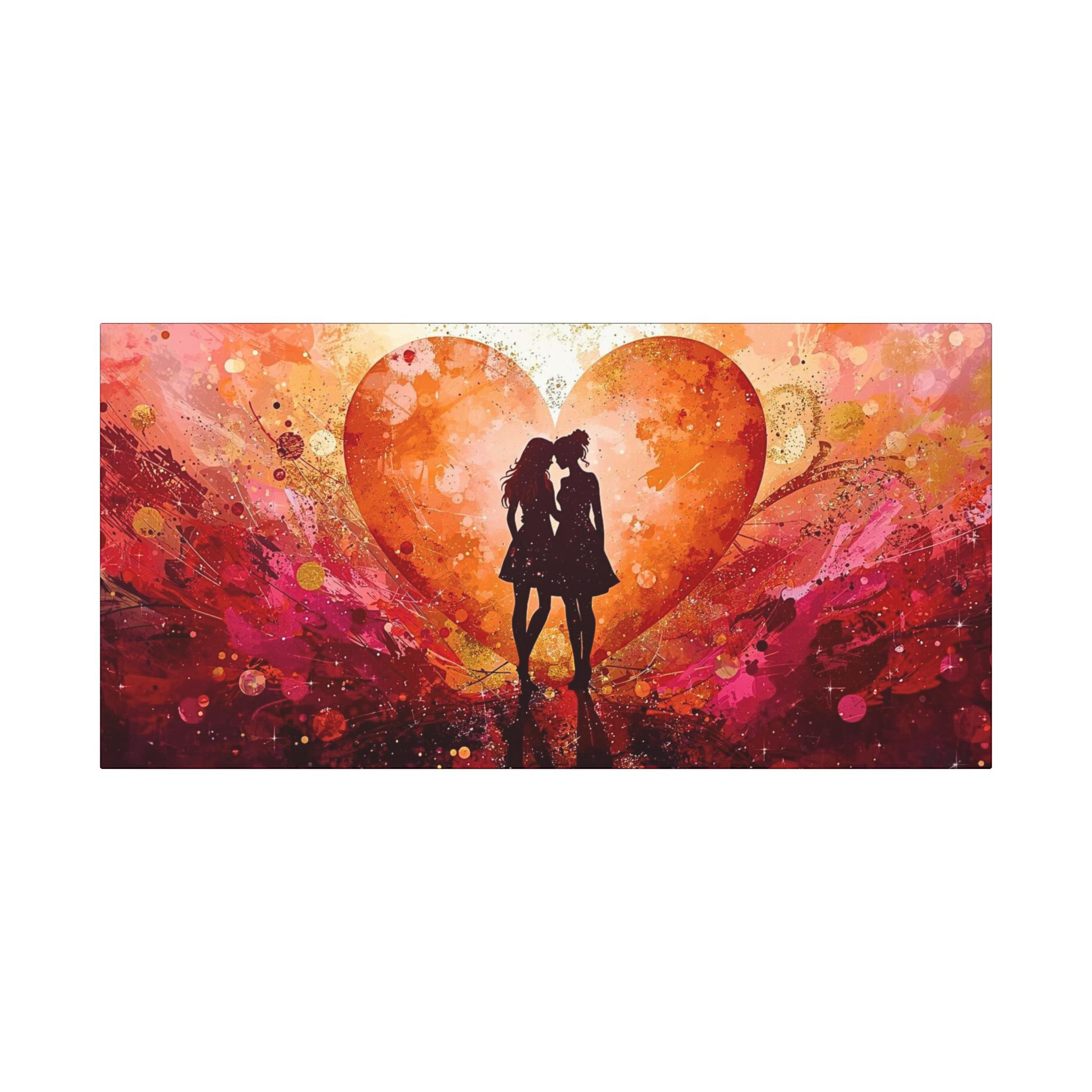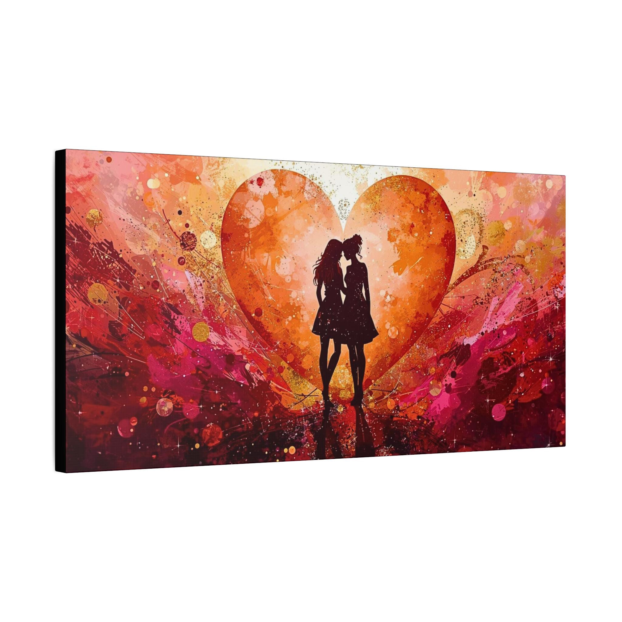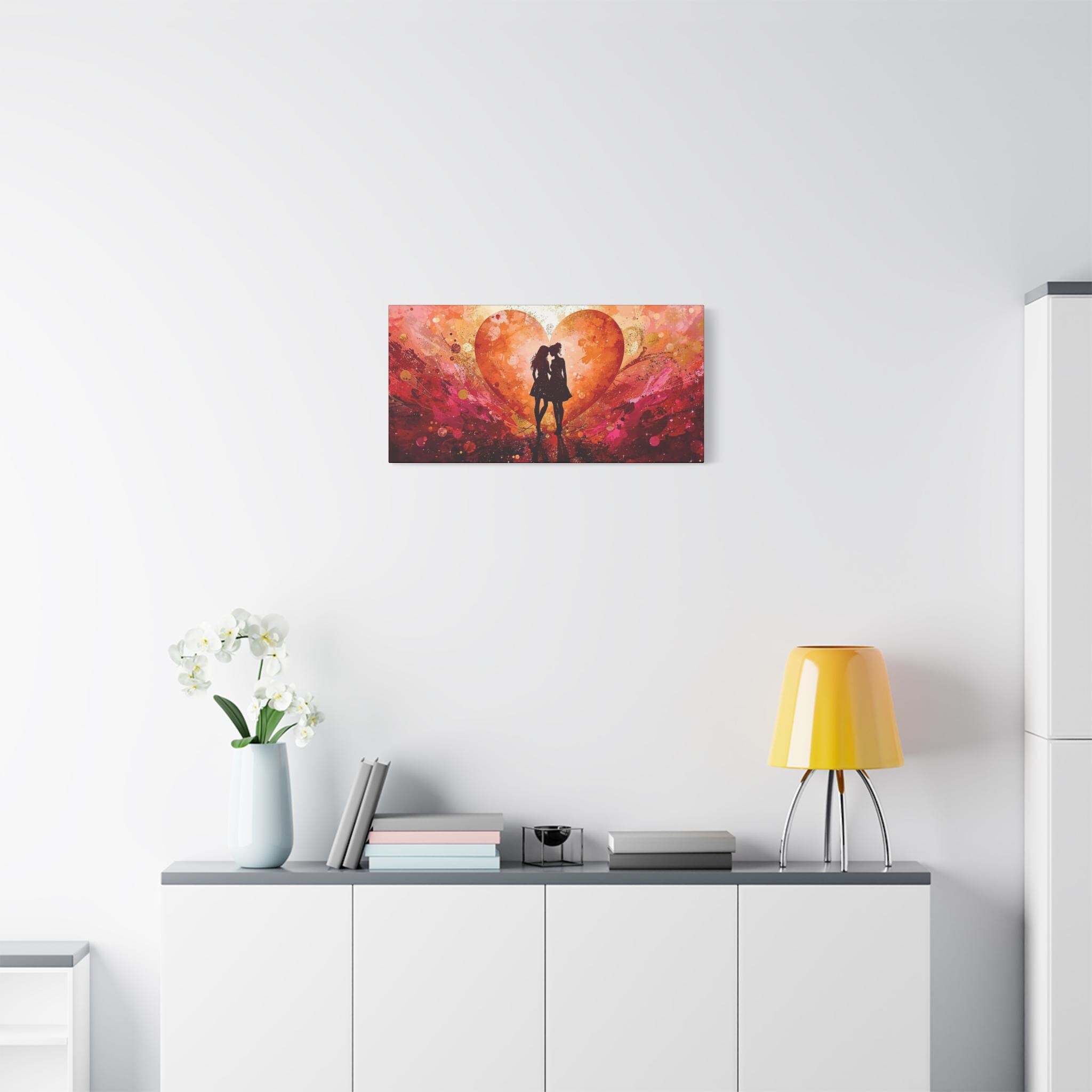 This stretched matte canvas brings a warm, painterly love scene into your space. Rich oranges, pinks, and crimson washes swirl around a glowing heart as two figures stand close at the center — a moment of quiet connection captured in bold, textured color. Hung above a bed, sofa, or entry table, the piece reads like a lived-in memory: vibrant yet intimate, soft-edged yet confident. The stretched profile gives a gallery-ready silhouette while the subtle rubber feet and included hanging hardware make installation neat and secure. It fits rooms where romance, warmth, and artistic flair matter.