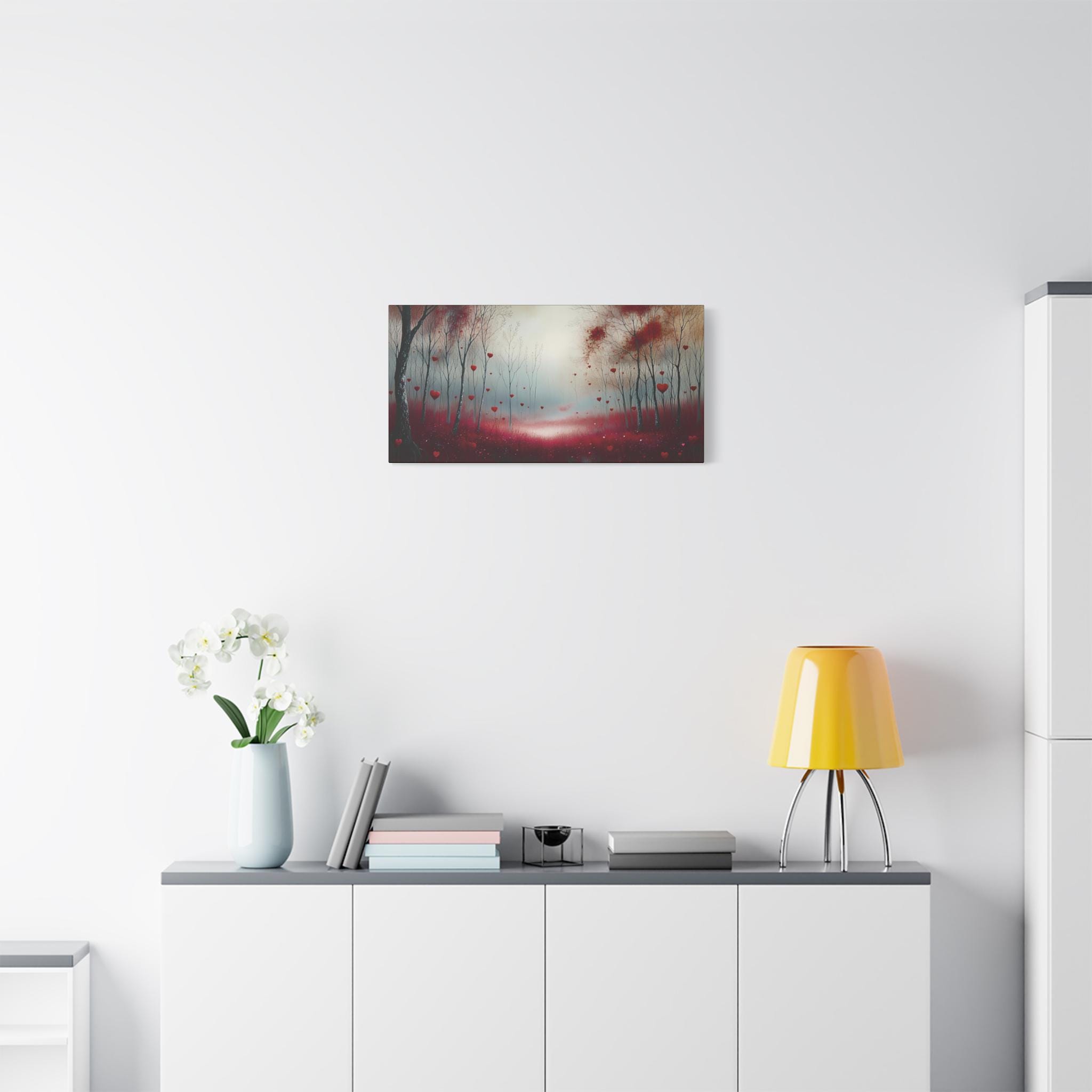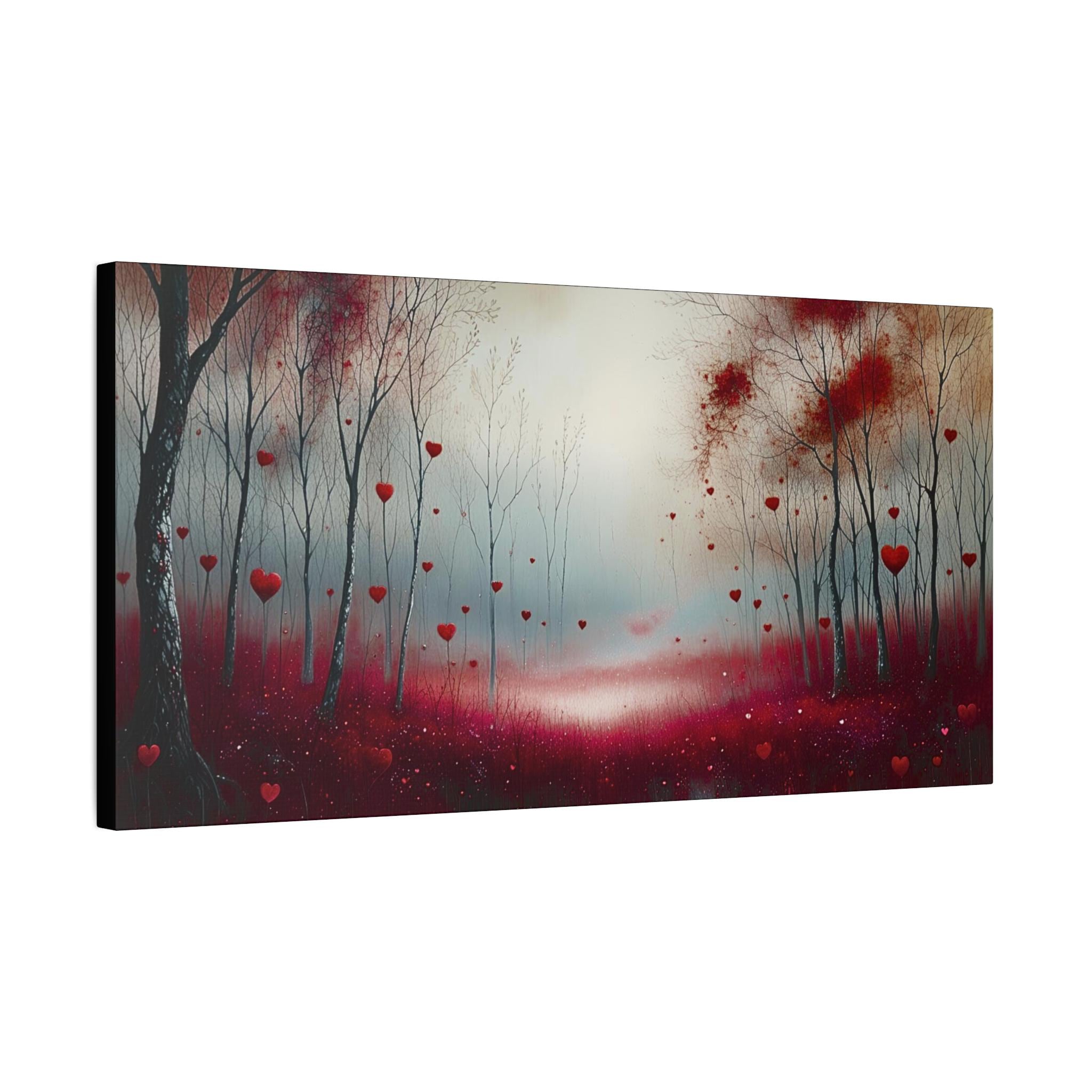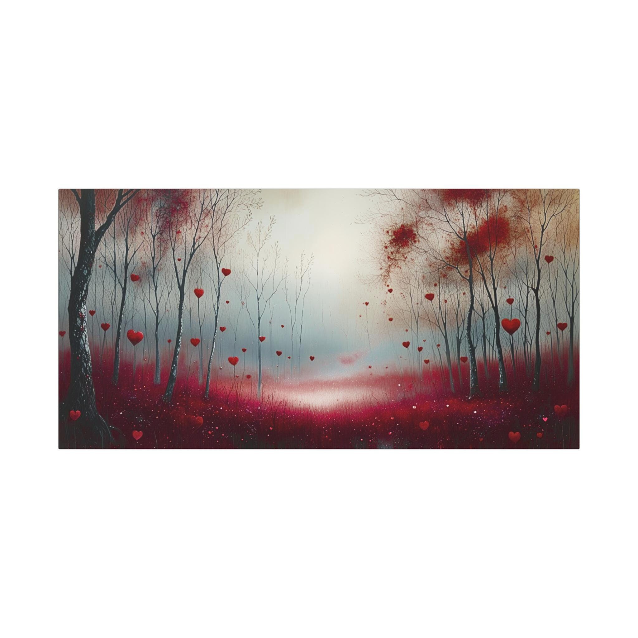 A stretched matte canvas that brings a dreamy, heart-filled woodland into your space. Soft, muted light filters through bare trees while delicate heart-shaped petals drift above a crimson mossy floor. The surface has a smooth, non-reflective finish that keeps the image richly detailed without glare. Lightweight and ready to hang, this canvas adds a calm, romantic atmosphere to living rooms, bedrooms, or cozy reading nooks. The image feels like a quiet walk through an enchanted grove — intimate, slightly surreal, and quietly hopeful.