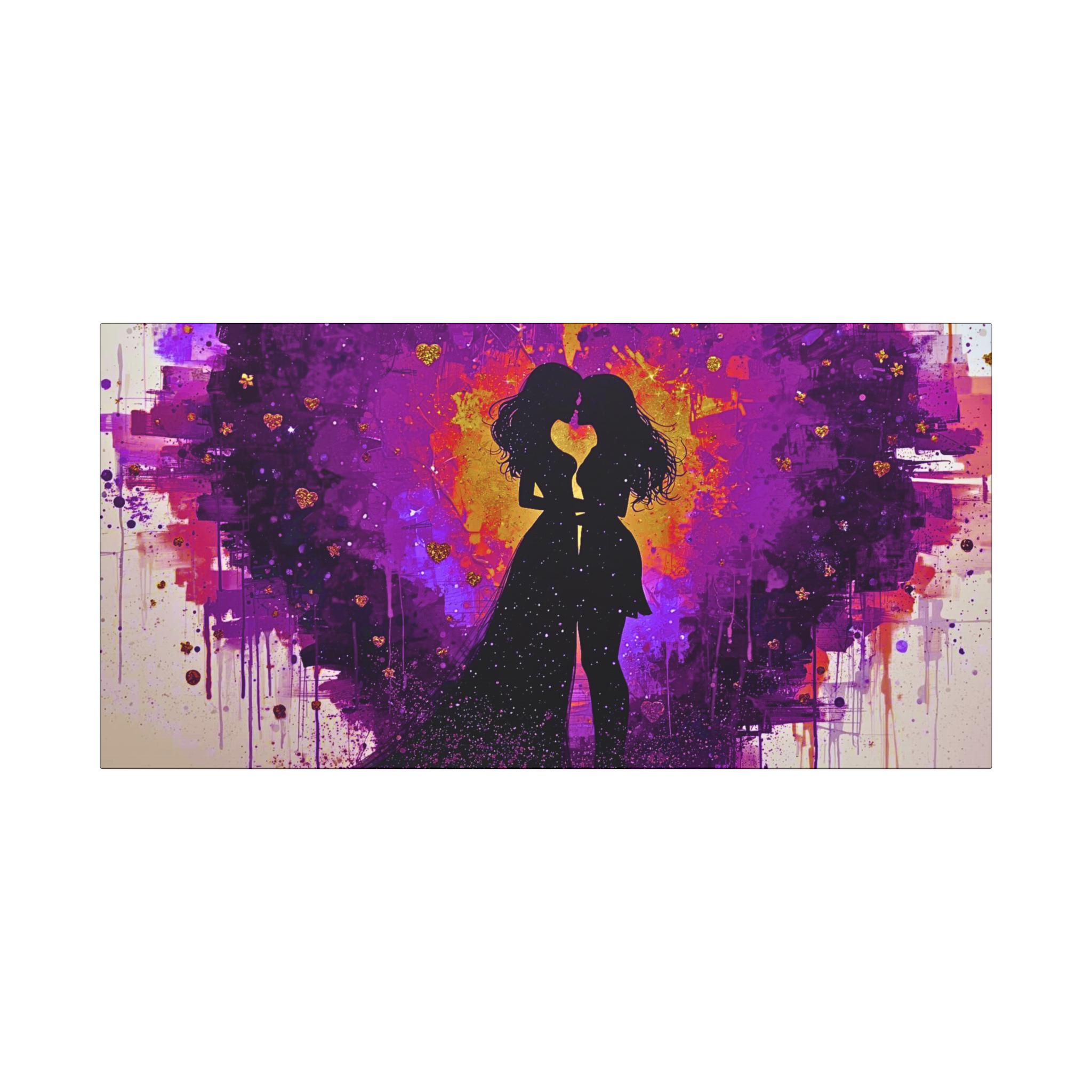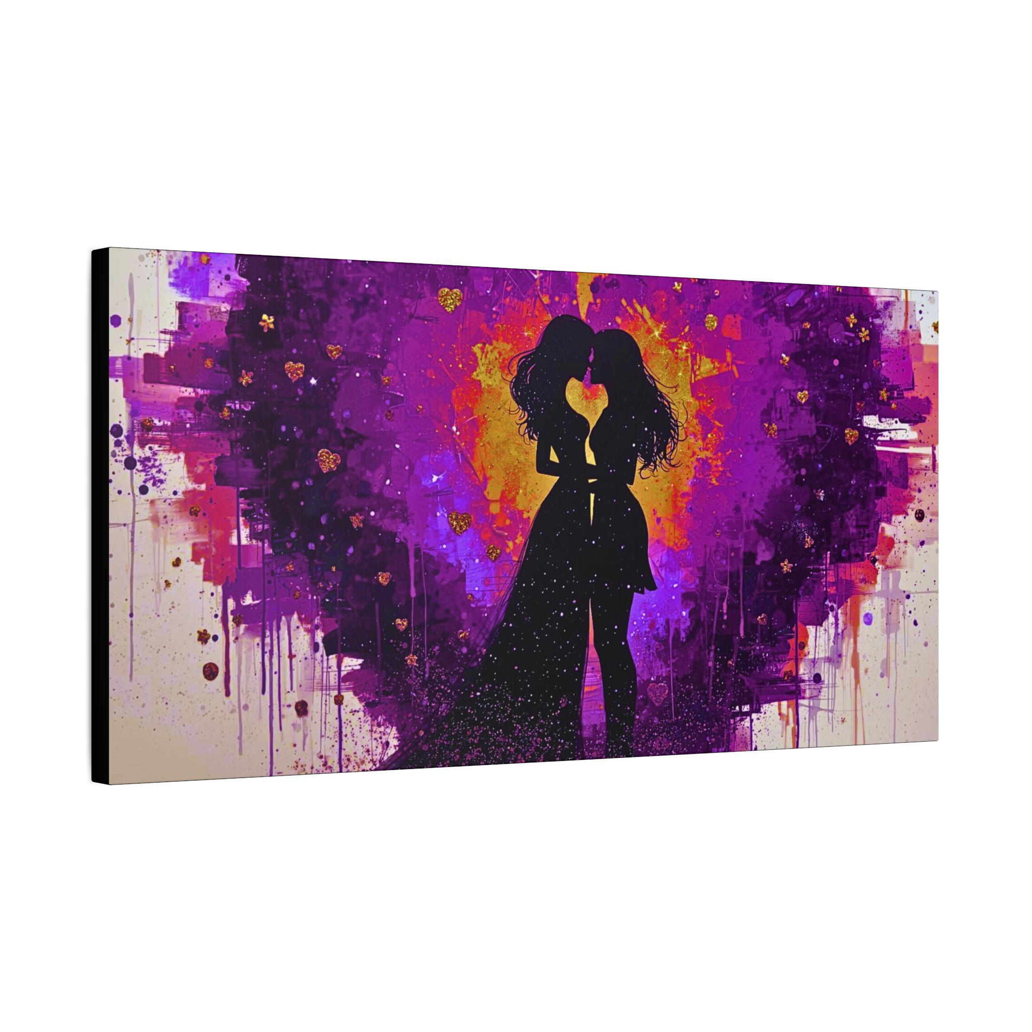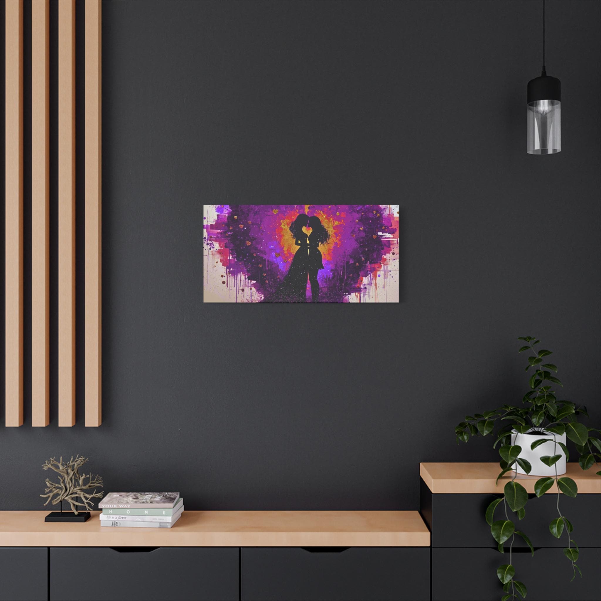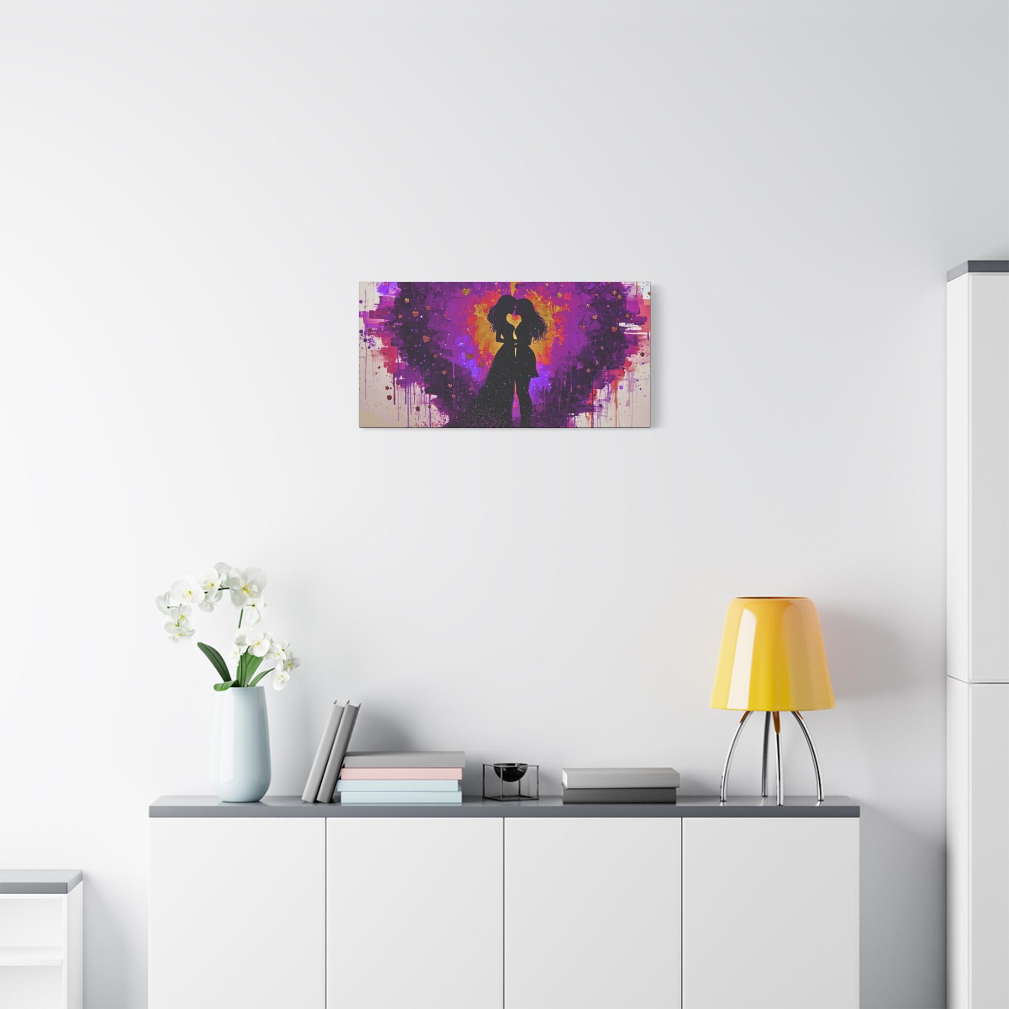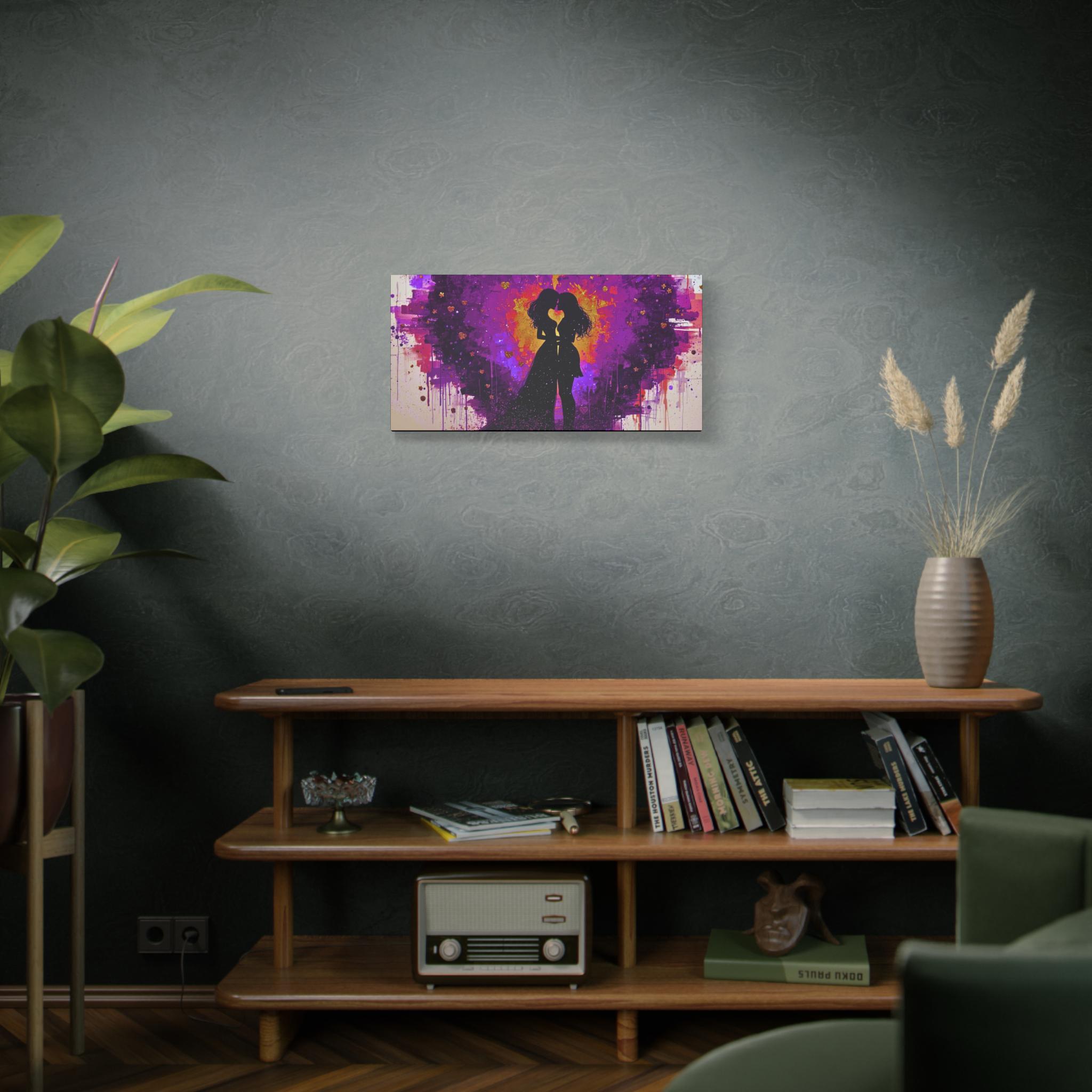 This stretched matte canvas captures a tender, intimate moment in bold, splashy color. A silhouetted couple stands framed by an exploding heart of purples, magentas and warm gold — paint drips and scattered mini-hearts give the piece an urban, street-art energy. Hung above a bed, sofa, or in a cozy reading nook, the canvas brings a warm, passionate focal point that feels both modern and handcrafted. The subtle texture of the cotton-poly canvas and the deep, UL-certified Greenguard Gold inks keep colors vivid while remaining safe and non-toxic. Finished with a slim 1.25" profile and ready-to-hang backing, it settles flush against the wall and stays put thanks to soft rubber dots on the back corners.
