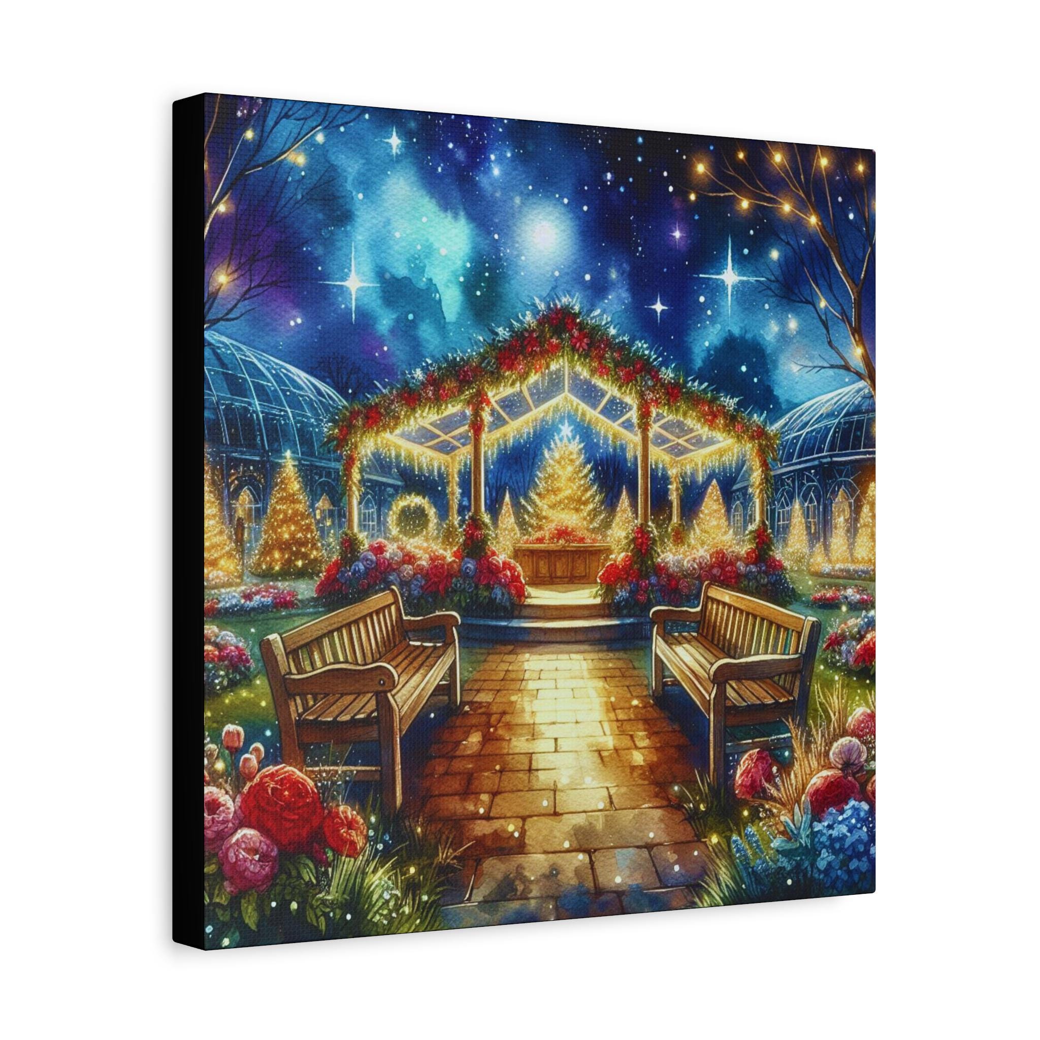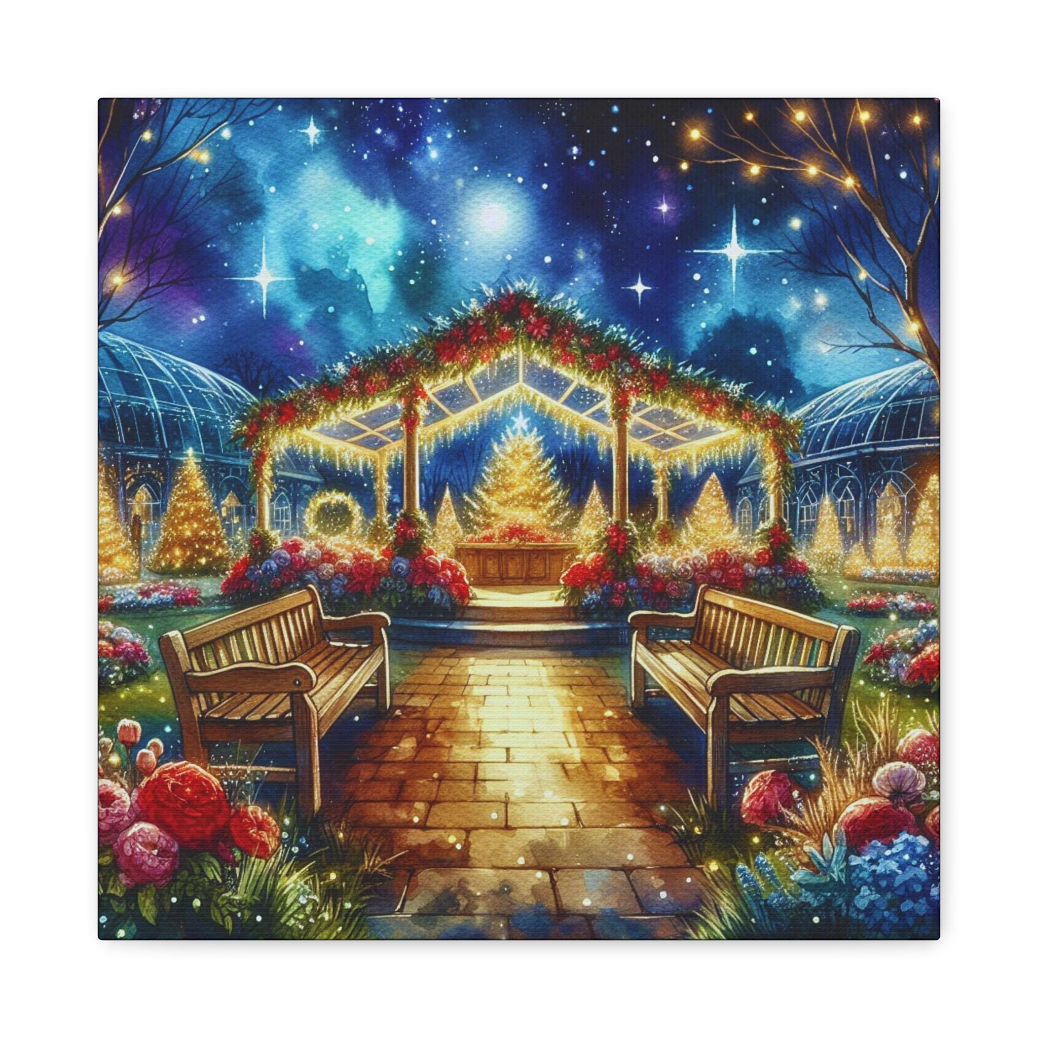 A luminous matte canvas that brings a cozy, festive evening indoors. Softly textured cotton-poly canvas captures rich jewel tones and warm light from a garlanded pavilion, glowing trees, and a starry sky. Stretched over a slim 1.25" radiata pine frame, it hangs neatly and stays flush against the wall thanks to soft rubber dots and included back hanging hardware. The scene invites quiet moments on the couch, seasonal decorating, or adding a touch of wonder to a hallway — a small window to a twinkling winter garden that feels lived-in and lovingly made.