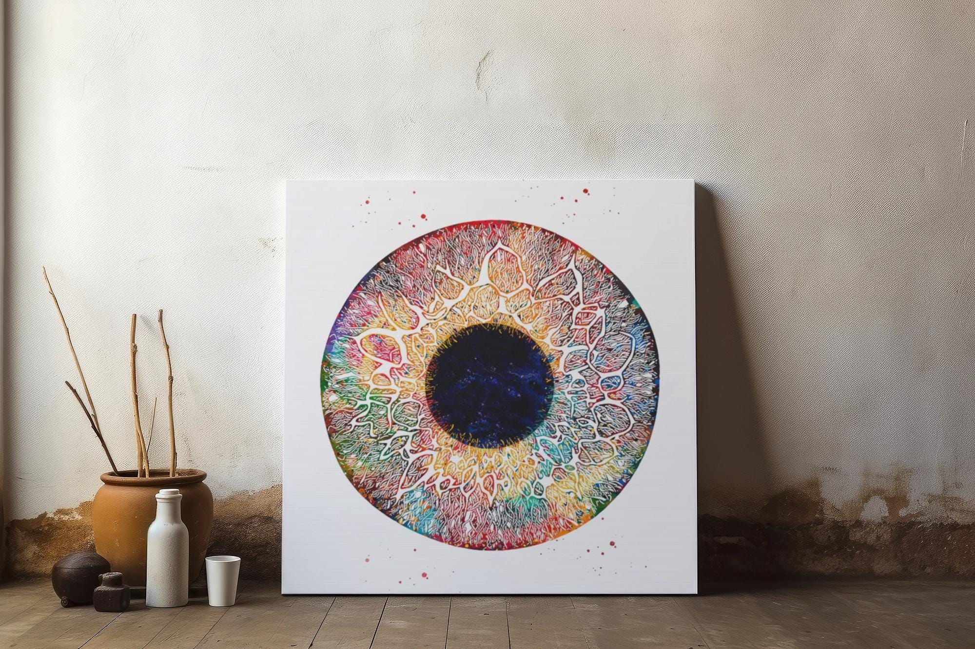 A vivid, stretched matte canvas that brings a burst of color and curious energy to your walls. This piece centers on a mesmerizing circular motif — iris-like, sunburst, and slightly cosmic — with intricate linework and layered textures that draw the eye. The matte finish softens glare and lets the pigments read rich and natural, while the slim 1.25" profile keeps the look contemporary and gallery ready. Hang it in a reading nook, studio, or entryway to spark conversation and invite a closer look. The subtle rubber feet at the back keep it sitting straight against the wall, and the included hanging hardware makes installation straightforward.