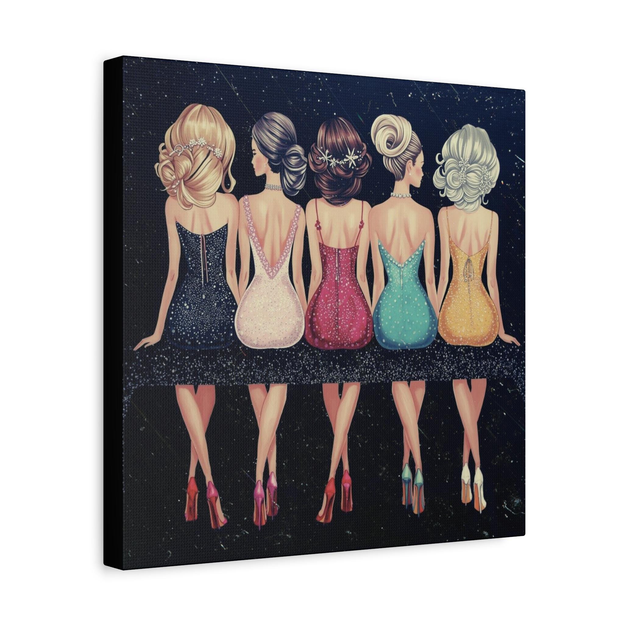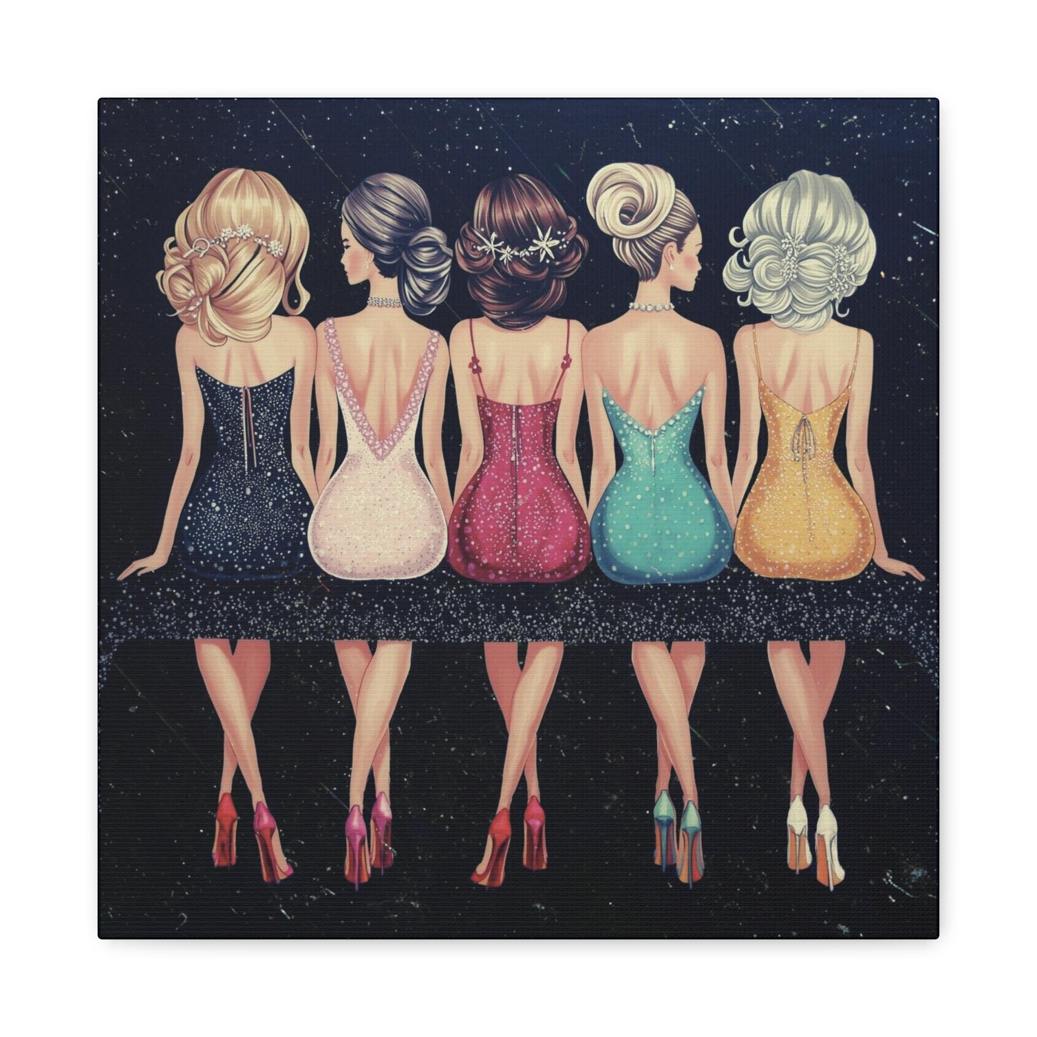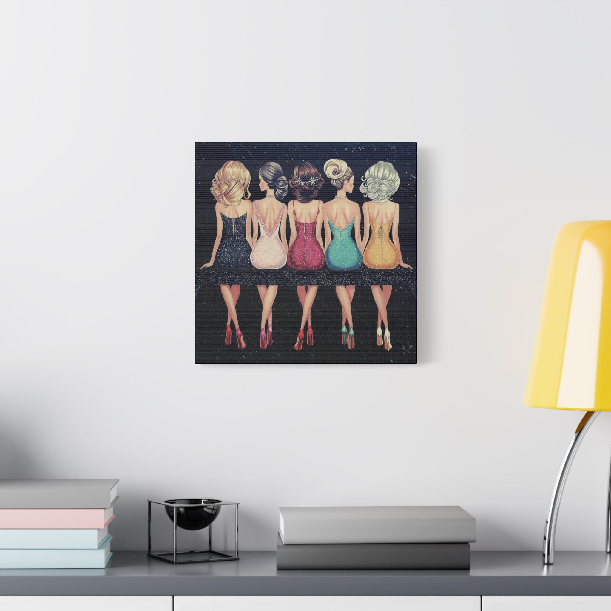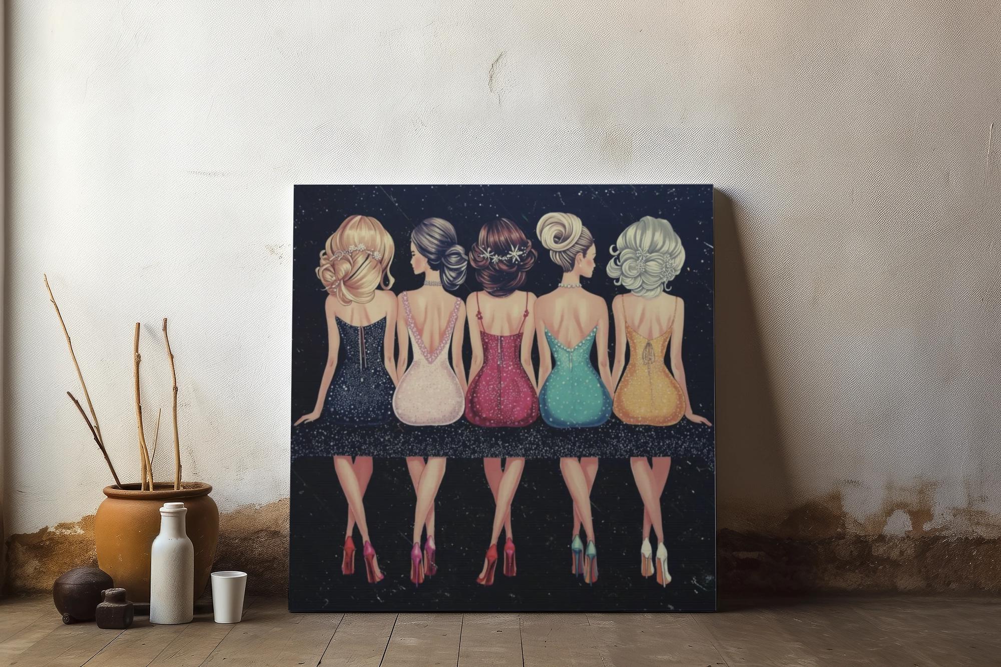 A chic matte canvas that captures a joyful moment between five stylish friends. Rendered in soft, elegant colors against a night-sky backdrop, this stretched canvas brings warmth and playful glamour to entryways, bedrooms, or a gallery wall. The textured cotton-poly canvas surface and Greenguard Gold latex inks keep colors vibrant while remaining non-toxic. Stretched on sustainably sourced radiata pine with soft rubber dots on the back to keep the piece steady when hung, this artwork feels like a snapshot from a night out — laughter, glitter, and the quiet confidence of women together.