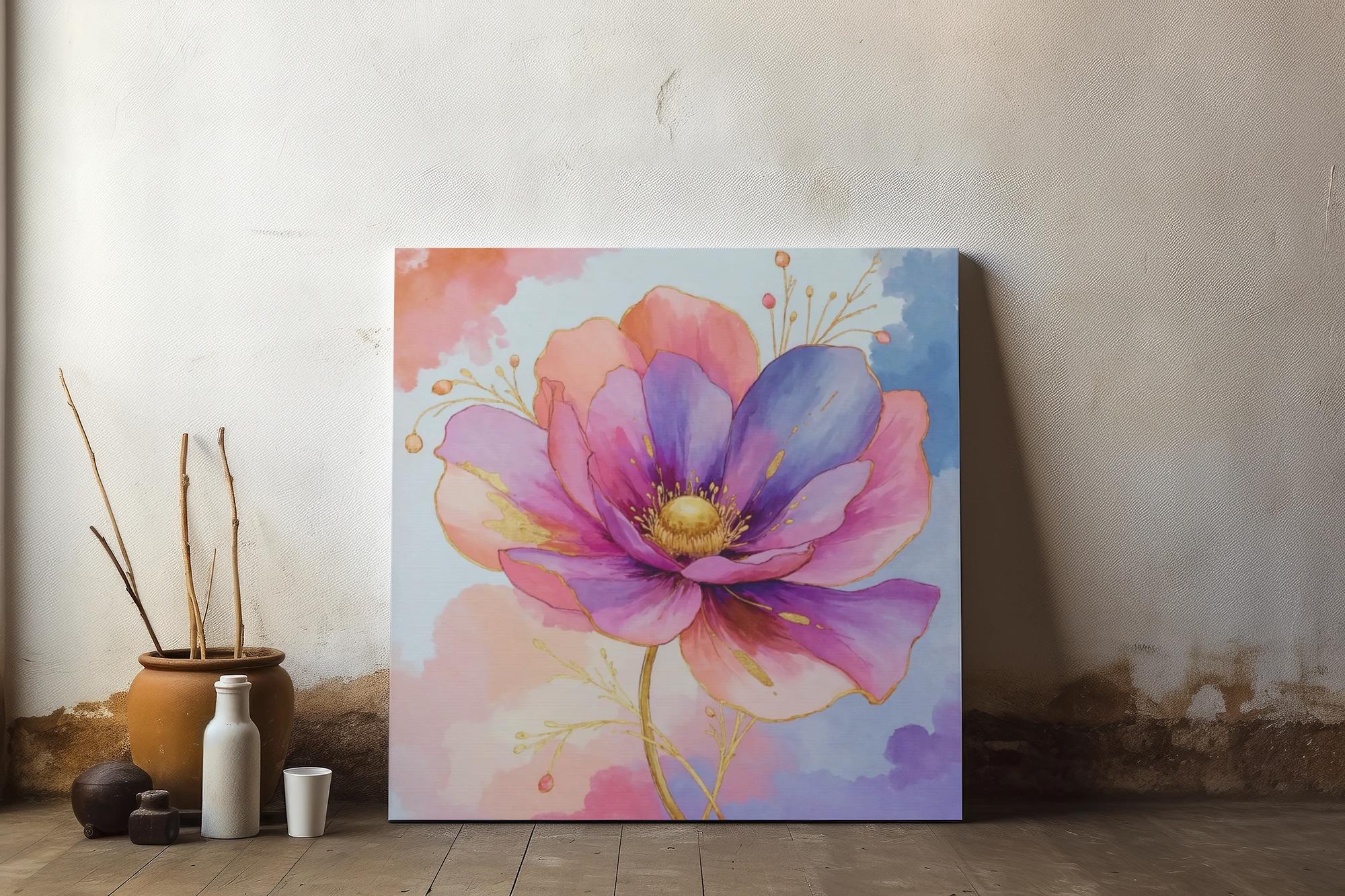 Hand-stretched matte canvas with a watercolor floral that feels soft, airy, and quietly uplifting. The gentle blend of pinks, purples, and gold accents brings a light, feminine energy to a living room, bedroom, or cozy reading nook. Mounted on a sustainably sourced pine frame and finished with a soft matte coating. Two small rubber dots on the back keep the canvas securely in place when hung and included hanging hardware makes installation simple. The result is artwork that looks like it belongs in a sunlit corner—calming, thoughtful, and made with mindful materials.