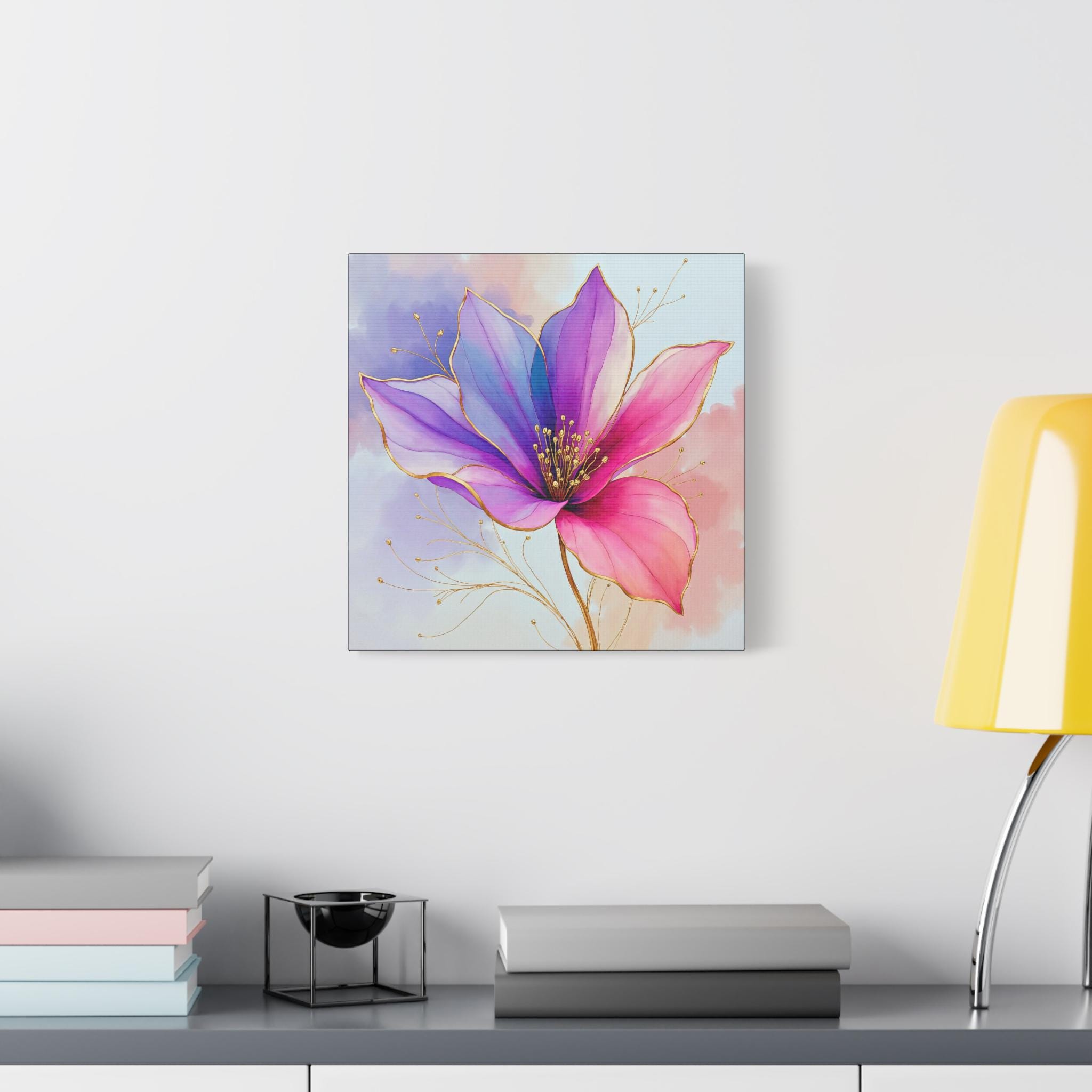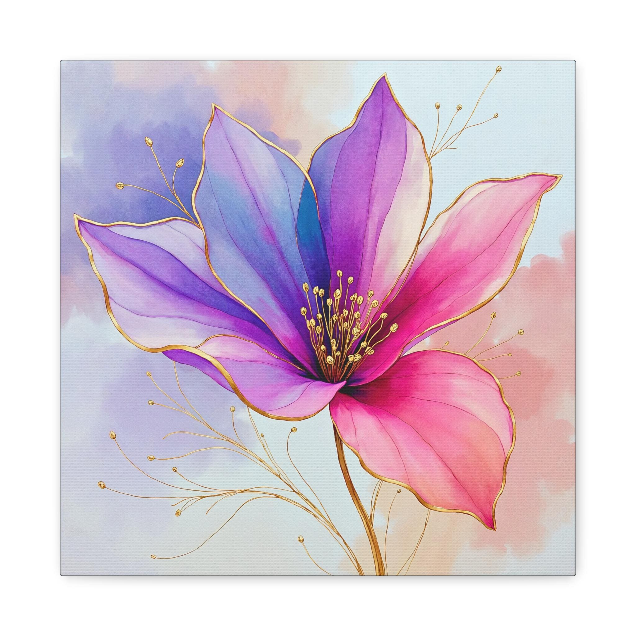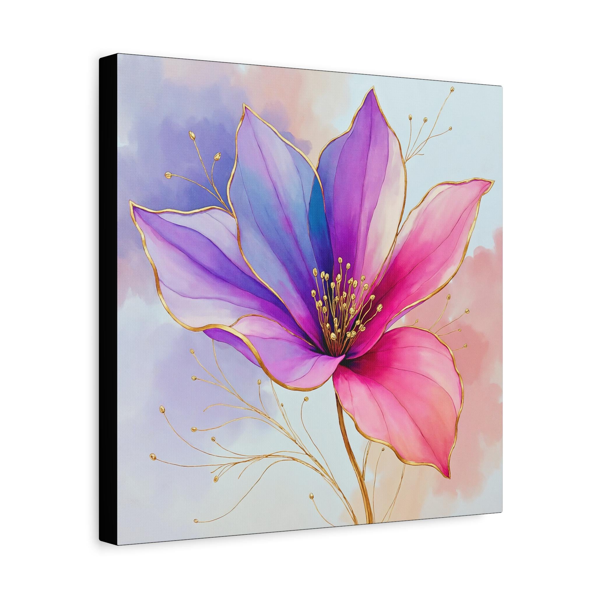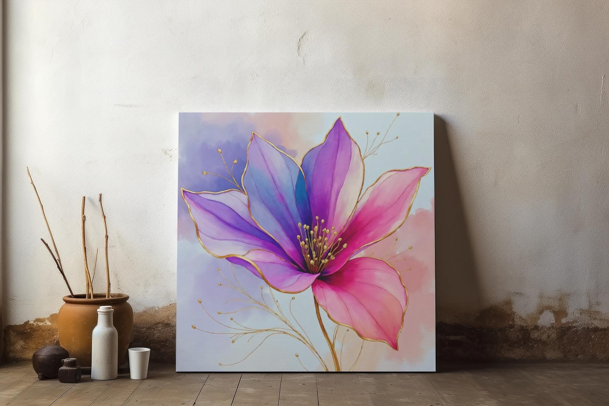 A luminous stretched canvas that brings a single floral bloom to life with watercolor softness and metallic accents. The delicate petals blend pinks, purples and blues against a misty pastel background, while subtle gold lines add an elegant, hand-painted feel. Lightweight yet sturdy, the canvas arrives ready to hang with built-in hanging hardware and soft rubber supports to keep it steady on the wall. It suits bedrooms, cozy reading nooks, and serene studio spaces — anywhere you want a gentle, uplifting focal point that reads like a quiet moment of color and calm.
