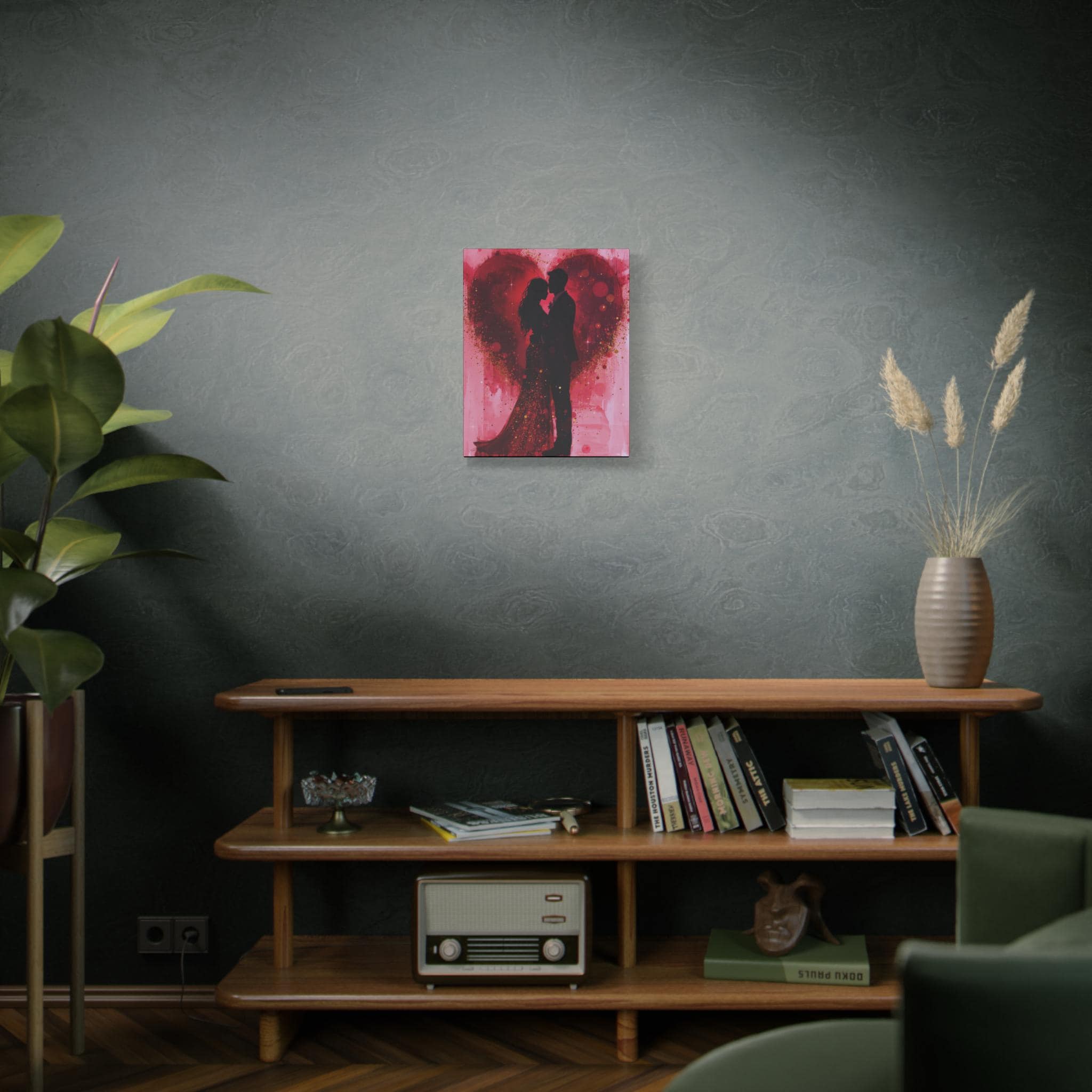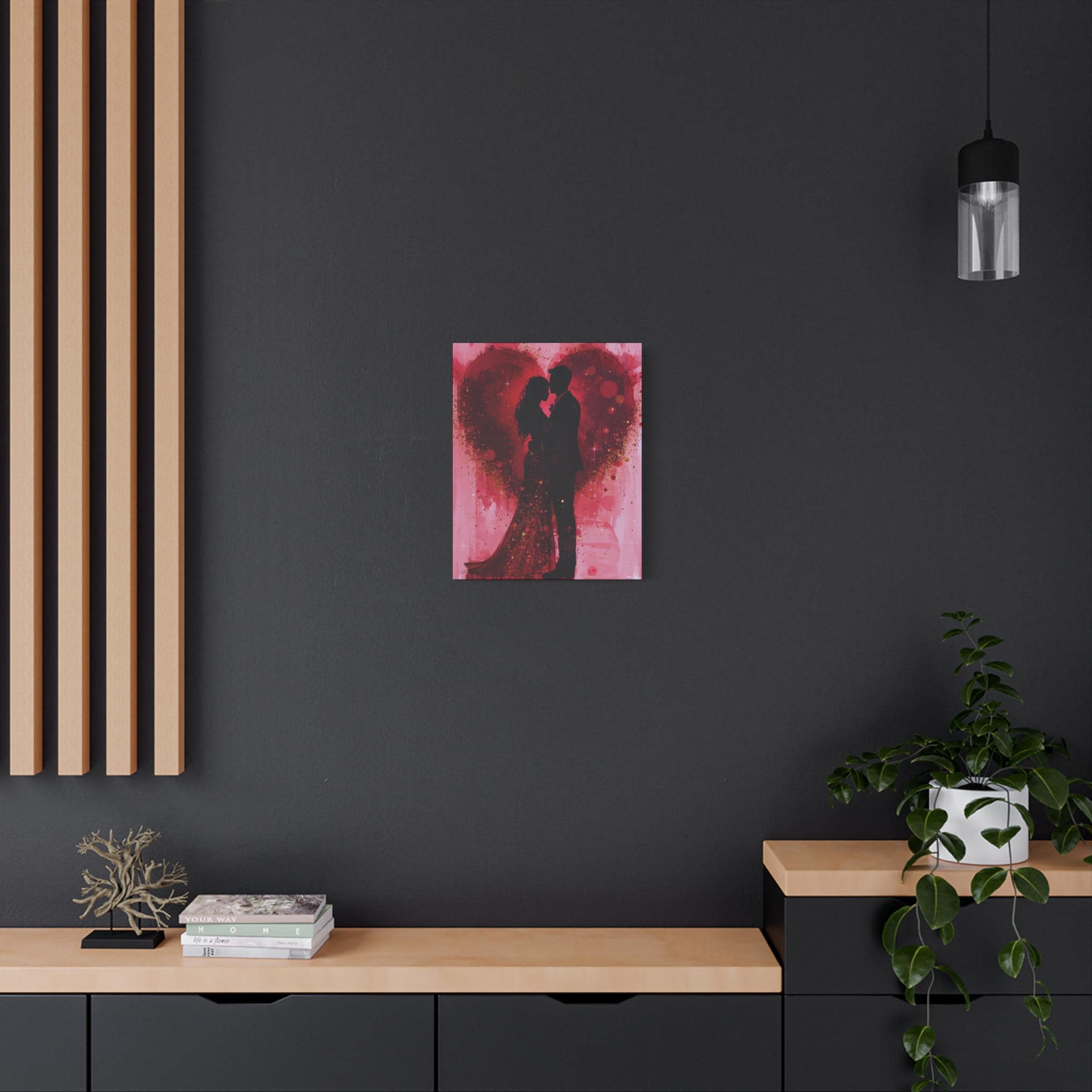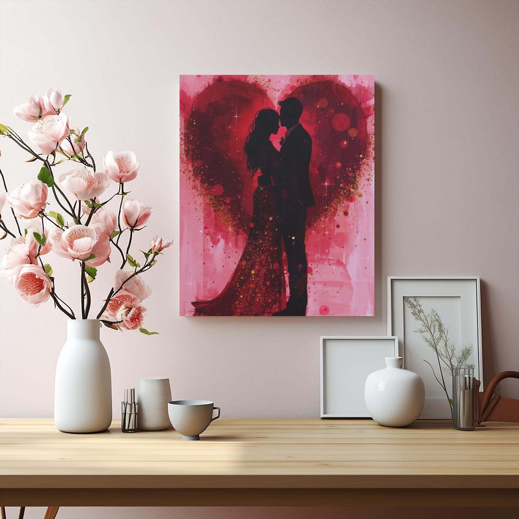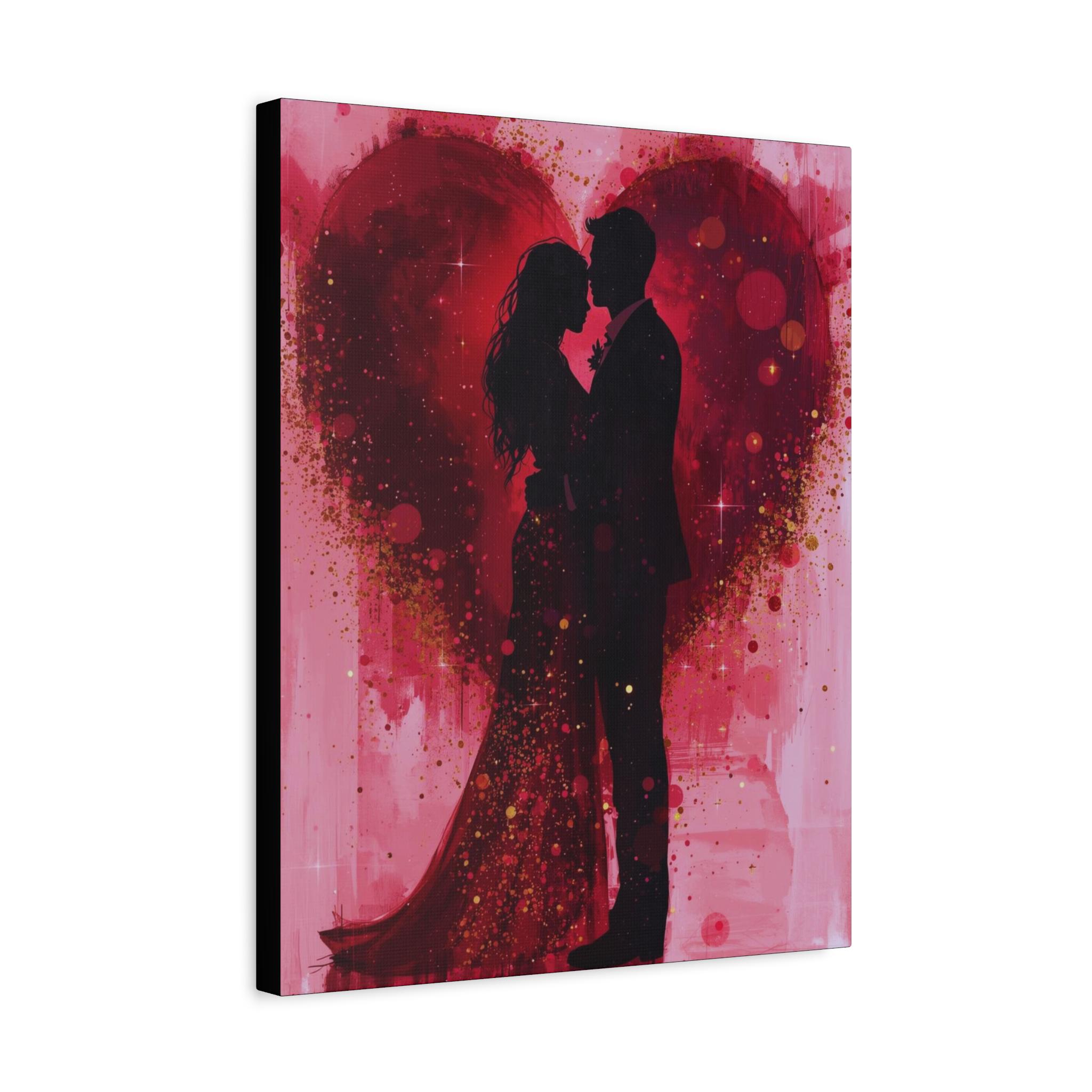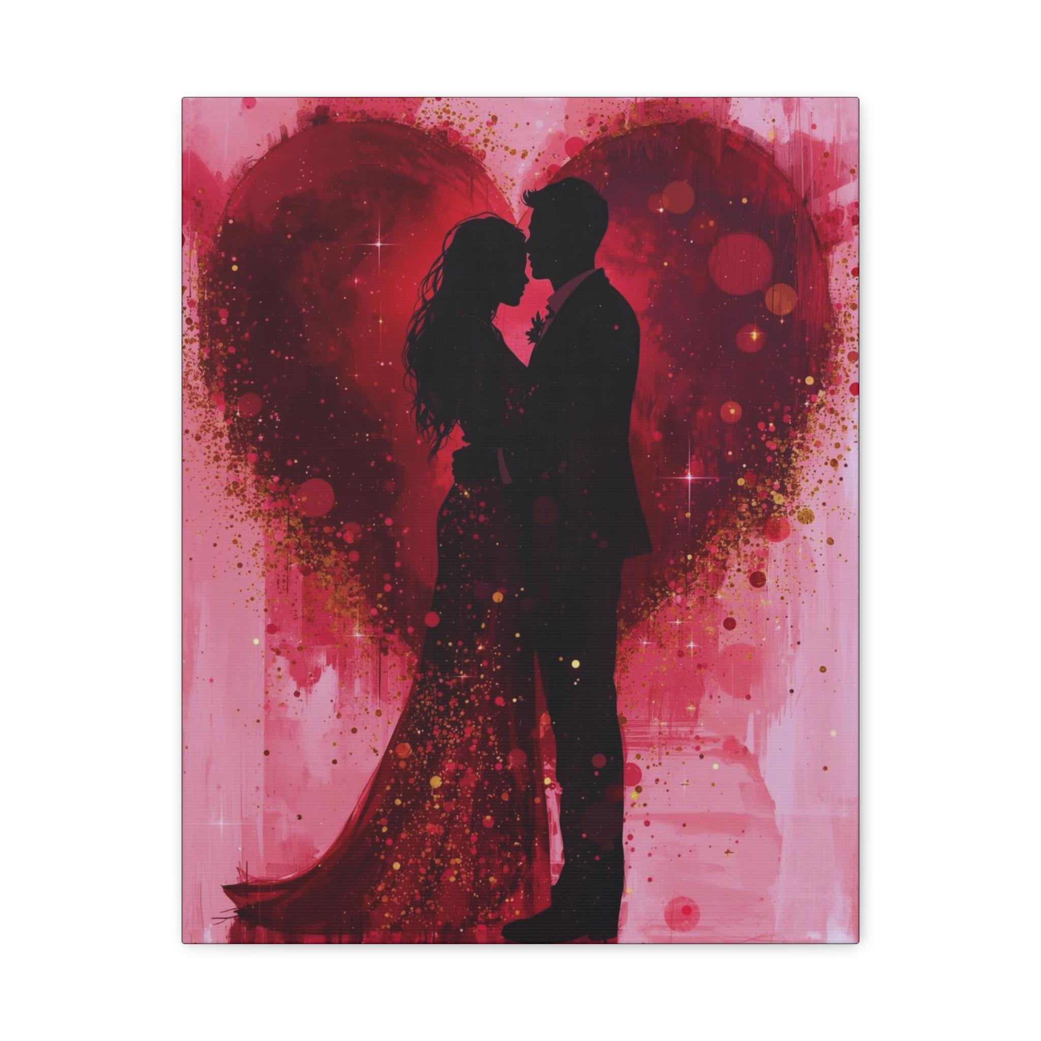 This stretched matte canvas captures an intimate, romantic moment in rich reds and soft pinks. A silhouetted couple stands embraced against a painterly heart, splashed with gold flecks and watercolor washes that suggest movement and warmth. The textured cotton-poly surface and matte finish lend an artful, gallery-quality presence while the slim 1.25" profile keeps the piece modern and easy to arrange. Hang it above a bedside table, over a mantel, or on a gallery wall to bring a quiet, heartfelt atmosphere to bedrooms, living rooms, or cozy nooks.