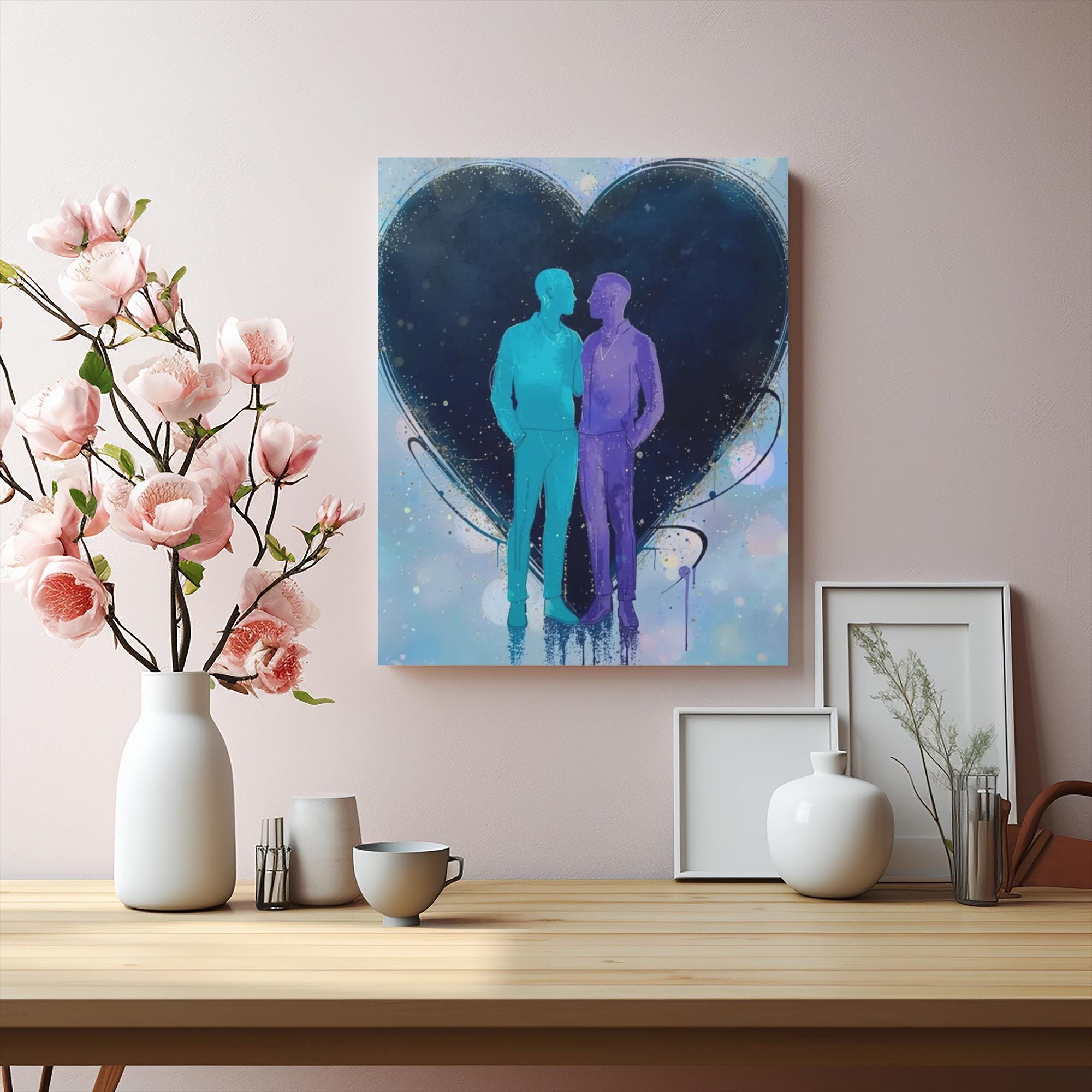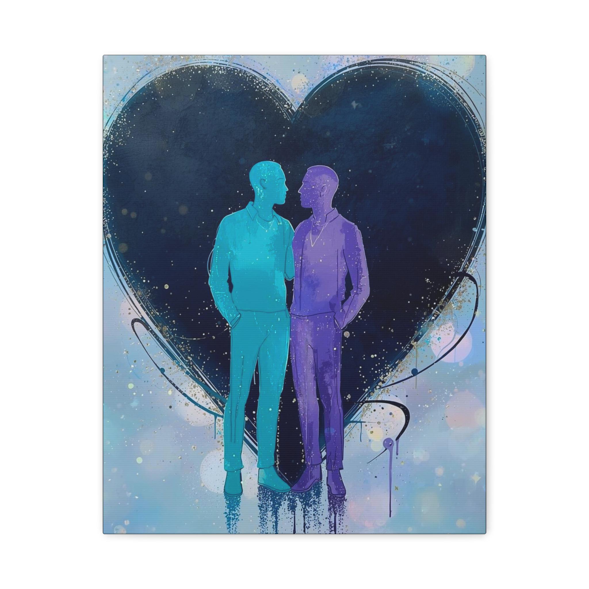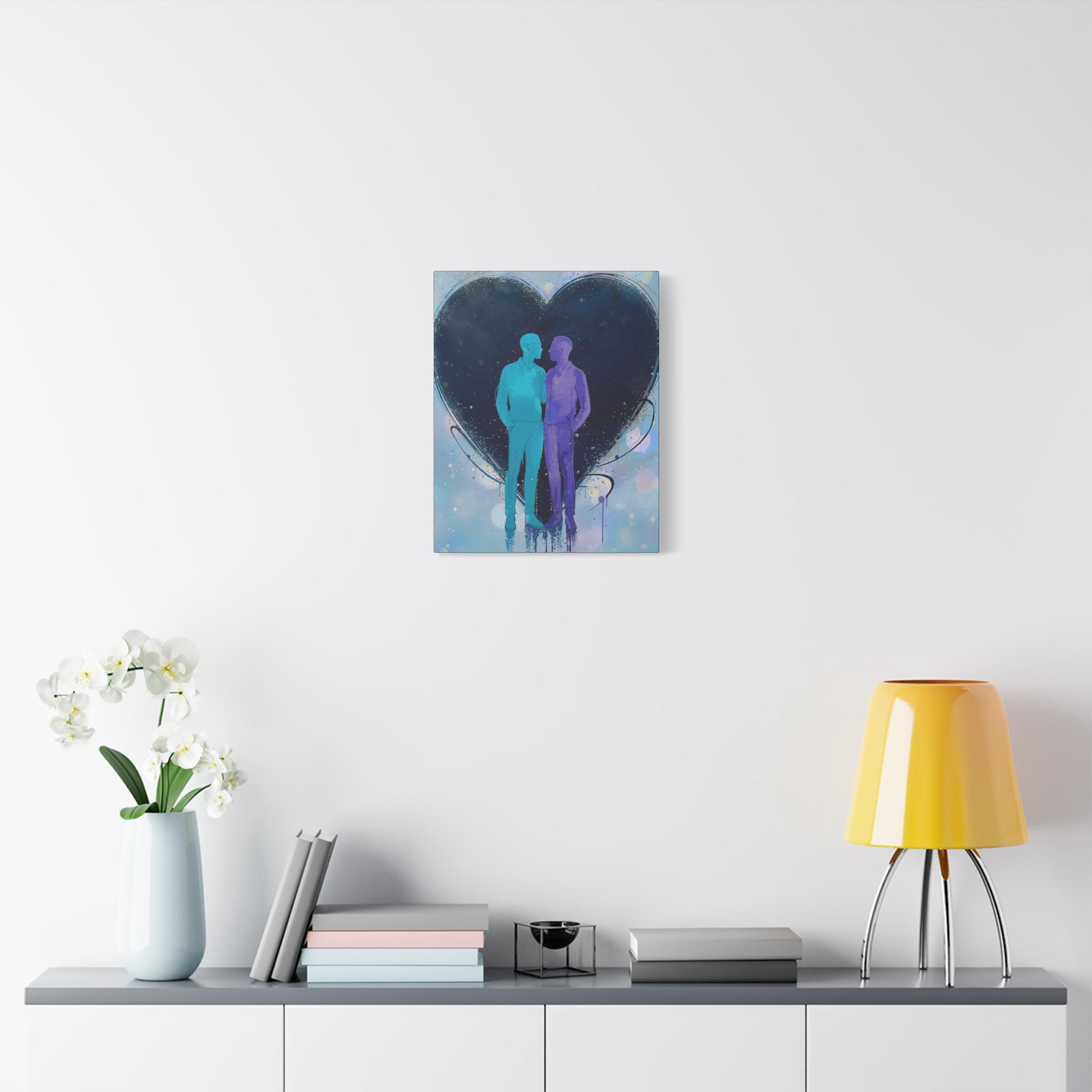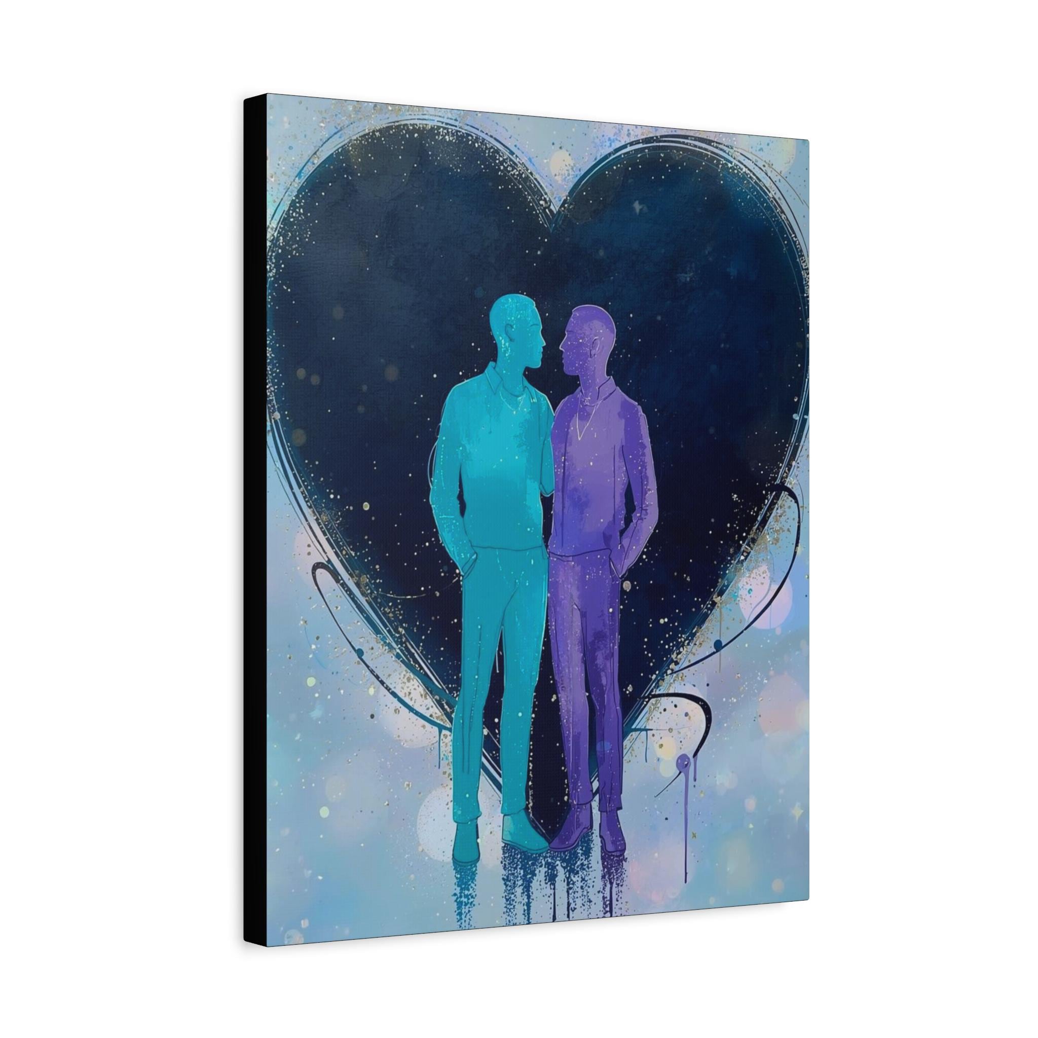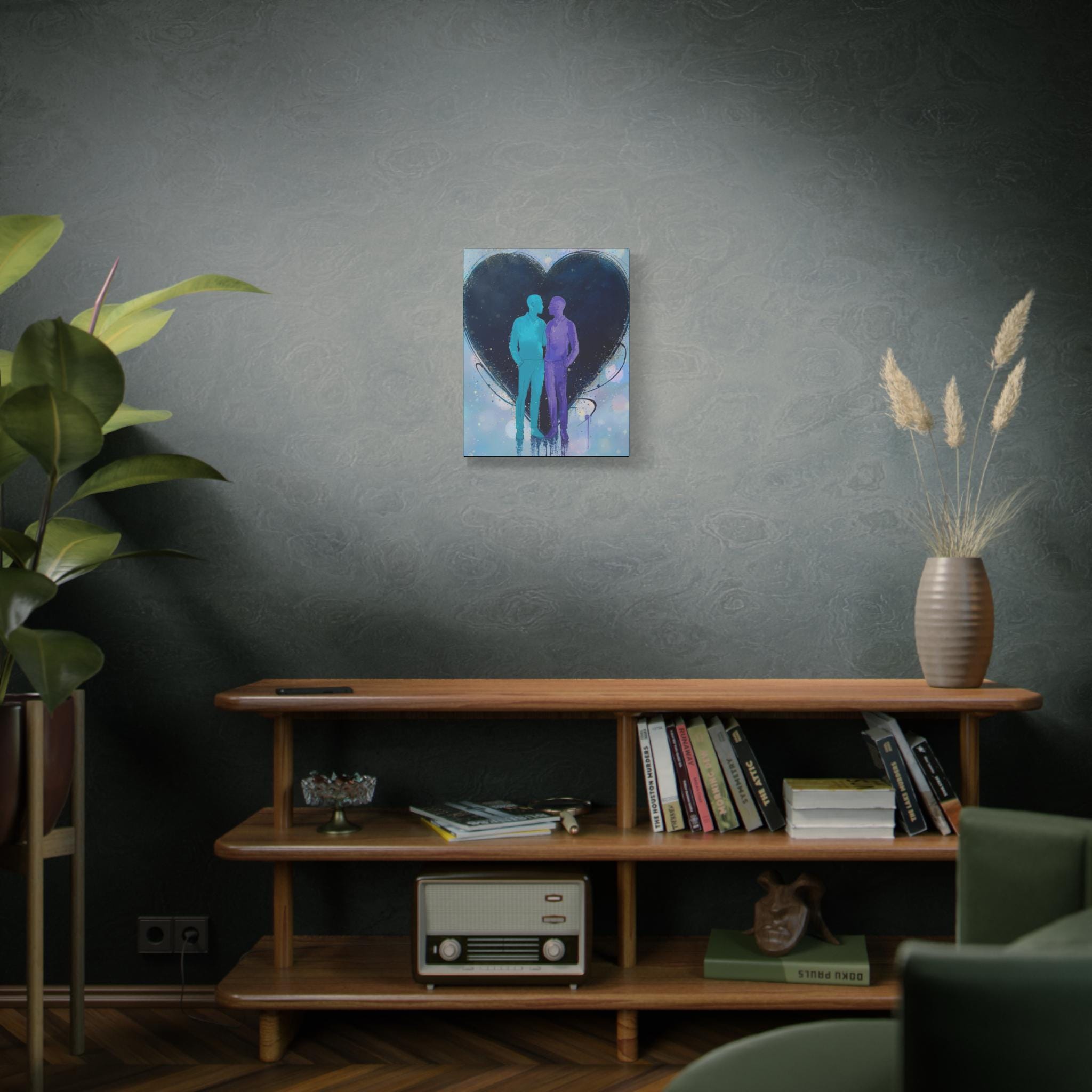 This stretched matte canvas captures a quiet, intimate moment between two figures framed by a large, hand-sketched heart. Soft washes of blue, purple, and pastel bokeh set a dreamy, evening mood — like the hush after city lights dim and two people find space to just be. The subtle texture of the cotton-poly canvas and rich, UL-certified Greenguard Gold inks give depth to the silhouettes and the layered paint details. Built on a slim 1.25" pine profile with back-hanging hardware and soft rubber support dots, it arrives ready to hang and hold its place on the wall. It fits rooms that favor gentle color palettes and meaningful, modern artwork — a quiet centerpiece that brings warmth and a sense of closeness to bedrooms, living rooms, or cozy reading nooks.