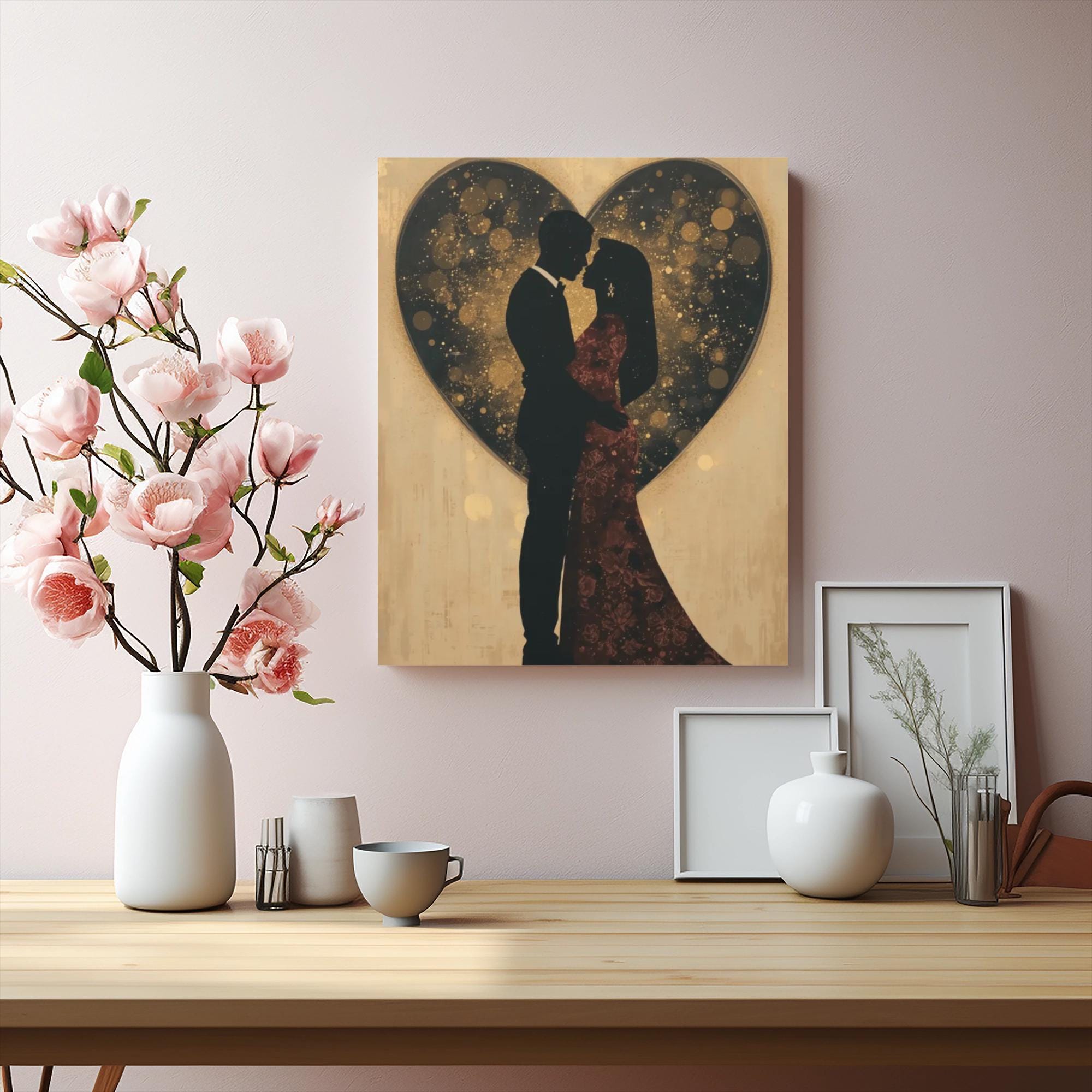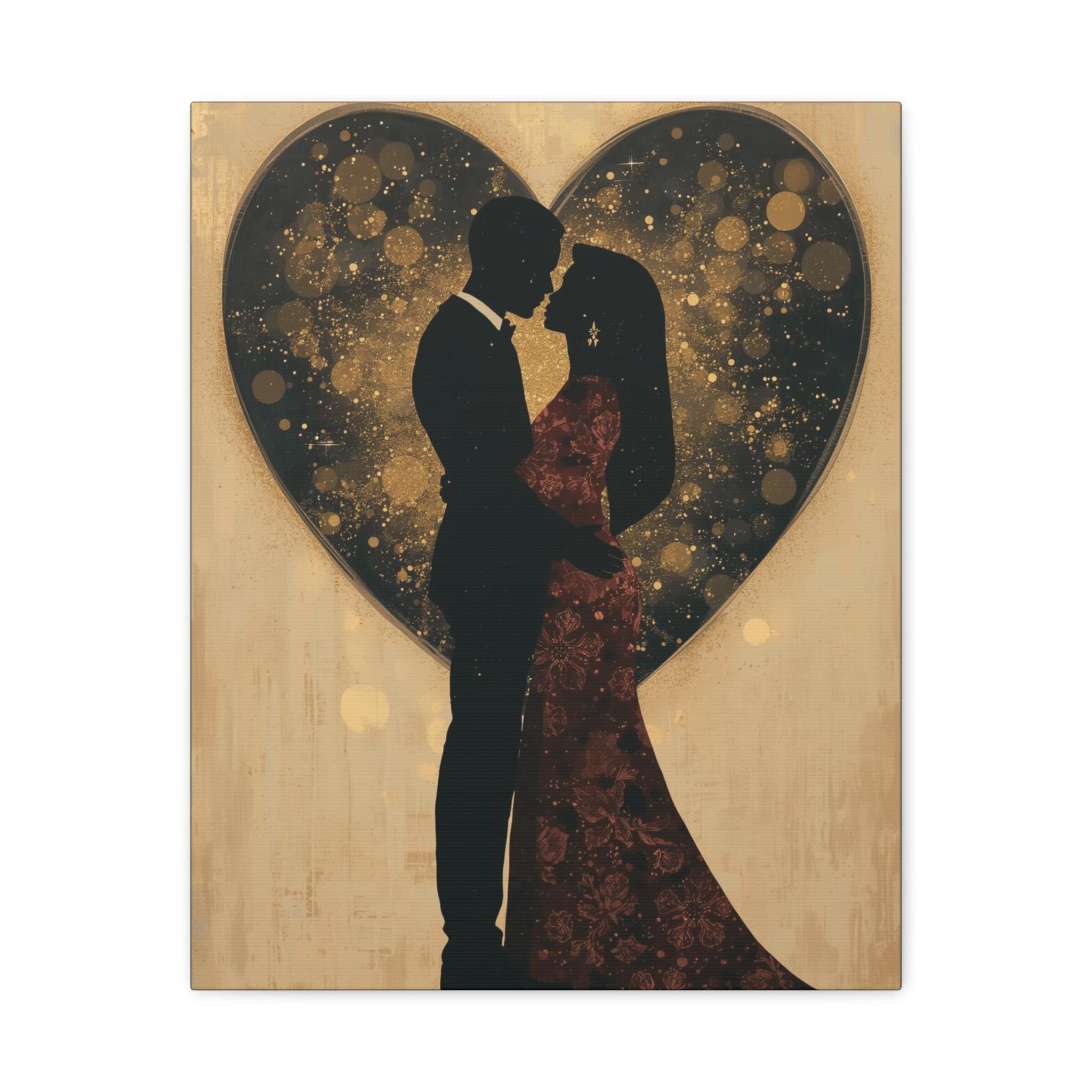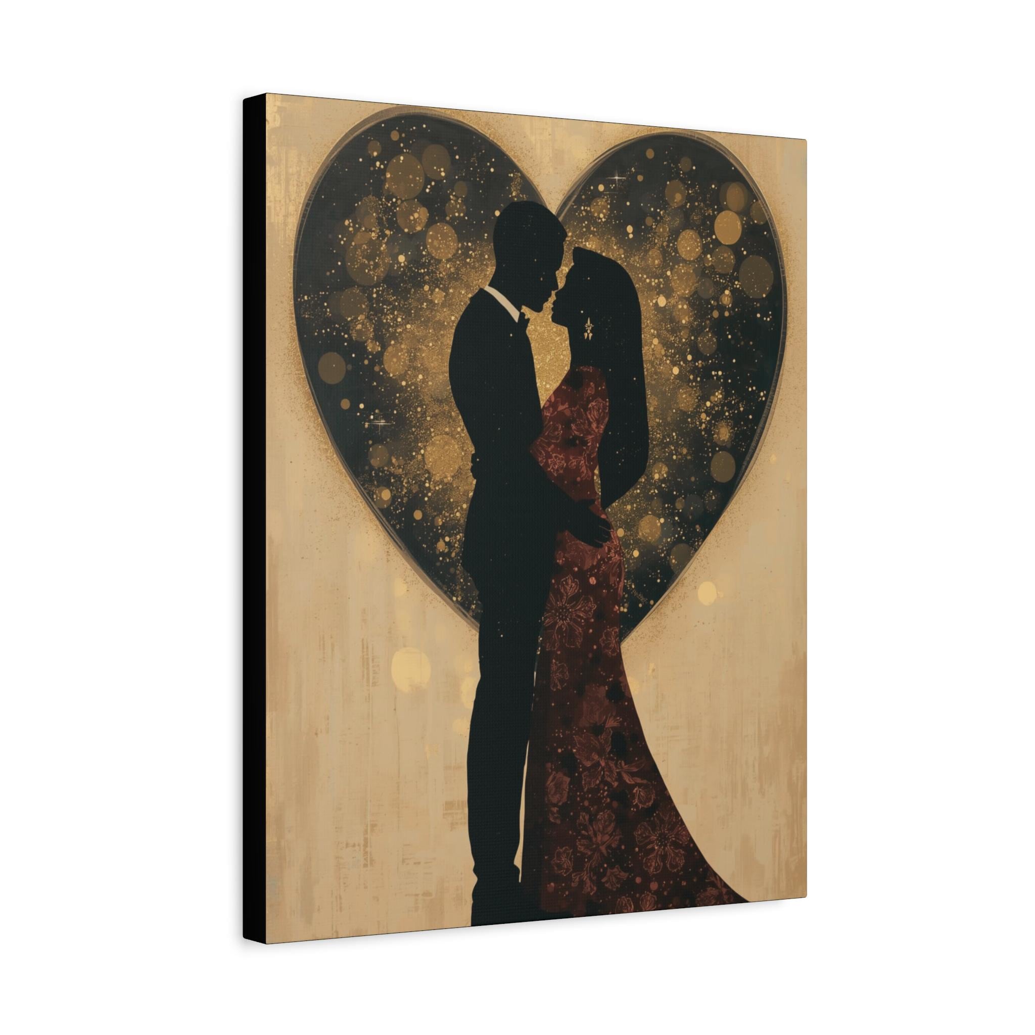 A stretched matte canvas that captures a tender silhouetted couple framed by a softly glowing heart. Warm golds and deep blacks create a romantic, slightly vintage mood — like a quiet dance under soft lights. The image’s textured background and subtle bokeh lend depth and emotion, making it an intimate focal point for bedrooms, living rooms, or cozy nooks. Lightweight yet sturdy, the canvas arrives ready to hang with soft rubber dots to protect surfaces and an inner pine frame that keeps the image taut and true. It’s a thoughtful way to mark anniversaries, engagements, or quiet evenings at home — a piece that encourages lingering and memory-making.
