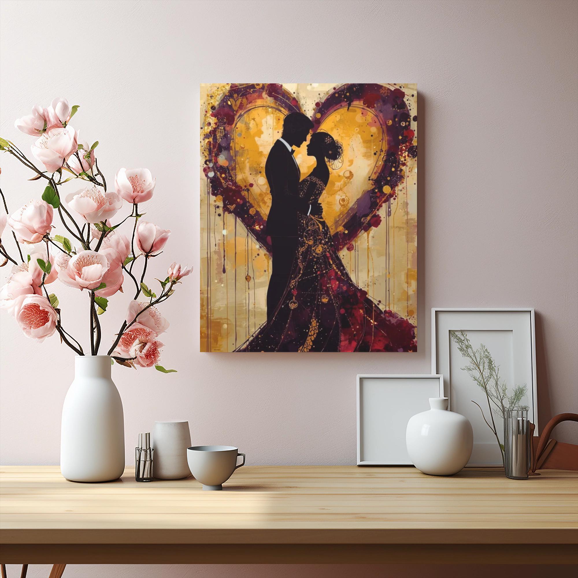 This stretched matte canvas captures an intimate moment between two silhouettes against a dripping, heart-shaped wash of warm golds and deep burgundy. The soft matte finish tames glare and brings out the layered texture of the painterly background, while the slim 1.25" depth gives a modern, gallery-ready profile. Hang it above a mantel, in a bedroom, or near an entry to set a romantic, artful tone that feels both handcrafted and contemporary. The natural pine stretcher and discreet rubber dots keep the piece steady and subtly raised from the wall, so the image reads like a framed keepsake without the bulk of glass or a heavy frame.