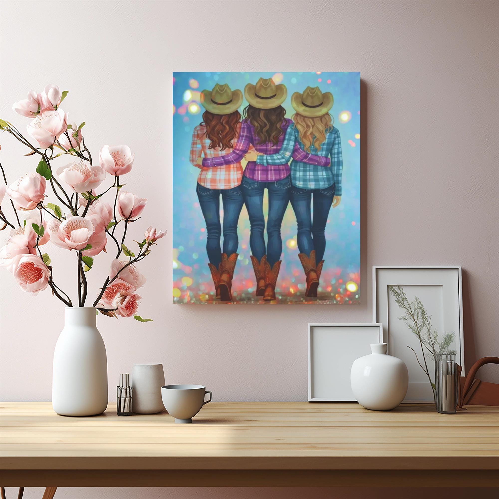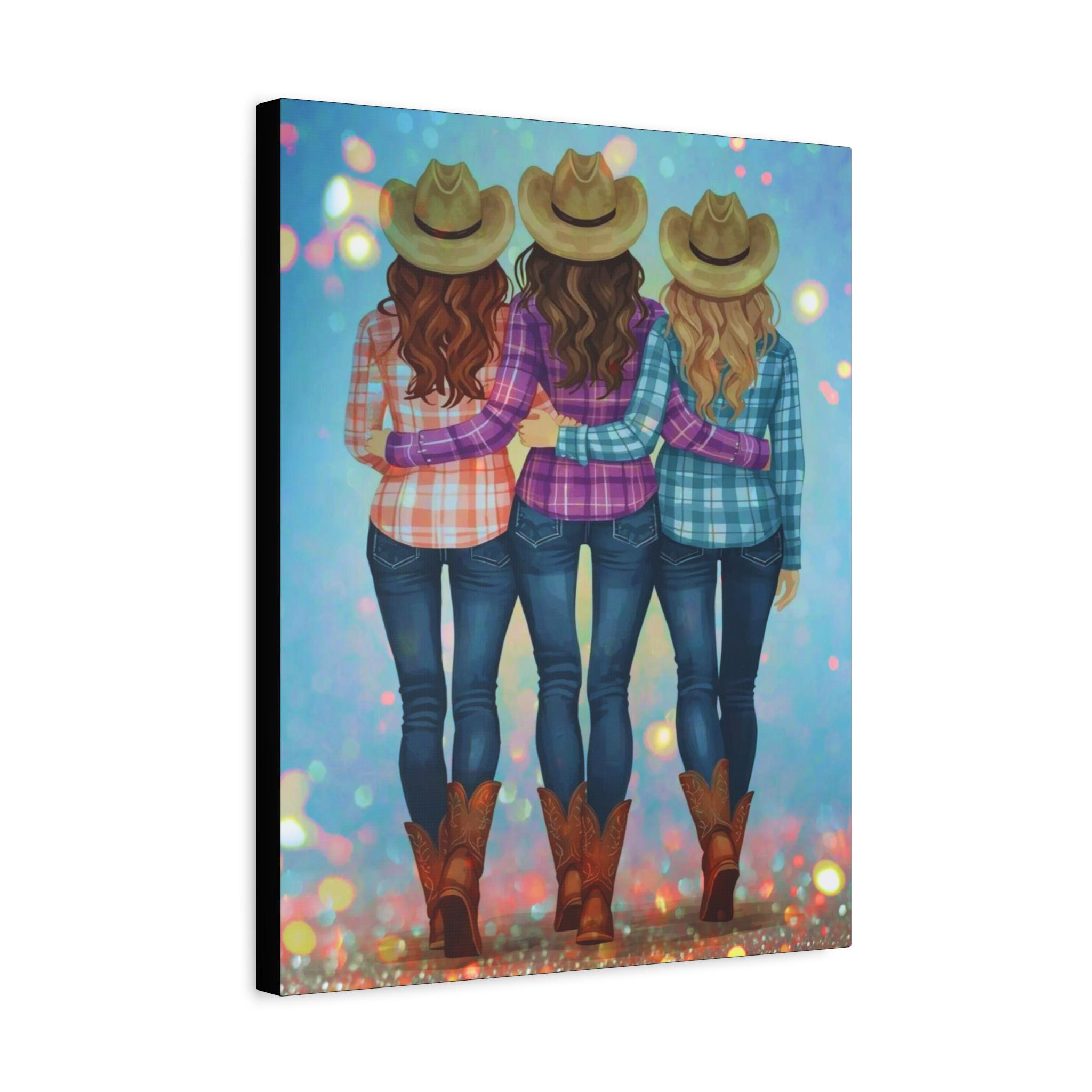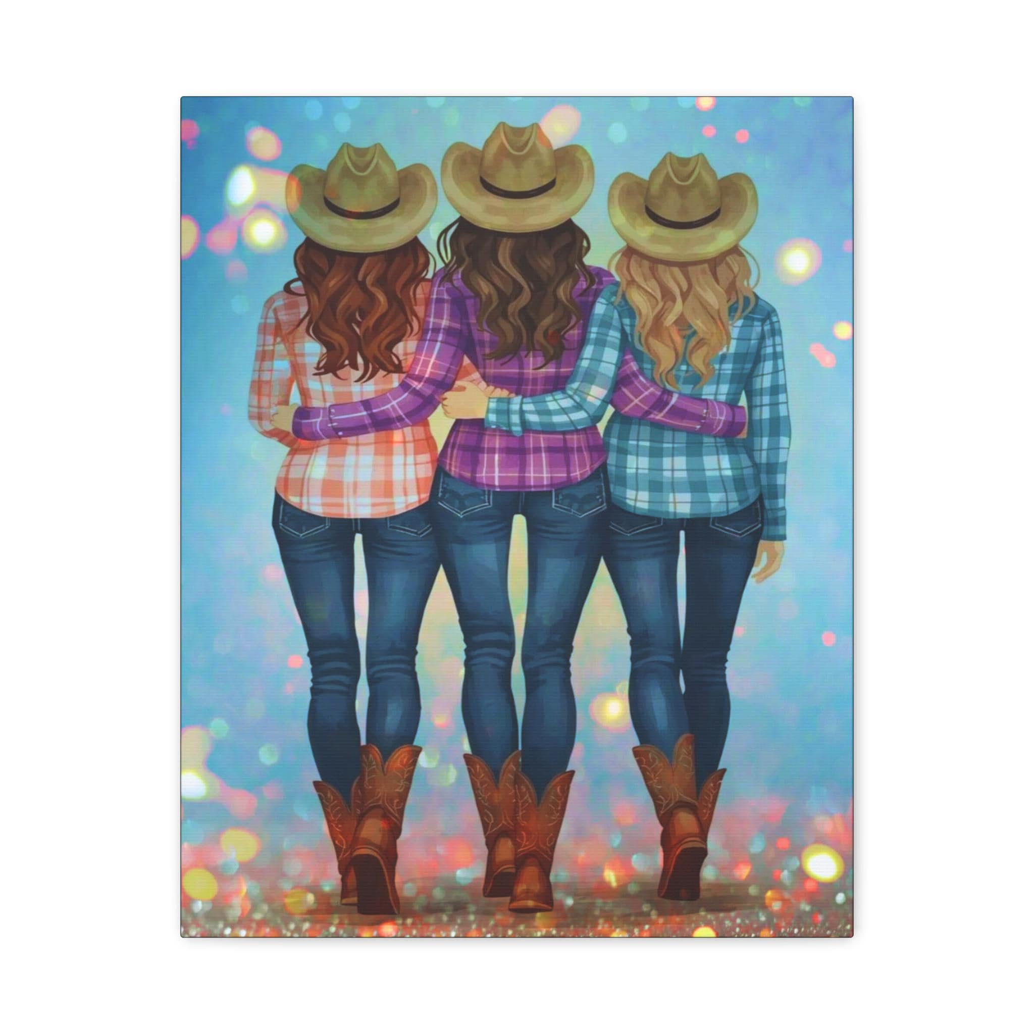 Lean into warm, country-side camaraderie with this stretched matte canvas featuring three cowgirls walking arm-in-arm. The soft, painterly colors and bokeh-like sparkles give the scene a gentle, nostalgic glow — like the hush after a summer fair or the laugh-filled walk home from a backyard bonfire. Hung in an entryway, over a sofa, or in a cozy den, it invites memories of long friendships, shared nights under string lights, and the easy confidence of women who ride together. The textured matte finish keeps reflections low and emphasizes brush like detail, while the solid pine stretcher and subtle rubber feet make the piece feel sturdy and intentionally made for lived-in spaces.
