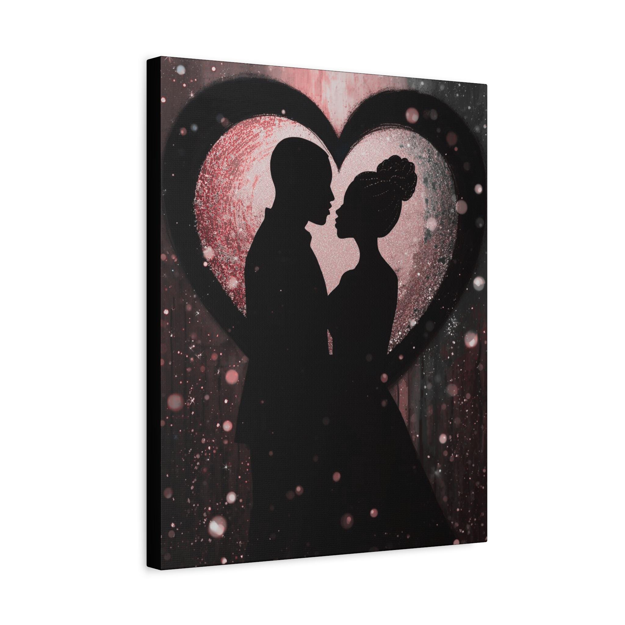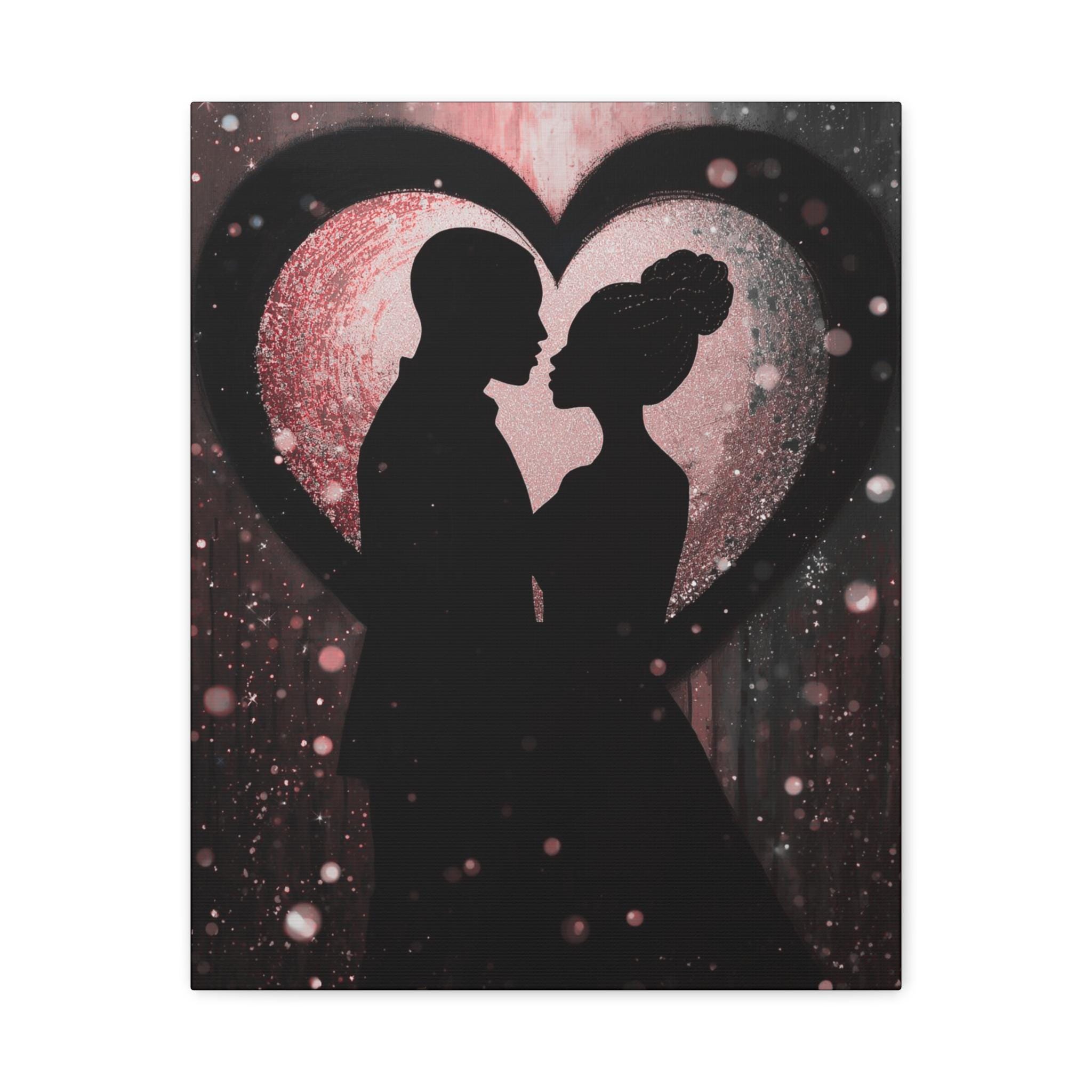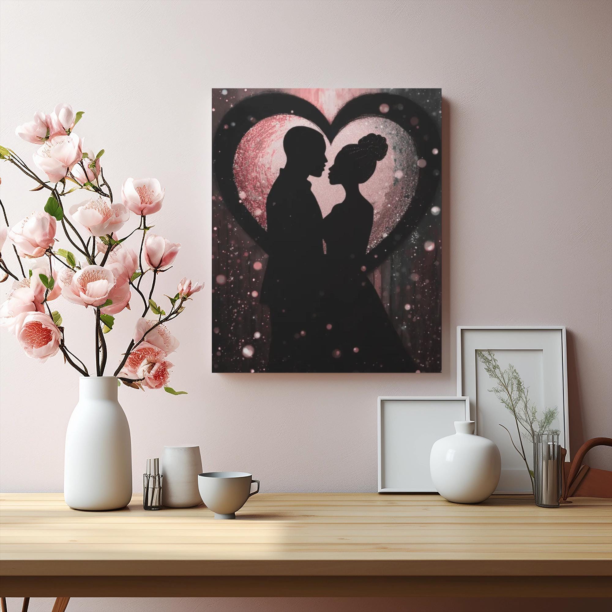A matte stretched canvas that captures a quiet, intimate moment between two silhouettes framed by a soft heart and drifting flecks of light. The deep, velvety blacks and muted rose tones create a nostalgic, romantic atmosphere — like a private dance beneath softly falling snow. Hung in a bedroom, entryway, or cozy reading nook, this canvas brings a gentle, sentimental presence to any room and holds its warmth without glare thanks to the matte finish.