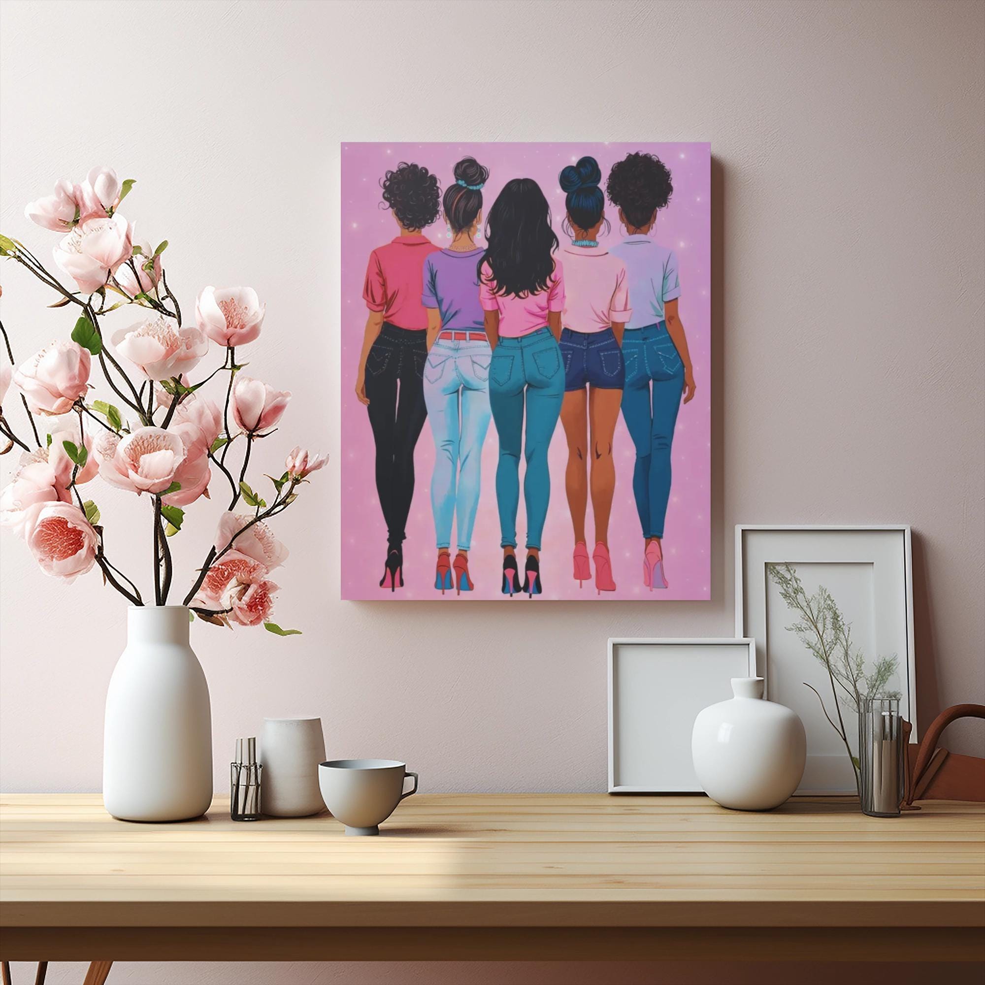 This stretched matte canvas captures a warm moment of sisterhood and confidence. Five women stand shoulder-to-shoulder against a soft pink, star-speckled background — each with distinct hair, skin tone, and denim — creating a vibrant statement piece that celebrates friendship and diversity. The subtle matte finish keeps glare low and emphasizes the illustration’s colors and textures, while the slim 1.25" profile gives it a clean, modern presence on the wall. Hang it in bedrooms, living rooms, or studio spaces to bring a cozy, empowering energy to the room. The durable pine frame and high-quality inks mean the scene stays bright and true for years, and soft rubber feet protect surfaces when displayed on shelves or ledges.