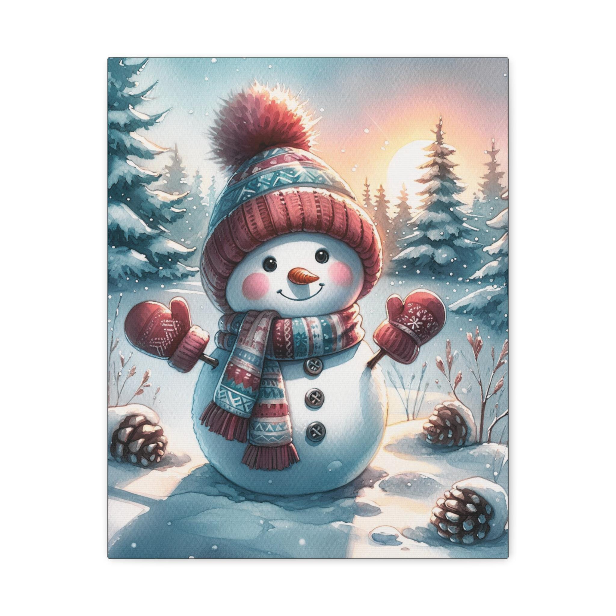 Warmth in winter light: a matte stretched canvas that brings a gentle, whimsical snow-scene into your room. A cheerful snowman in a knitted hat and mittens stands in softly falling snow, backlit by a rosy sunrise that makes the pine boughs glow. The textured matte finish softens glare and adds painterly depth, while vibrant, UL-certified Greenguard Gold inks keep colors rich and true. Hung above a mantle or leaning on a hallway console, this canvas creates a small, cozy narrative—like a quiet walk-through fresh snow with the world just waking up.