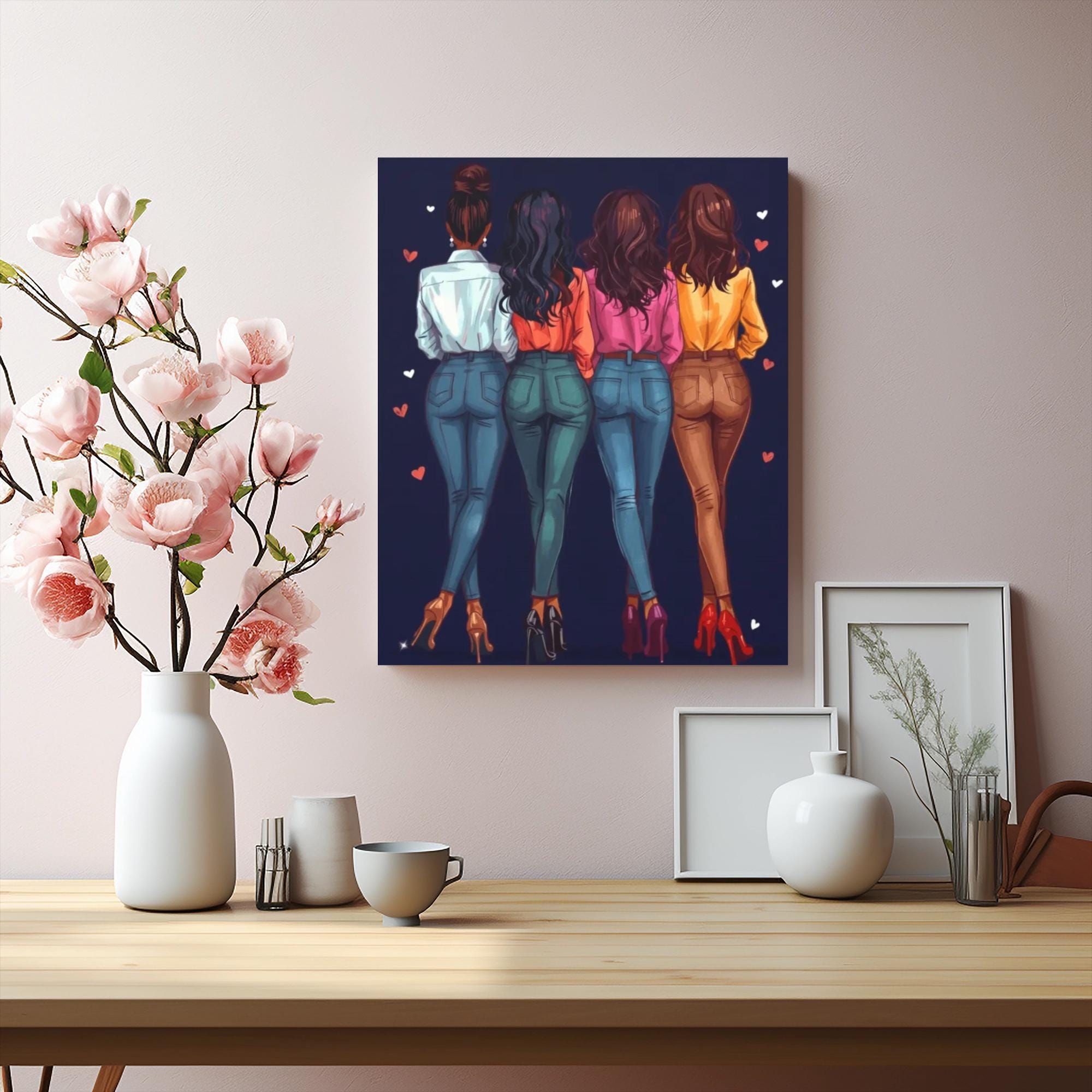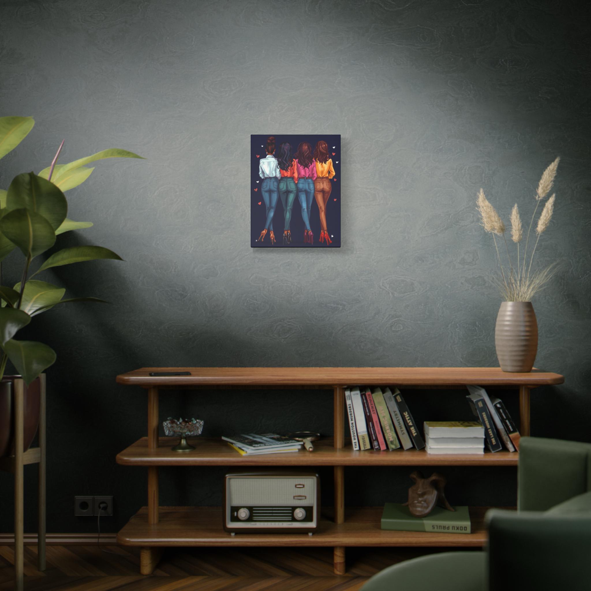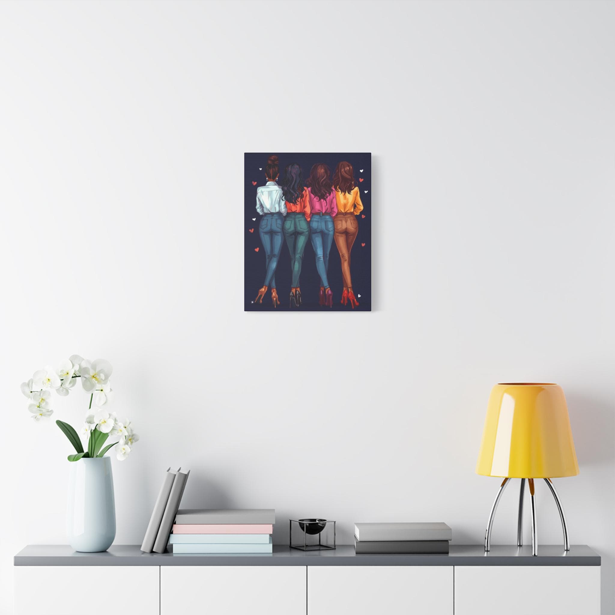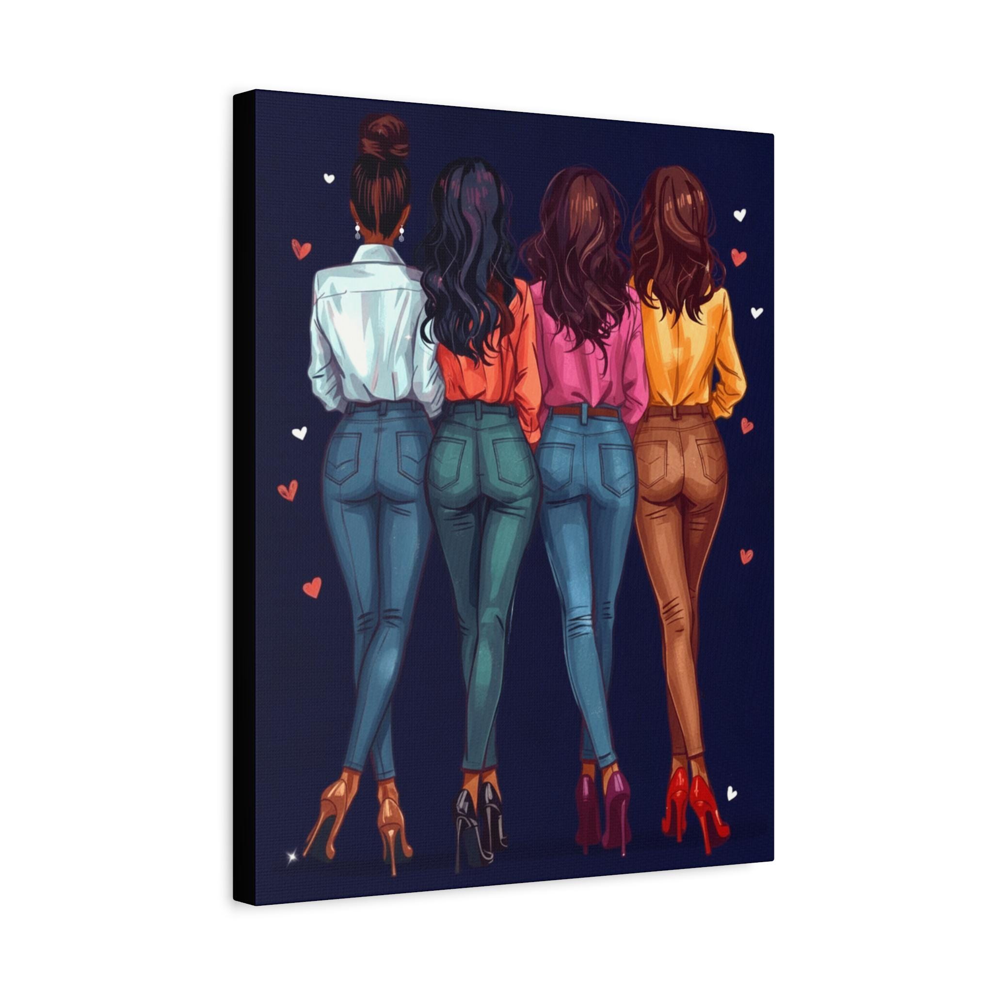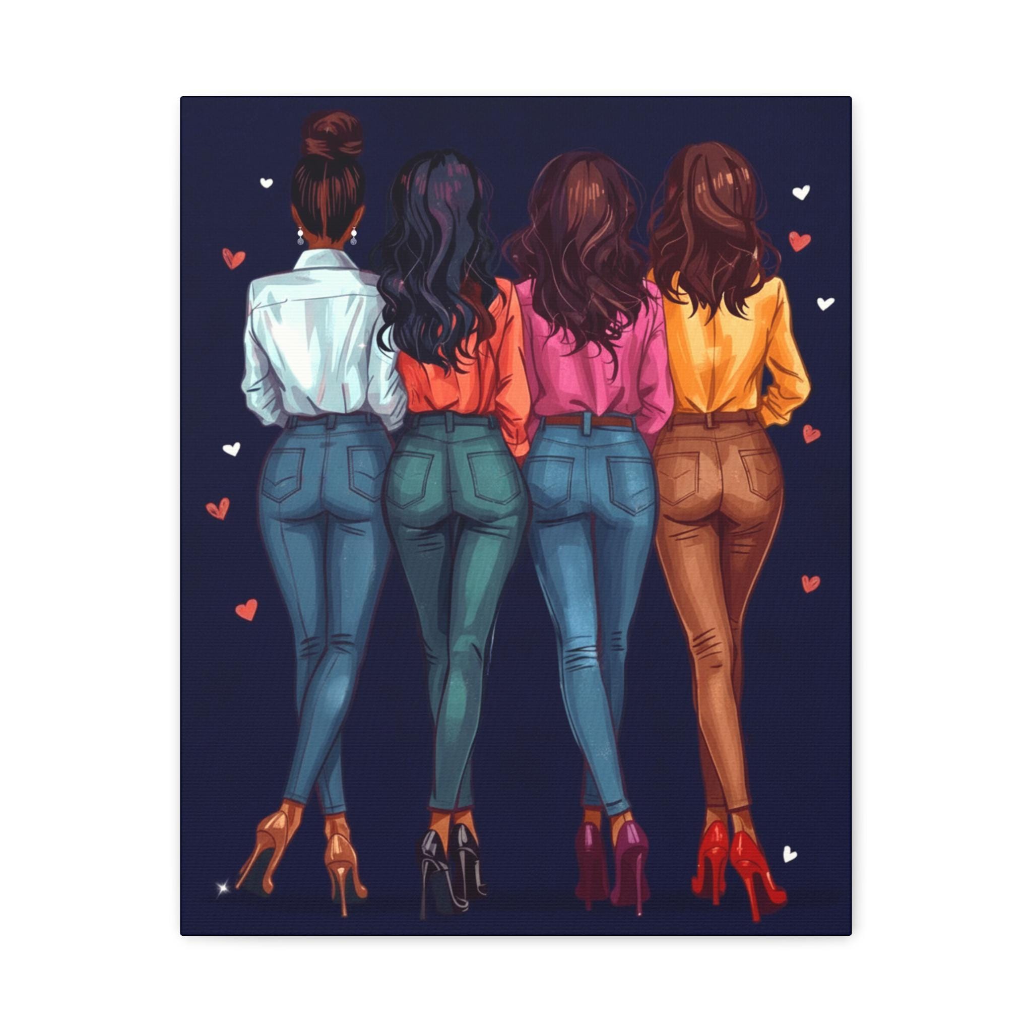 Four friends, standing shoulder to shoulder, captured from behind in bold, fashion-forward colors. This stretched matte canvas brings a moment of friendship and confidence into any room — the vivid navy background makes the warm hues of shirts and heels pop, while small heart accents add a playful, affectionate touch. The artwork feels like a late-night laugh, a shared secret, and the quiet pride of showing up for each other. Hung in a bedroom, dressing room, or living space, it adds warmth and a stylish reminder of chosen family and lasting bonds.