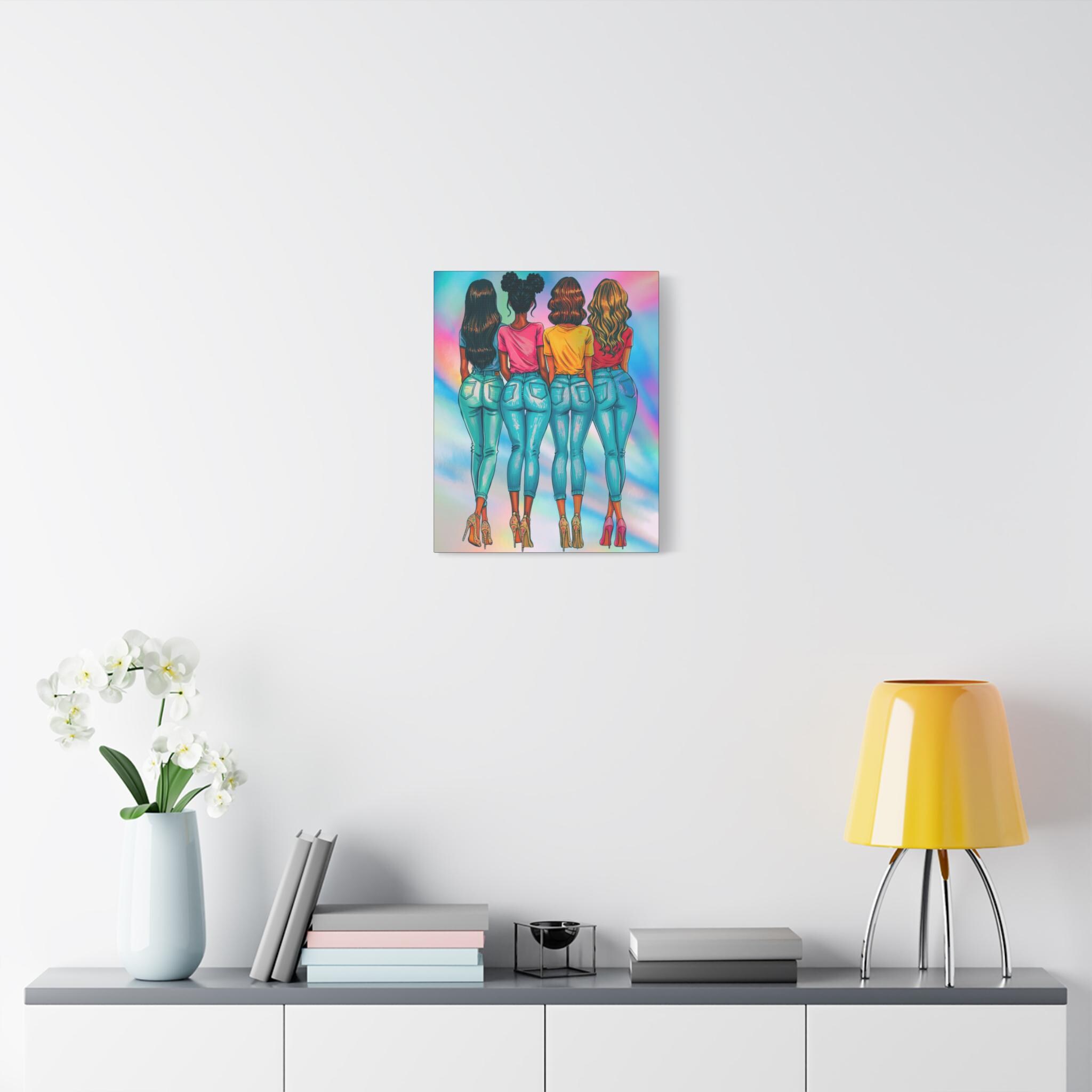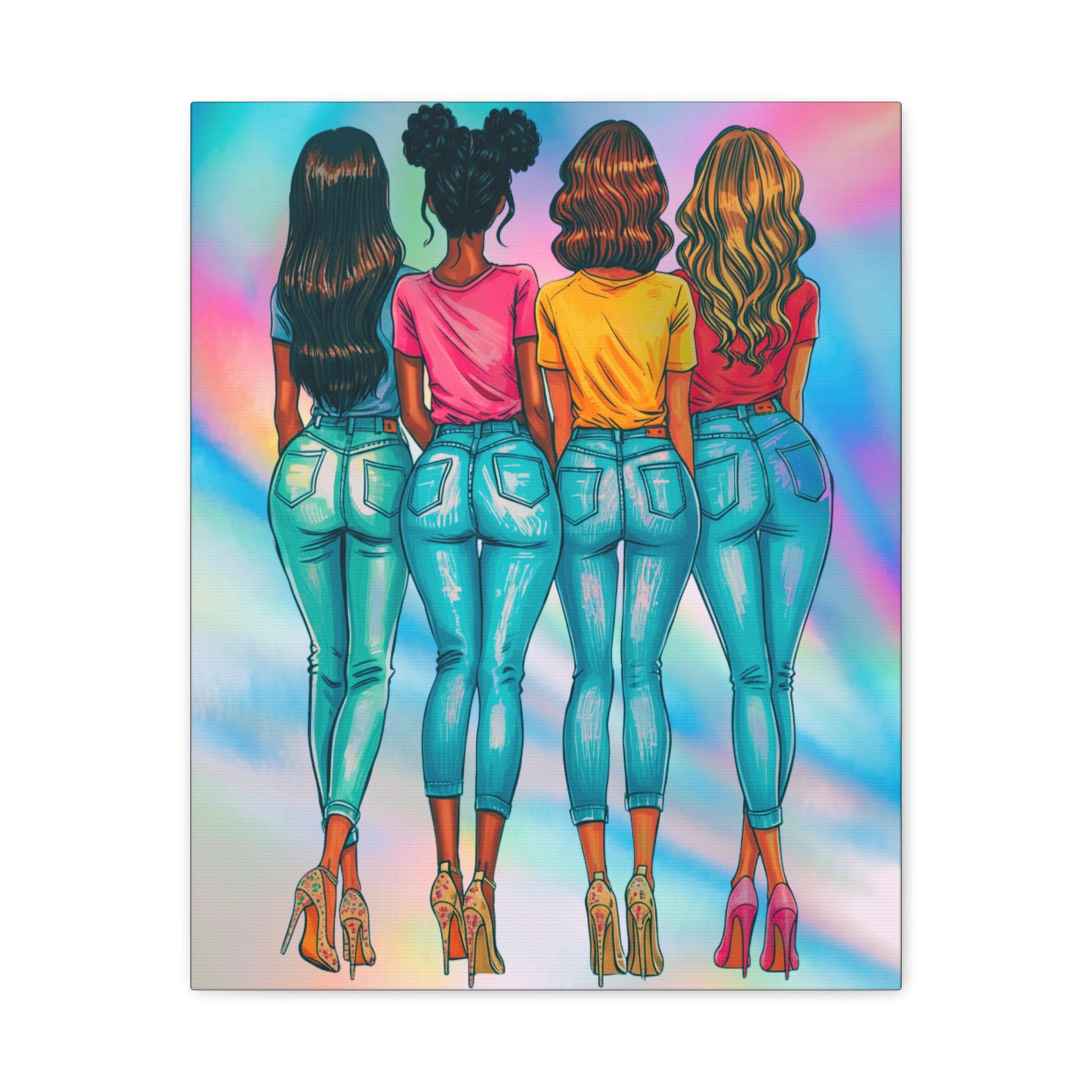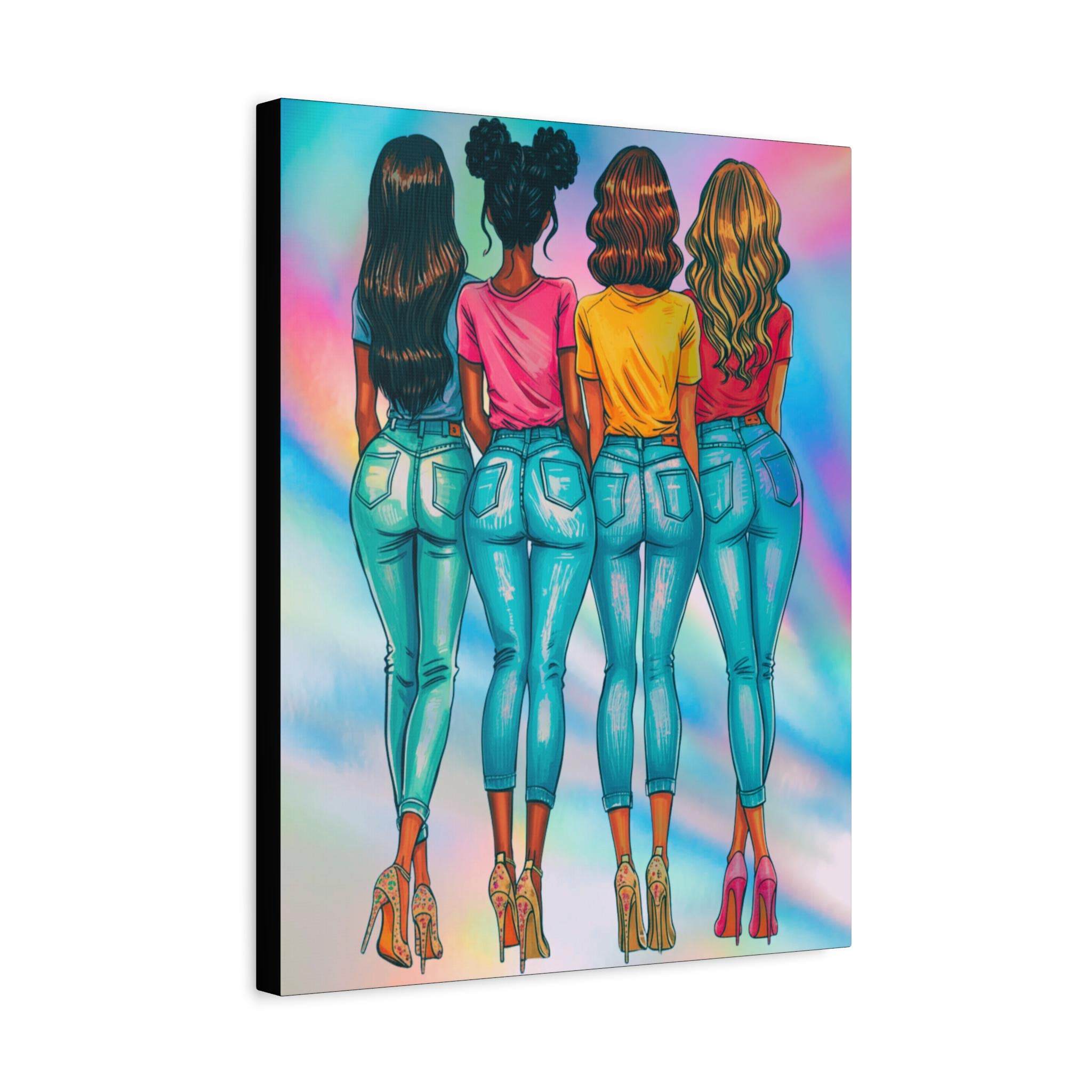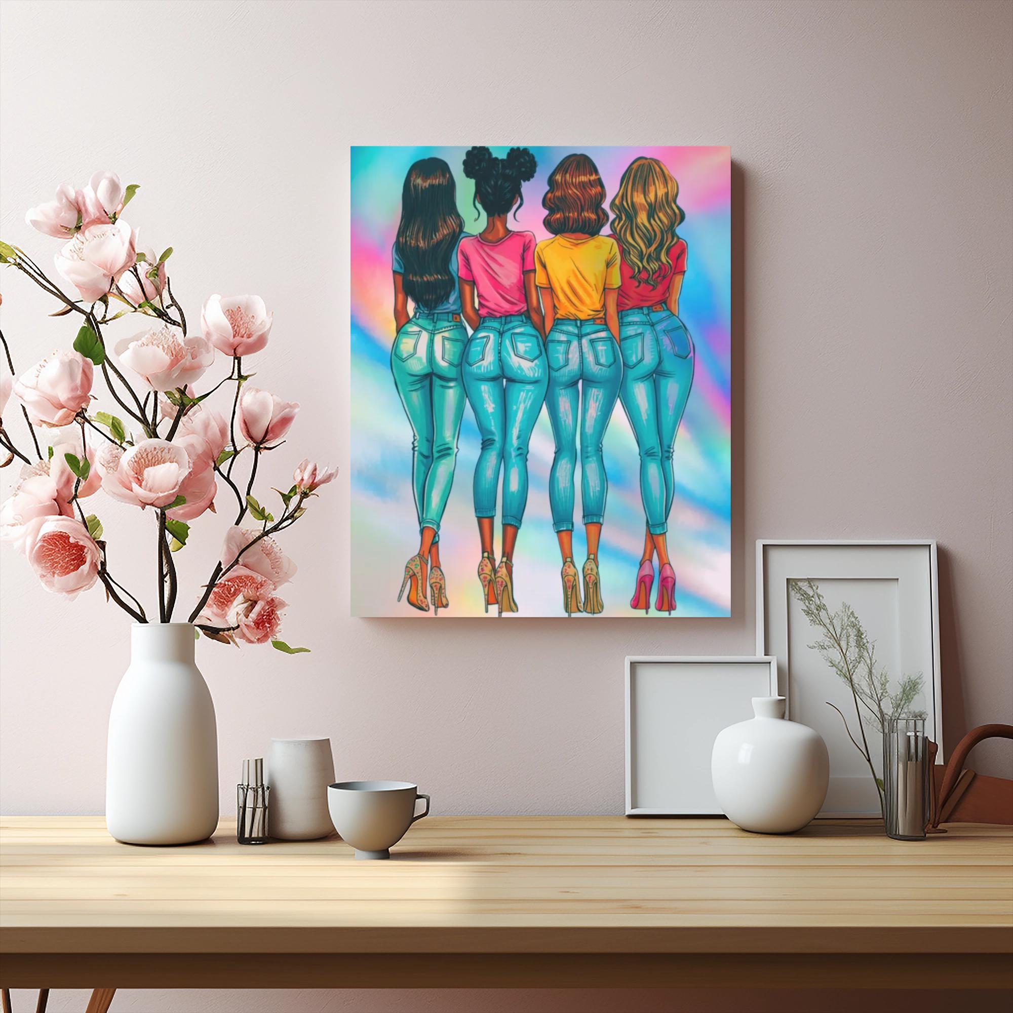 Bright, bold canvas art that celebrates friendship and style. Four women stand side-by-side, confident and chic, rendered in vivid color against a soft, iridescent backdrop. The matte stretched canvas gives each brushstroke and color transition a velvety finish, while the wrapped pine frame and subtle rubber feet mean it arrives ready to hang and stay put. It slides into living rooms, dressing rooms, or studio walls where personality and sisterhood are on display — an upbeat, modern accent that feels like a snapshot of laughter, late-night plans, and shared memories.