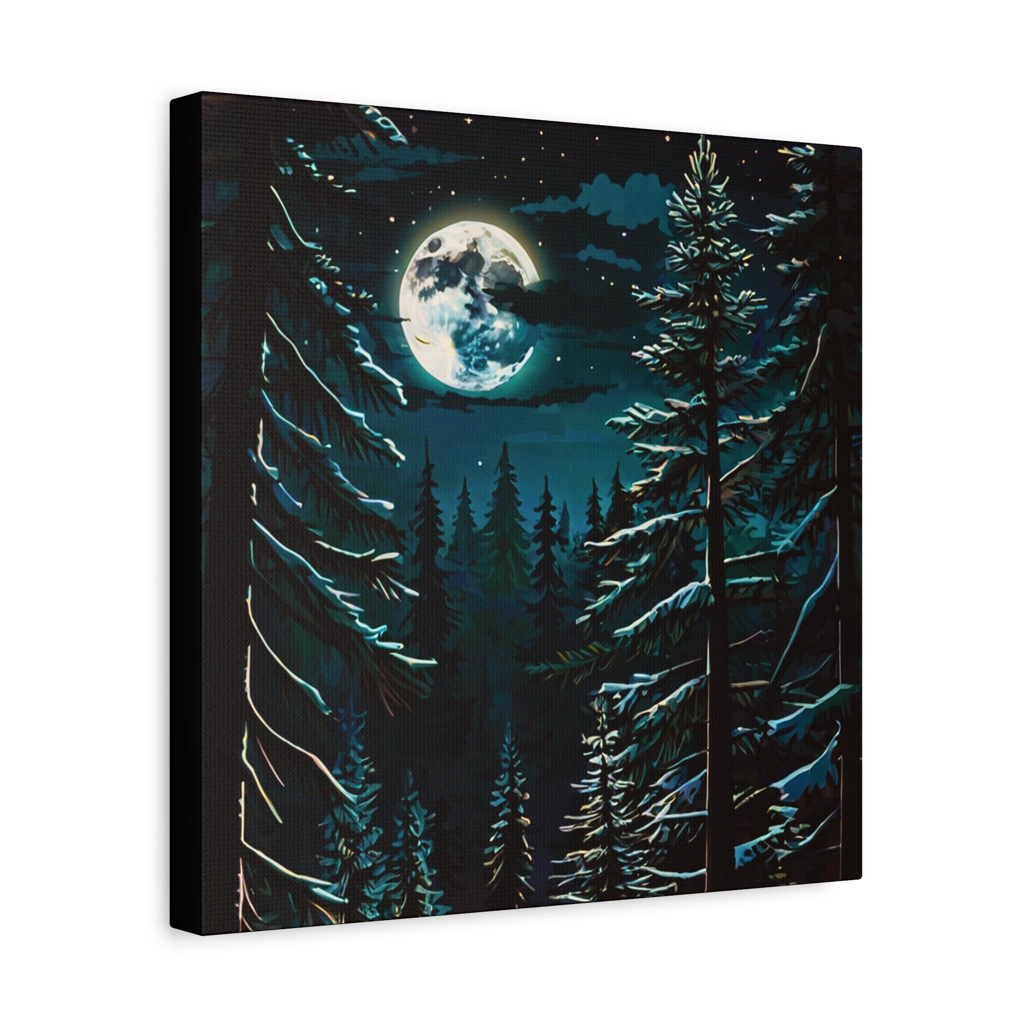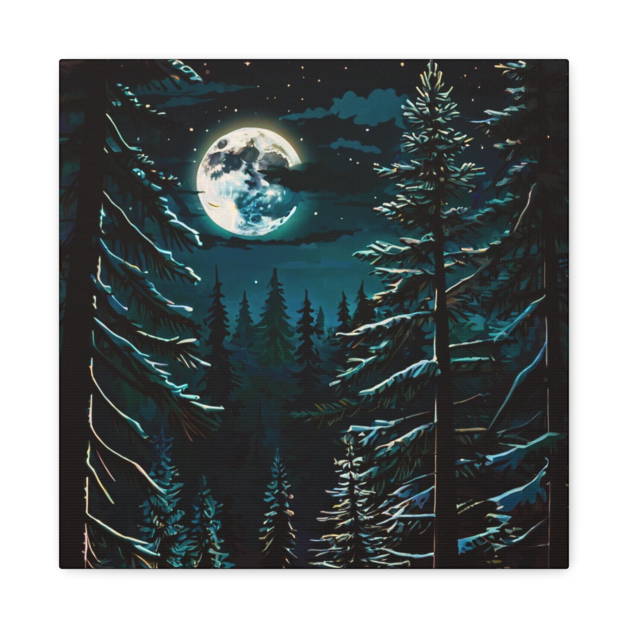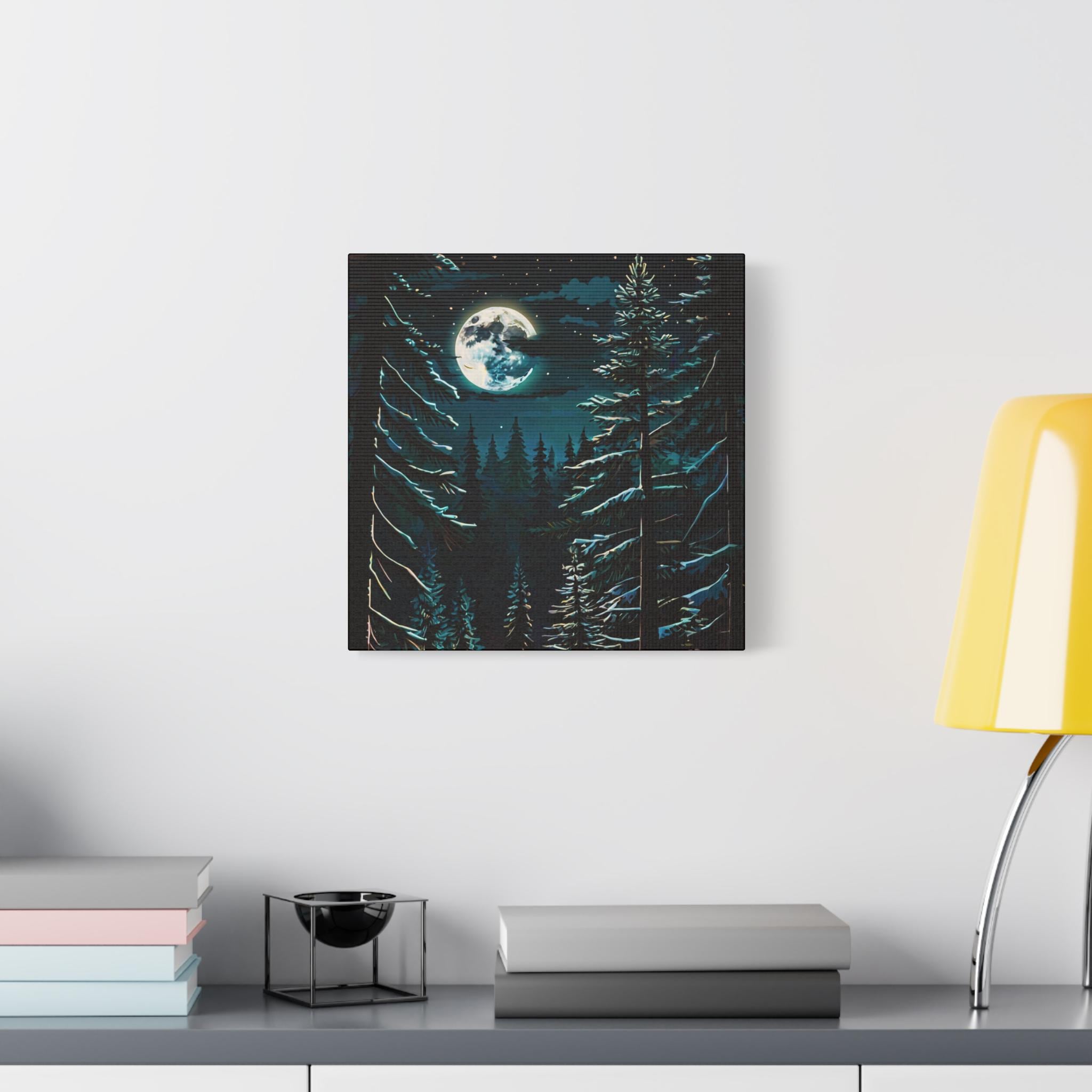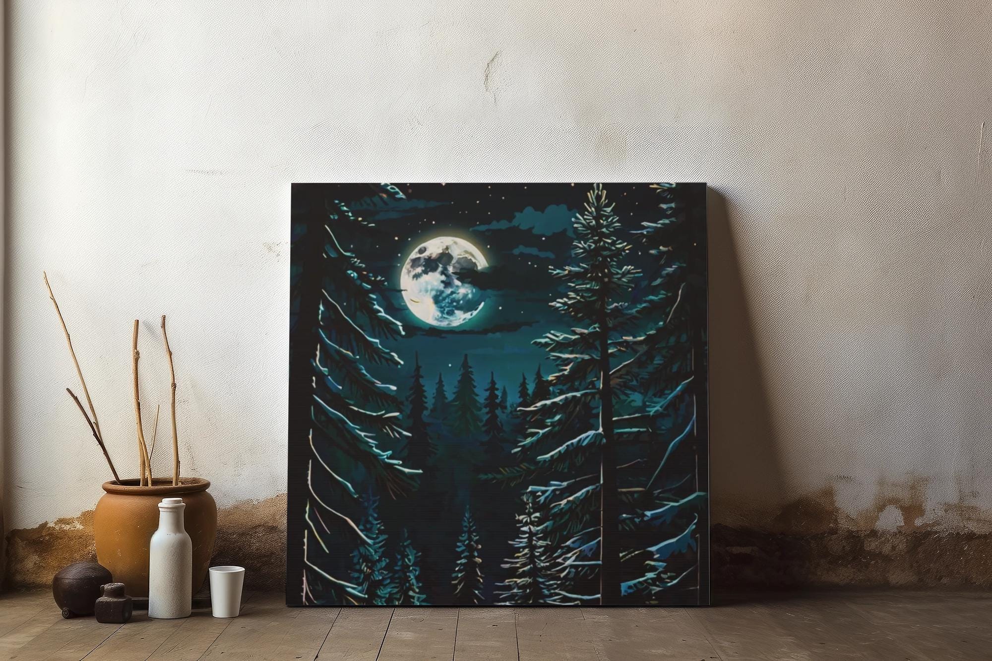 A matte stretched canvas that brings a quiet, moonlit pine forest into your space. Deep teal nights and soft moon glow are rendered with Greenguard Gold latex inks for rich, long-lasting color on a cotton-poly canvas. The subtly textured matte finish keeps reflections low and emphasizes painterly brushwork and shadowed details. Stretched over a renewable radiata pine frame and equipped with soft rubber dots and built-in hanging hardware, this piece arrives ready to float on your wall and anchor a cozy corner, cabin entryway, or night-themed gallery wall.