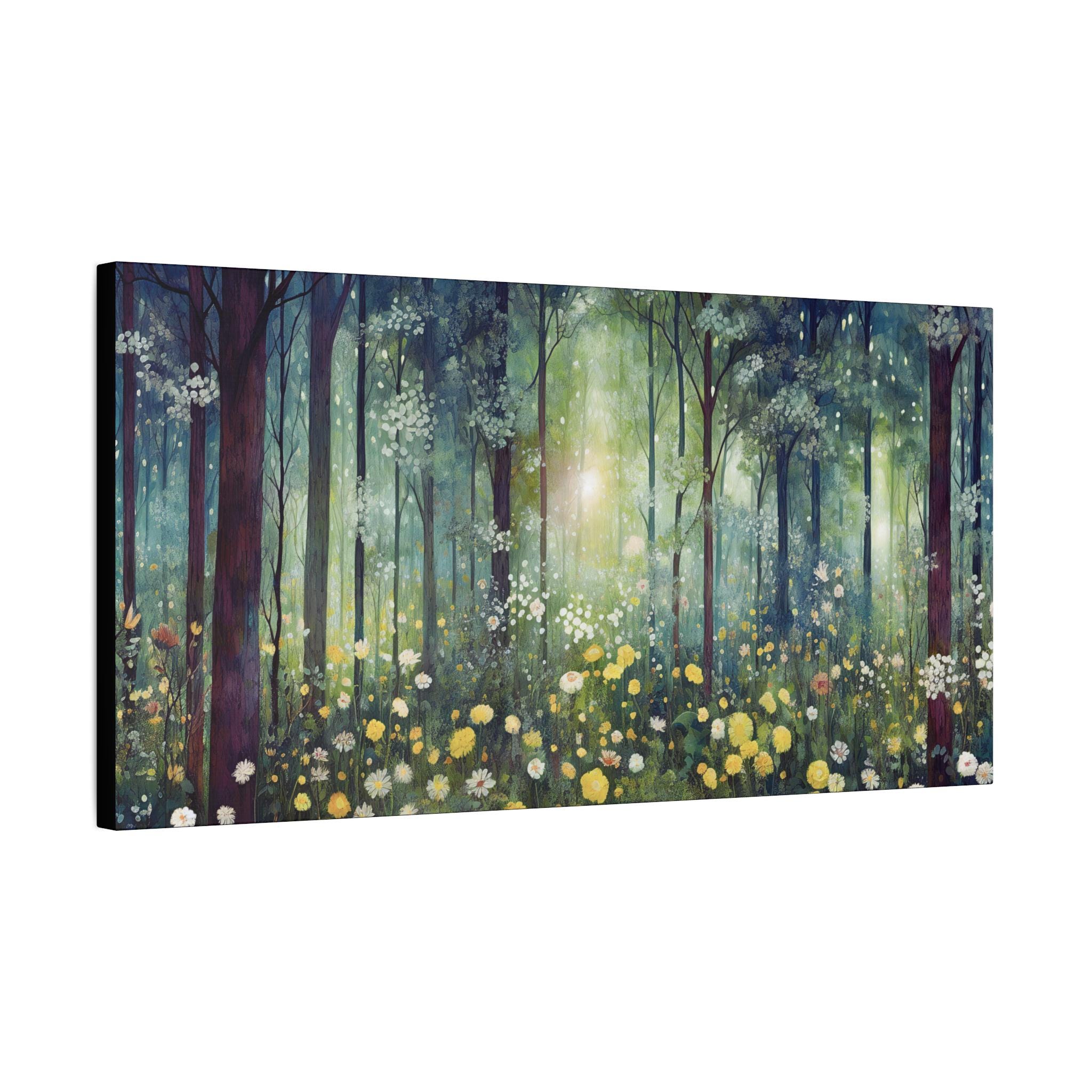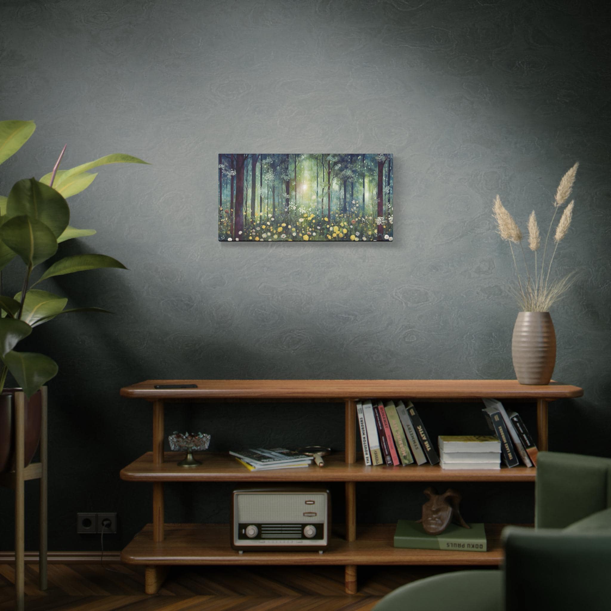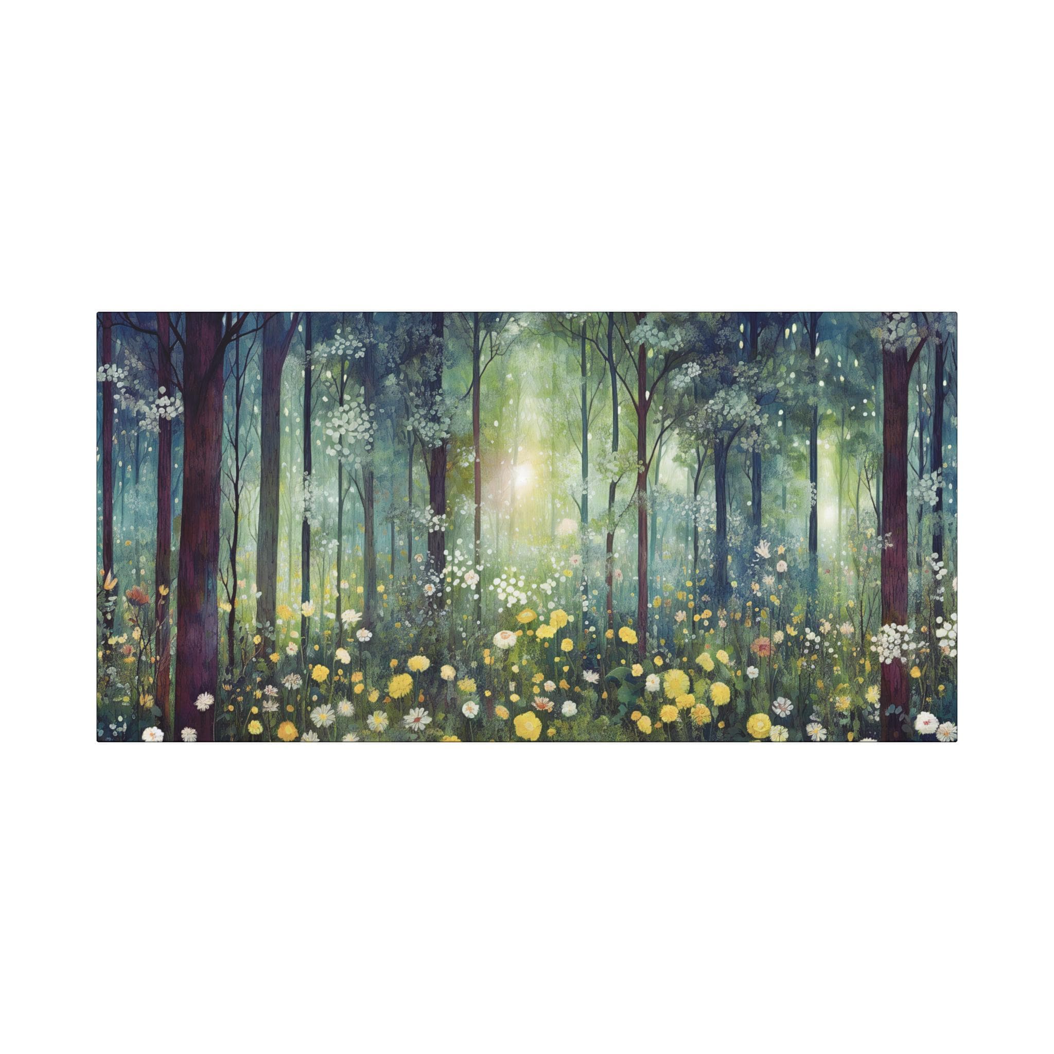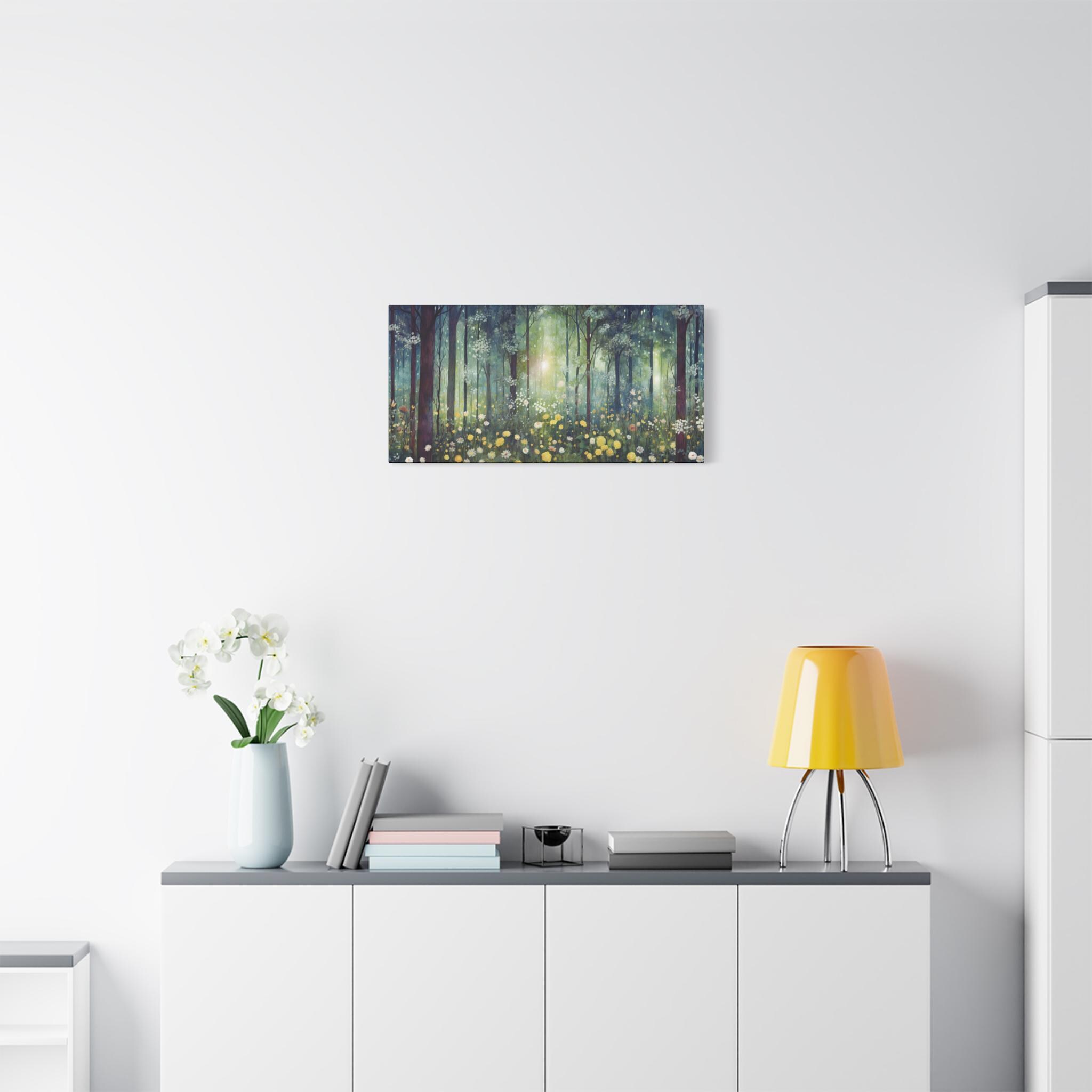 A stretched matte canvas that brings a soft, luminous woodland scene to your walls. Layers of misty greens and teal shadows drift between slender tree trunks, while delicate wildflowers and glowing orbs dot the forest floor. The image feels like a quiet moment at dawn—calm, slightly enchanted, and deeply restorative. The slim 1.25" profile and museum-style wrap let the artwork sit close to the wall, making it a subtle focal point in living rooms, bedrooms, or cozy reading nooks.