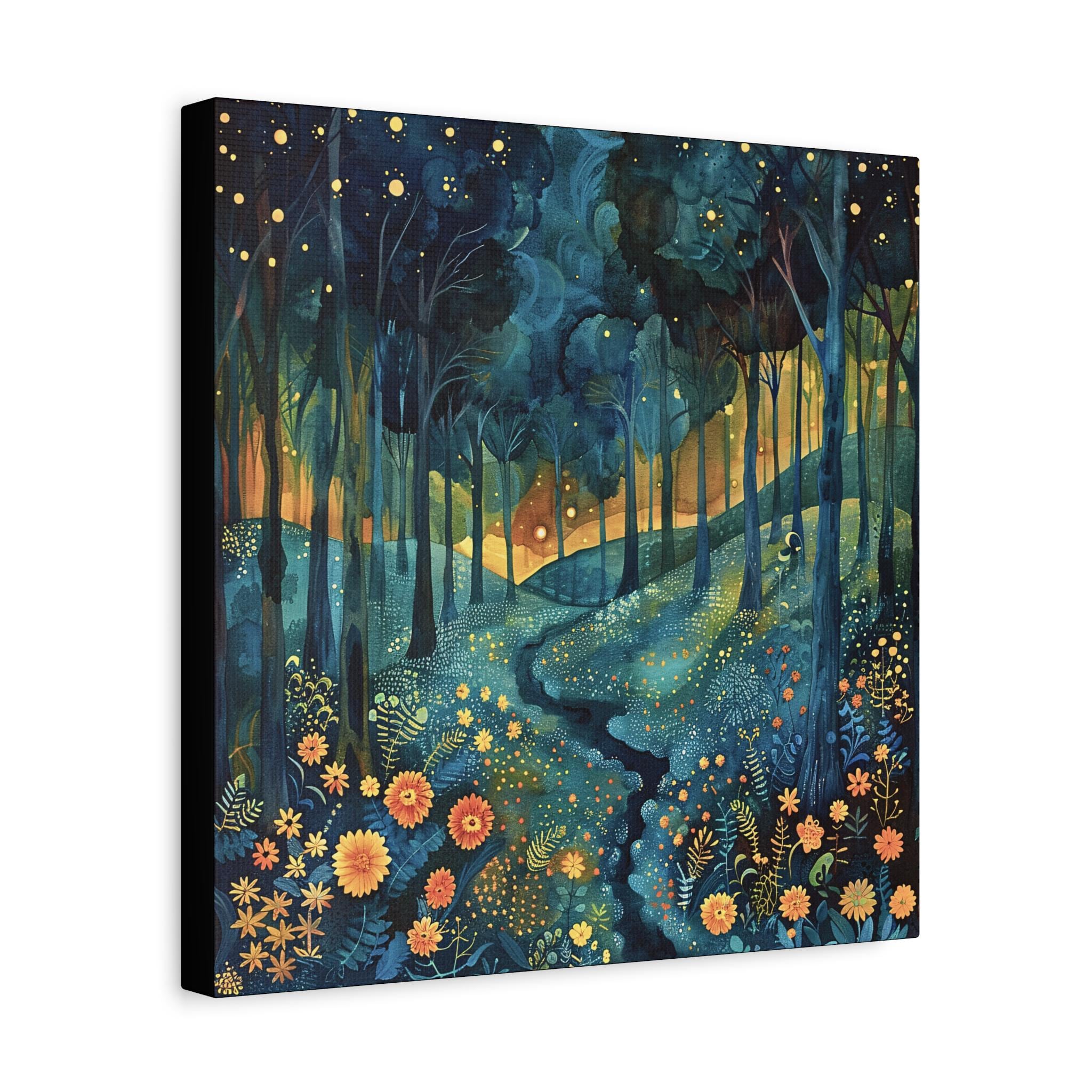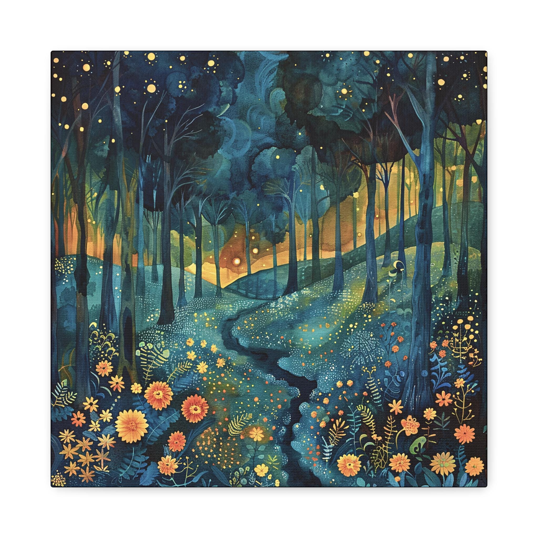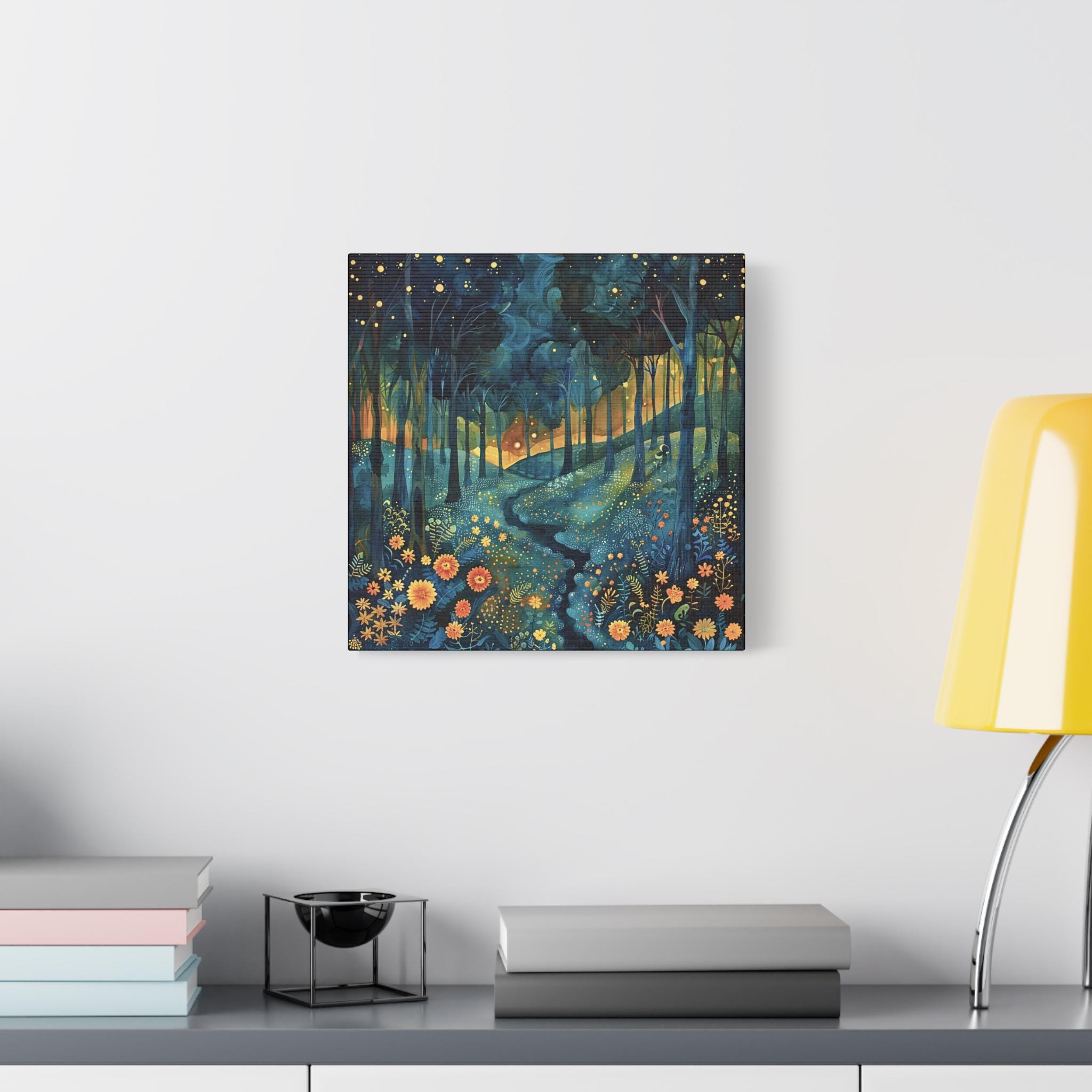 A stretched matte canvas that brings a quiet, star-lit forest into your living space. Deep teal trees and a winding stream pull the eye inward while warm golden blooms and specks of light add a gentle glow. The textured cotton-poly surface and unique coating keep colors rich and layered, so the mood of dusk reads vividly whether viewed up close or across a room. Lightweight yet sturdy, it arrives ready to hang and sits flush against the wall thanks to soft rubber dots that steady the bottom.