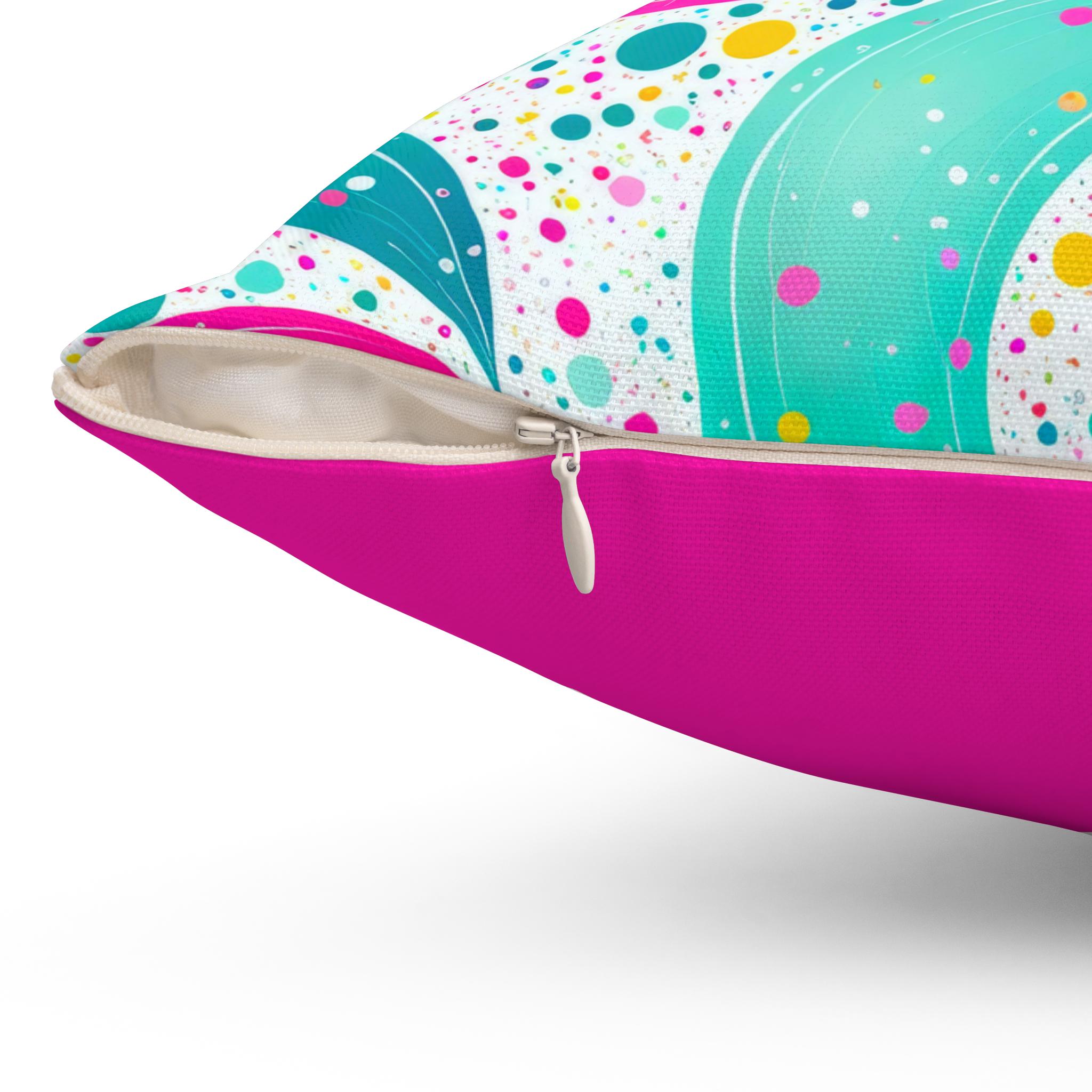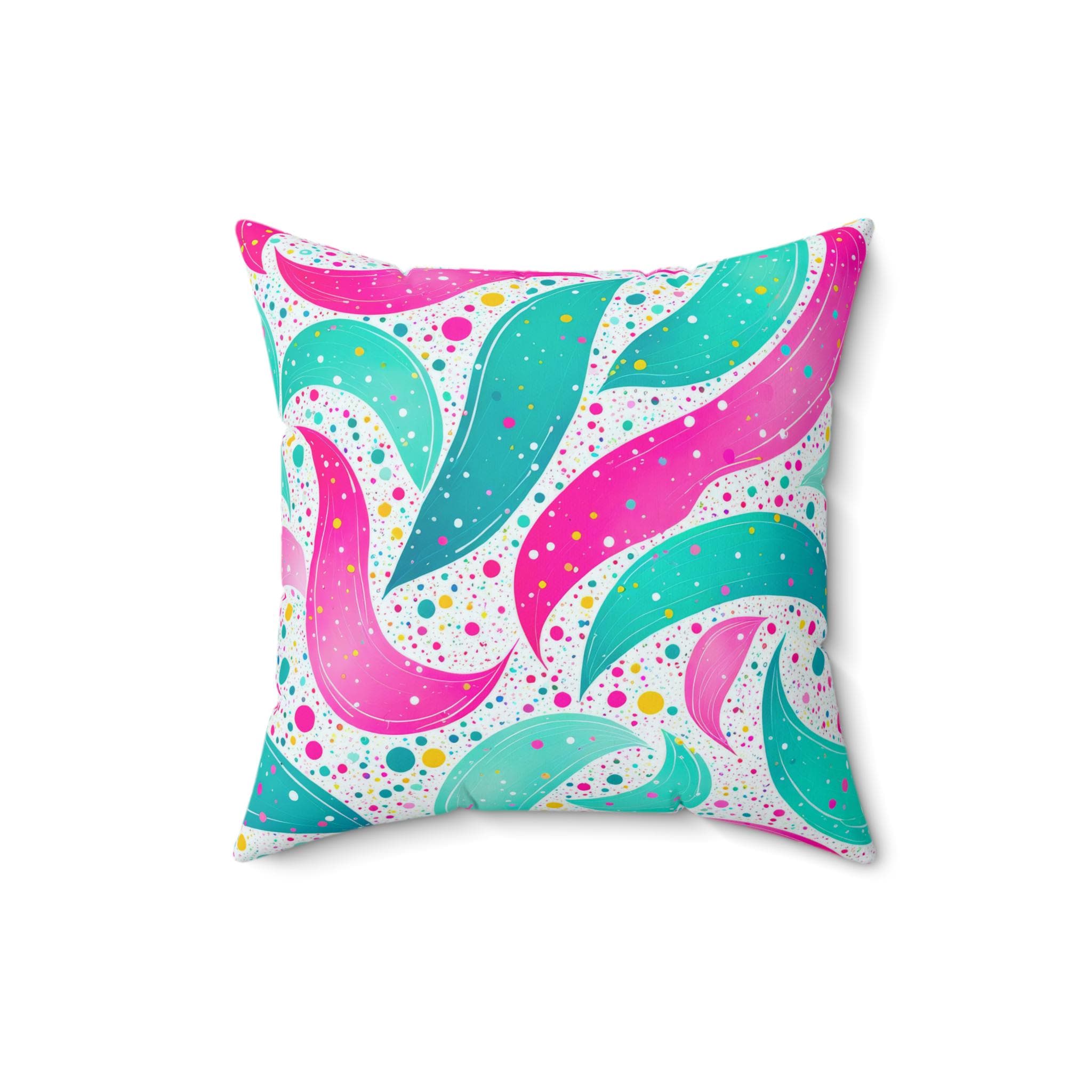 Bright, playful, and full of movement—this square pillow brings a splash of joy to any room. Swirling teals and hot pinks dance across both sides, dotted with confetti-like speckles for a modern, energetic vibe. The spun polyester cover keeps the print crisp and wrinkle-free, while the recycled polyester insert arrives slightly oversized, so the finished pillow feels plush and full once assembled. Tuck it on a couch, layer it on a bed, or use it as a colorful accent in a creative studio to lift the mood and anchor a lively palette.