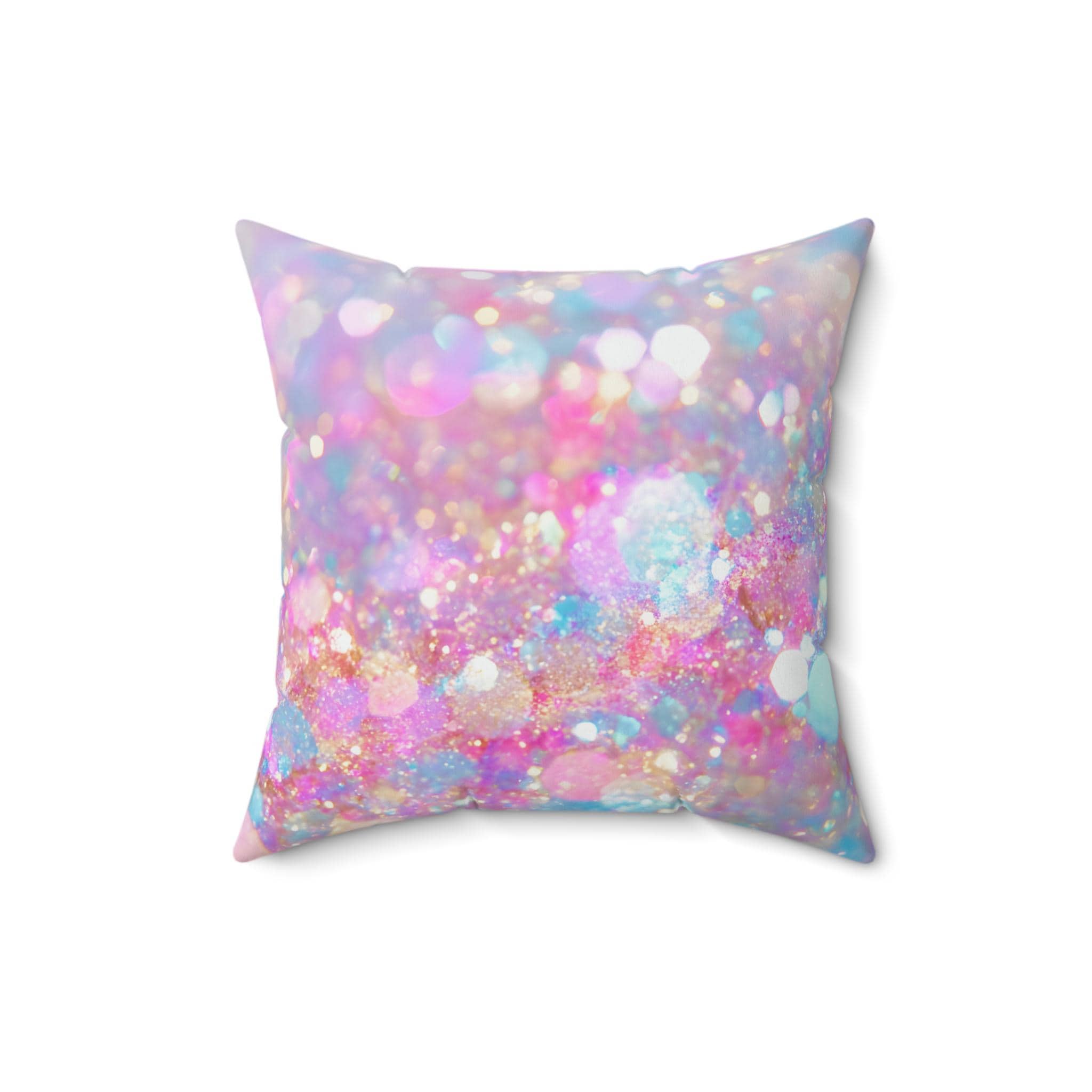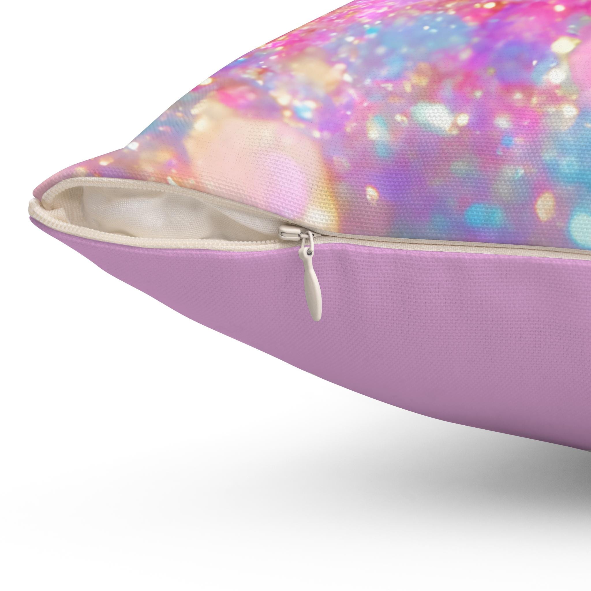A dreamy square throw pillow that brings soft, glittering color to a cozy corner. The double-sided spun polyester cover holds vibrant, high-resolution art on the front — a pastel mosaic of pinks, lavenders, and speckled shimmer — while the reverse shows a calming solid blush. The concealed beige zipper keeps the silhouette clean, and the recycled polyester insert ships vacuum-packed so you assemble it at home for extra loft. It’s the kind of accent that brightens a reading nook, anchors a girly-boho sofa, or layers into a whimsical bedroom for added texture and warmth.