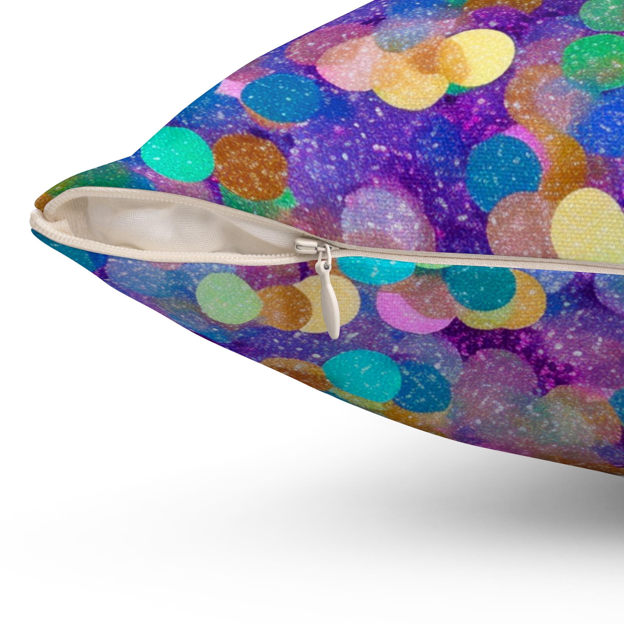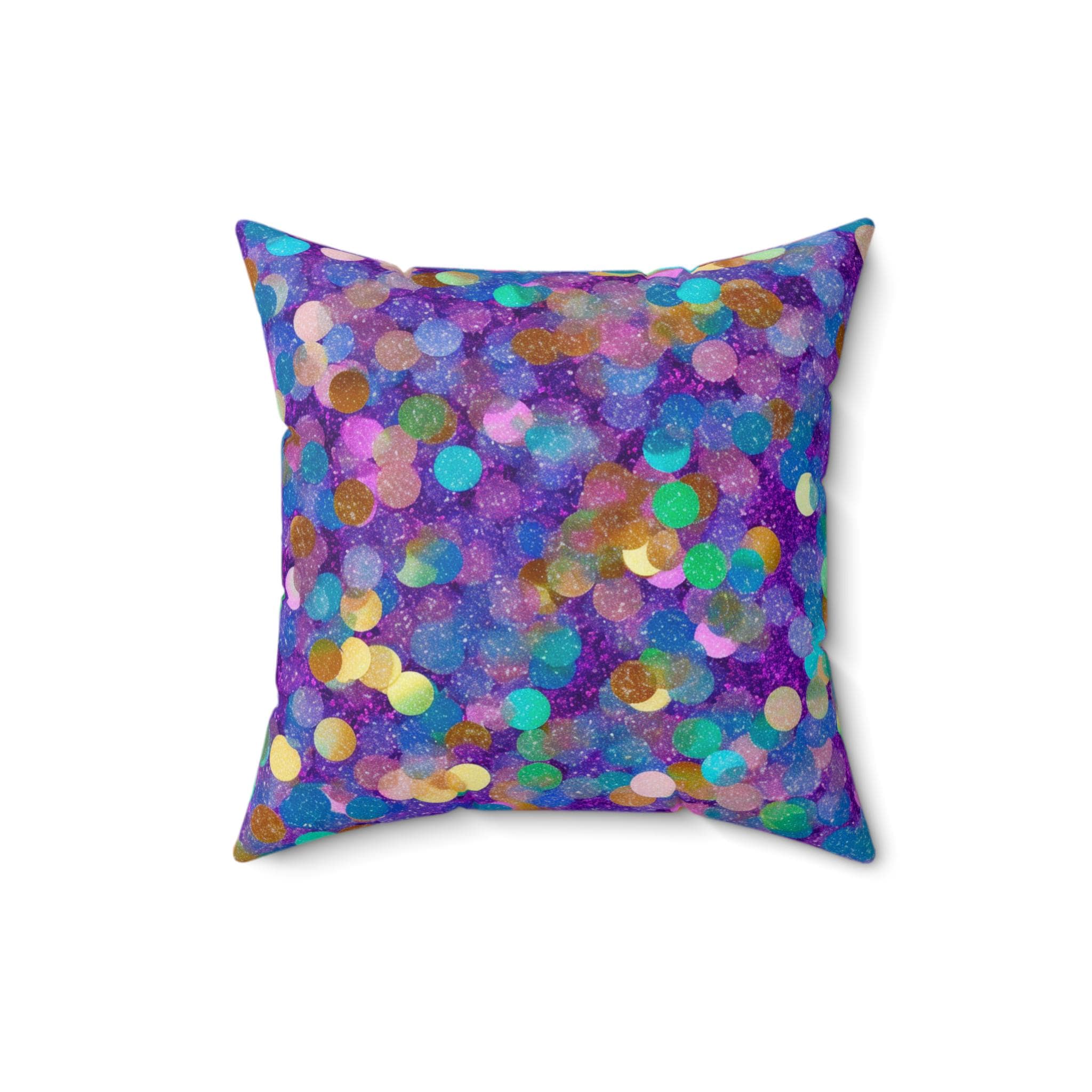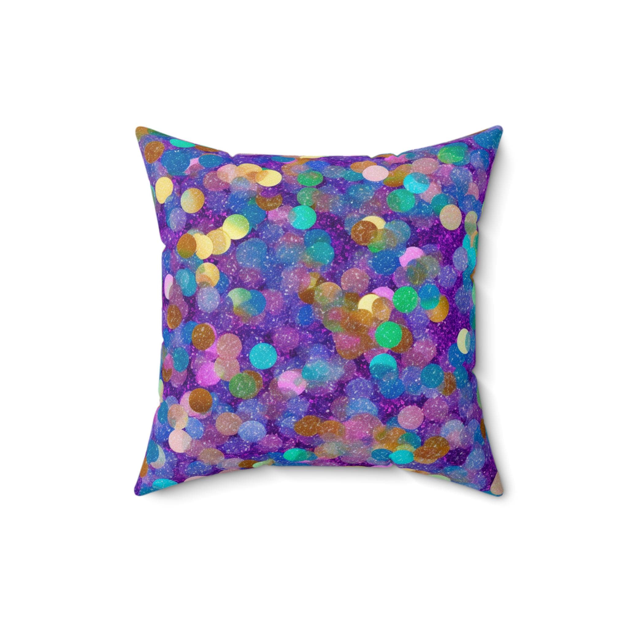Bright, joyful, and full of playful texture — this square pillow brings a burst of confetti-like color to any room. Layers of iridescent dots in teal, gold, pink and violet sit on a deep purple ground, creating a lively shimmer that reads like celebration and quiet wonder at once. The double-sided print keeps the look consistent from every angle while the concealed zipper preserves a clean silhouette. Slip the recycled polyester insert inside to achieve a plush, voluminous finish that invites sinking in. Use it to lift a sofa, add personality to a reading nook, or scatter a few on a bed to turn ordinary evenings into small, colorful moments.